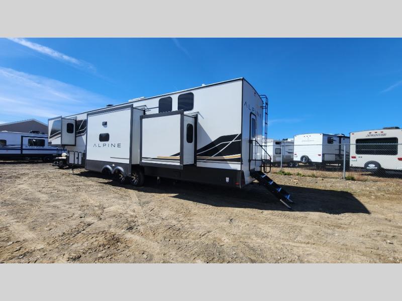 Luxury is not an option, it is a standard with each one of these Keystone RV Alpine fifth wheels! A 8' 4" wide body construction will create an open, residential feeling, and cutting-edge technology will provide a hassle-free camping experience. The Tru-Fit slide construction is more durable and minimizes motor structural stress, as well as resists leaking, and the Blade Pure airflow system provides residential comfort with its high-performance. Each fifth wheel includes designer flooring throughout, stunning solid wood cabinet doors, luxurious crown molding, and solid surface countertops in the kitchen. The SolarFlex Protect 200 comes standard or you can choose the optional SolarFlex Discover 440i for even more off-grid capabilities. The exterior also includes an outside shower with hot and cold water, Lippert strut assisted SolidSteps, Hitch Vision with LED lighting, and many more conveniences!