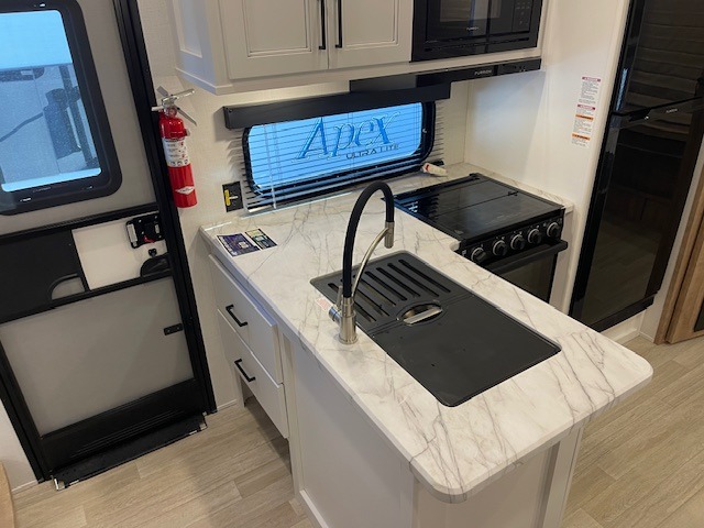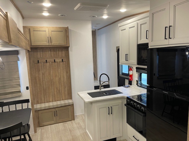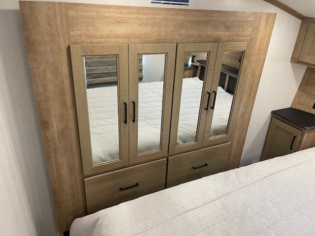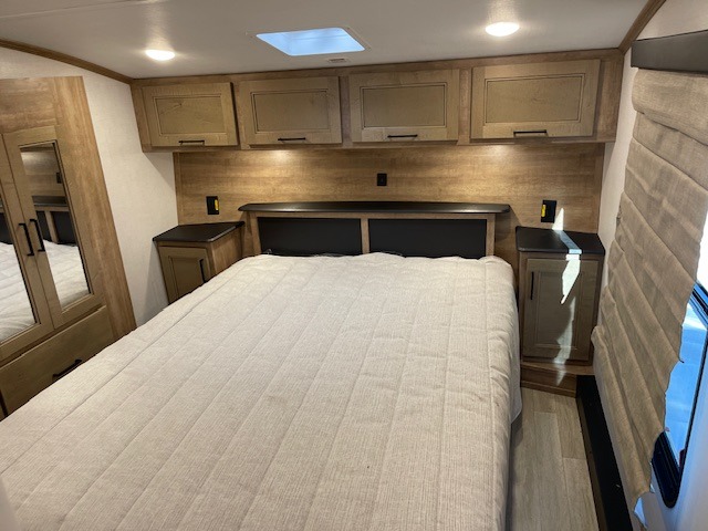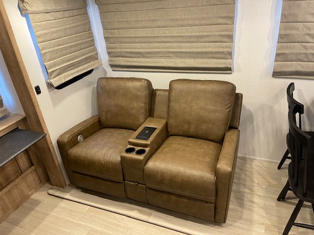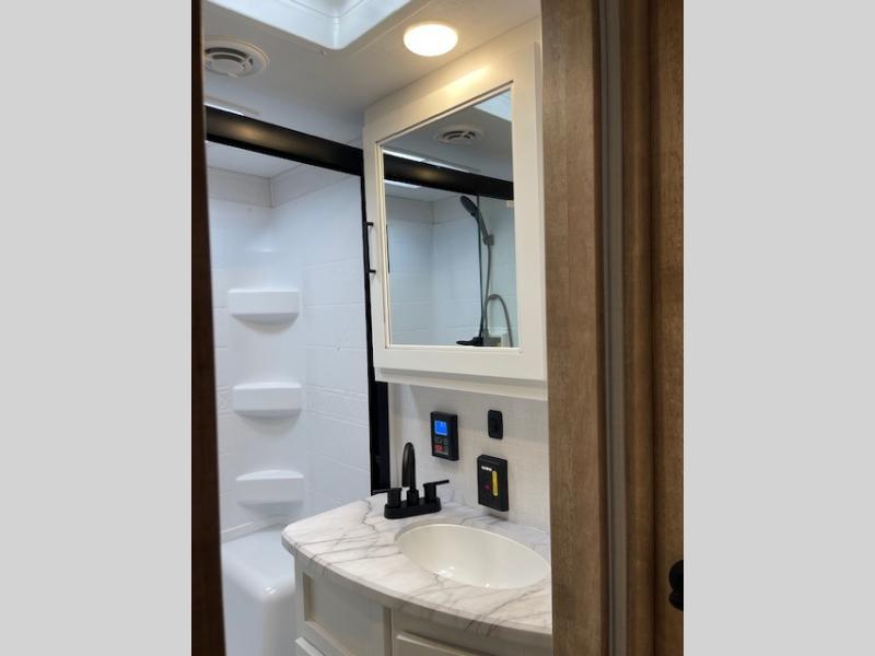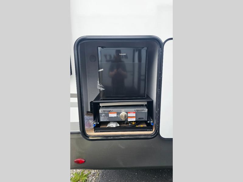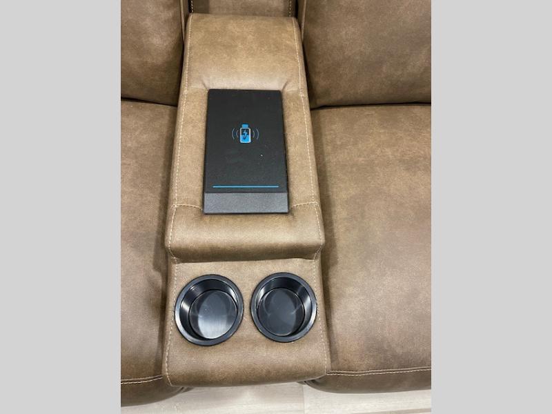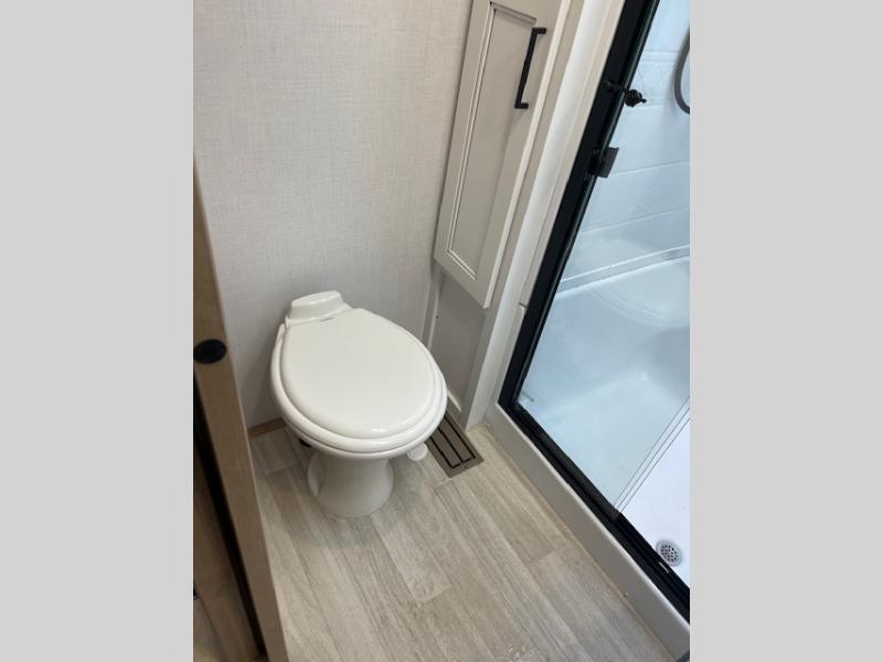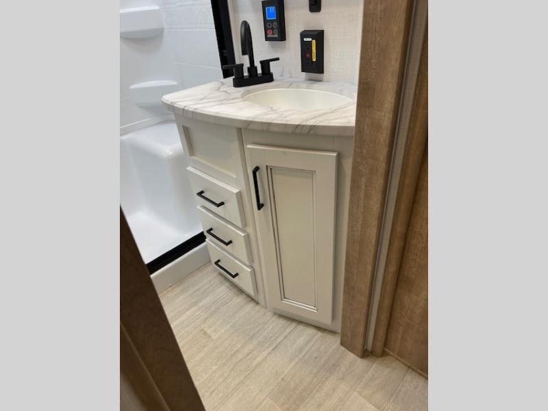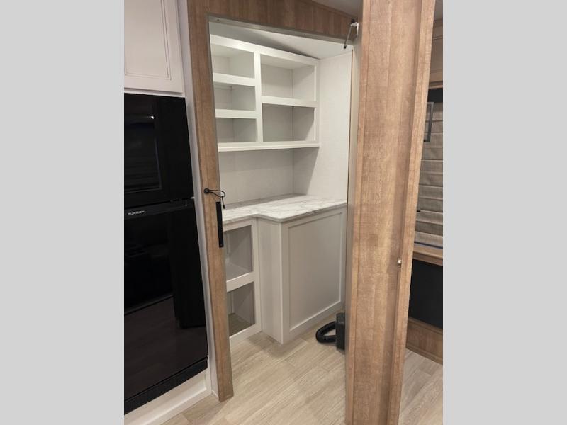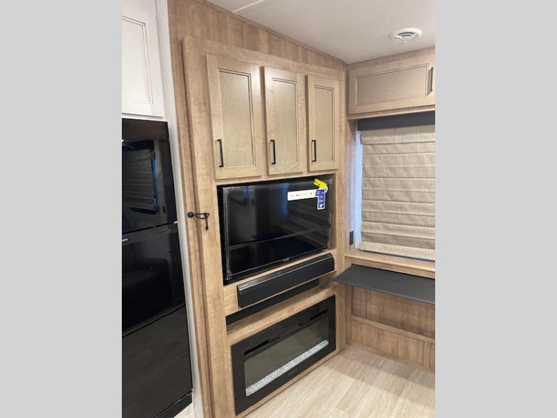 This fifth wheel has some really great features that you are sure to love! The Grill-N-Chill outdoor kitchen lets you cook outside when the weather is nice, and the interior kitchen will be perfect for rainy days. On the inside, a large slide in the combined kitchen and living space provides plenty of space. You will enjoy the booth dinette, but can also opt for a free standing dinette if you prefer. Theater seating in the middle is a handy feature, plus opposite the theater seating you will find an entertainment center with fireplace below and storage up above. There is also a hidden walk-in pantry behind the entertainment center to keep food out of the way. Along the rear wall, a flip-up desk will let you get some work done! Up front, there is a private bedroom with slide out wardrobe for added space, plus a queen bed with dual nightstands for your things. The bathroom features a 48" x 30" shower, plus linen cabinet, vanity with overhead medicine cabinet, and toilet.