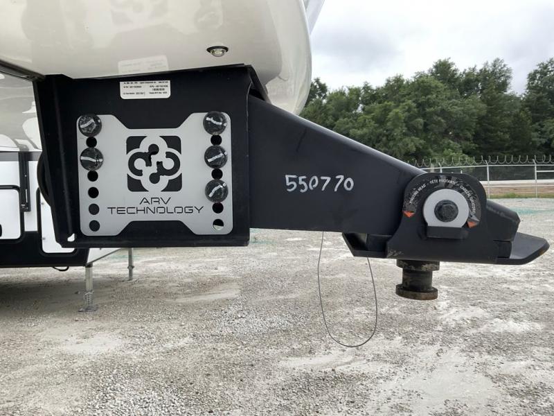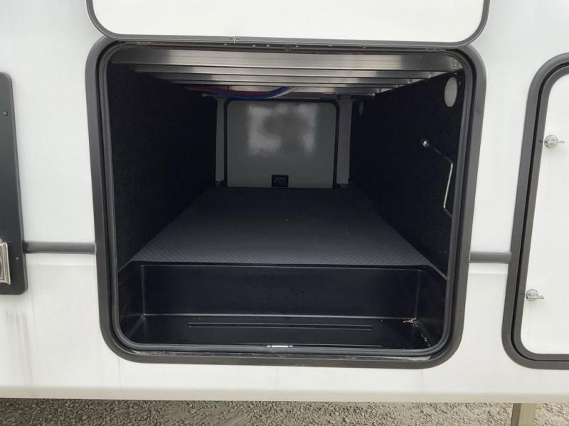 Your whole crew will love this lightweight fifth wheel that includes a rear private bunkhouse with 48" x 76" bunks for your guests and their own closet to store clothes. The front private bedroom includes a queen bed, dual nightstands, plus a wardrobe slide to keep everything tidy. Everyone can meet in the main living area with a large slide out, a booth dinette, and a theater seating across from the fireplace and hinged entertainment center. You'll also find the walk-in pantry behind the entertainment center for clever storage space. Meals can be prepared on the 21" Furrion range or in the microwave oven, and the 10 cu. ft. 12V "Solar Friendly" refrigerator will be perfect for perishables. There is also a Grill-N-Chill outside kitchen the chef of your group is sure to love!