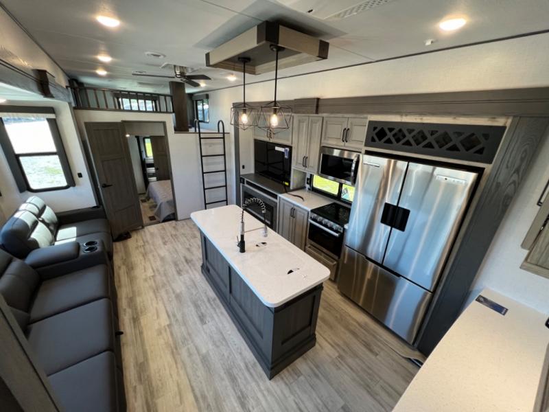 The main living area is enhanced with dual opposing slides, theater seating, a free-standing dinette, a fireplace, and a center island. The wide-body construction, Polar Pack All Season Protection, and in-floor heating ducts make this fifth wheel suitable for year-round travel. The interior is designed with hardwood slide-out fascia, wood accents, and modern decor options. Additional features include Tru-Fit slide construction, 4G LTE and Wi-Fi prep, and more, ensuring a luxurious and comfortable camping experience.