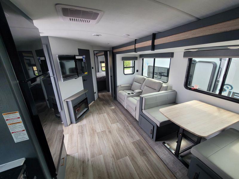It won't be hard to feel right at home in this dual entry, front kitchen travel trailer! You will be impressed by the amount of counter space you have, along with a two kitchen pantries, a three burner range, and a 12V refrigerator. A Do-More dinette table and tri-fold sofa sit within a slide for more space, and the entertainment center with a fireplace is in great viewing for movie night. This model includes a dual entry bath with quick and easy access into the rear master bedroom, complete with a king bed slide out and a large wardrobe!