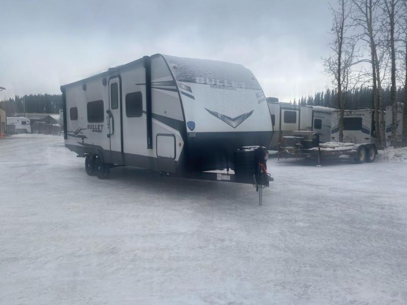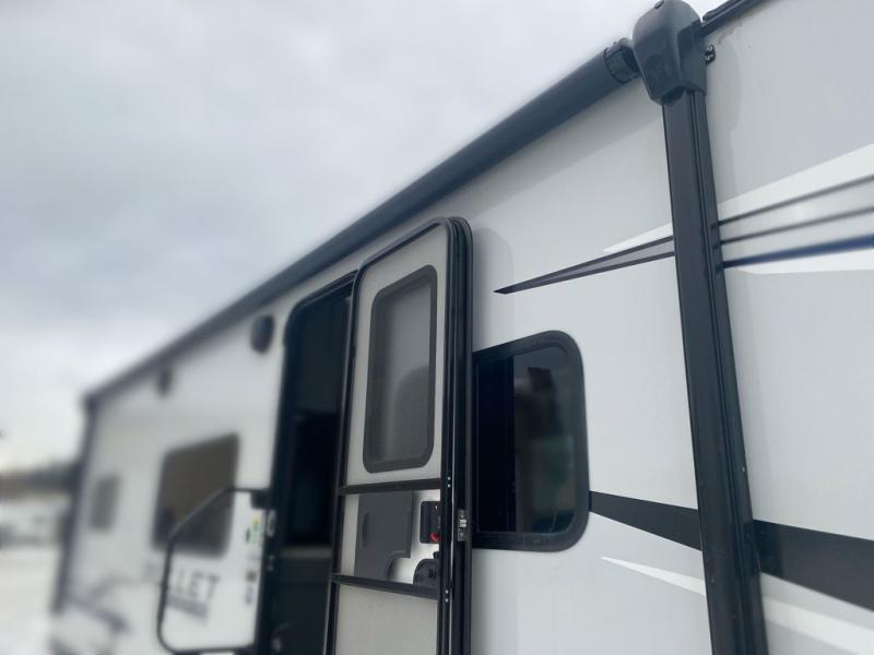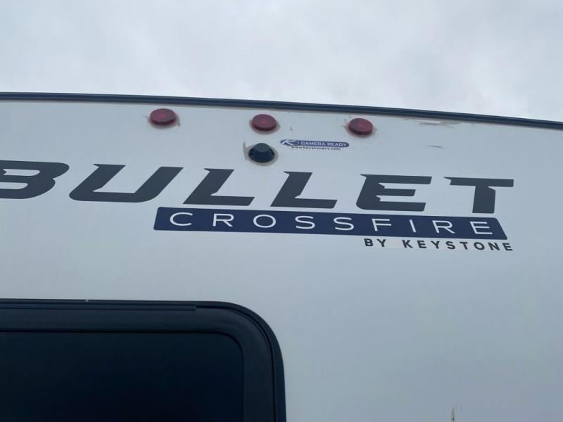 Each Bullet Crossfire Double Axle travel trailer by Keystone is constructed with a NORCO HSLA steel/automotive deposition coated frame assembled with huck bolts for durability. The TORFLEX rubber torsion suspension will provide smooth towing, and the one-piece ABS enclosed underbelly will help extend your camping season. Setting up your trailer will be a breeze with the electric tongue jack and four electric stabilizer jacks, and there is an electric awning with adjustable arms and LED lighting for an inviting outdoor living space. The affordable, high-quality RV solar energy system, SolarFlex Protect 220 comes standard with each model and will allow you to go off-grid when you want, or you can choose the optional SolarFlex Discover 440i for even more off-grid capabilities. Inside, you'll find fabric night shades, Beauflor woven flooring in the slides, full depth cabinets with full extension drawer guides, and many more comforts.