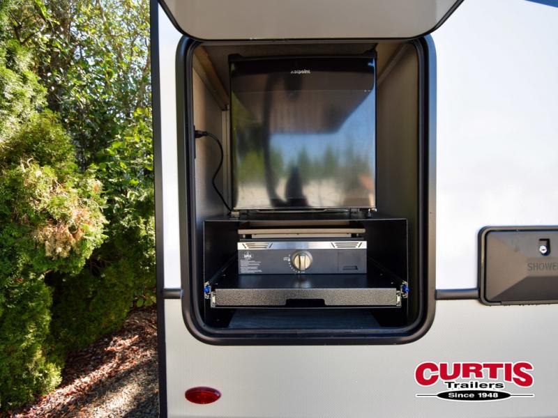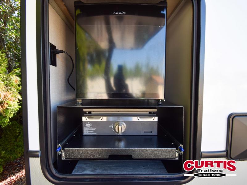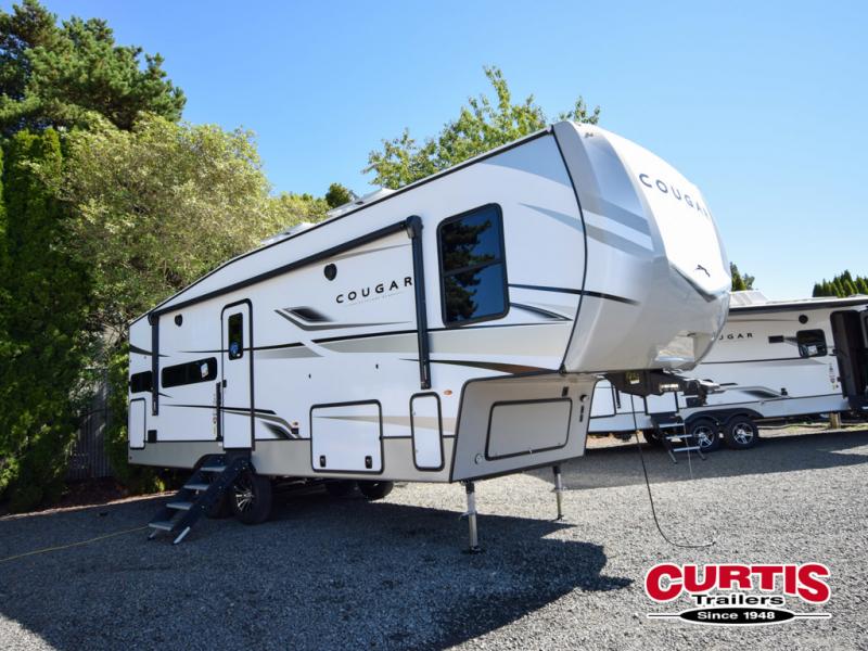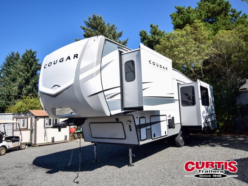 This fifth wheel is packed with premium features you won't want to camp without. You'll feel at home in the front private bedroom with its queen bed slide out with storage underneath, full-height wardrobe, plus a wardrobe with washer and dryer prep. There is even dresser with a sliding top with hidden storage for your valuables. If you have any guests, they can sleep on the tri-fold sleeper sofa within the living room slide, and there is a fireplace and LED HDTV here in perfect view for movie nights. This Cougar fifth wheel features a rear kitchen with tons of counter space, a convenient pull out trash can, and a high-rise chef's faucet and sprayer. The pull-out table in front of the fireplace will provide a place to dine at, or you can sit outdoors under the 20' power awning, and you'll also find an outside kitchen here the chef of your group is sure to love!