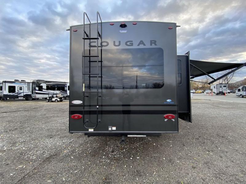 Spend more time having fun and less time worrying about your RV with the Keystone Cougar fifth wheel! These units have all that you will need for excellent vacations. The interior comes with 5/8" one-piece DynaSpan® flooring, tall slide outs for added comfort and head room, night roller shades throughout, and residential, raised-panel hardwood cabinet doors and drawers. You will also enjoy decorative crown molding, a 5,500 BTU electric fireplace with thermostat control and remote, and a Max Air exhaust fan with rain sensor. The exterior is also fully outfitted with a convenience center, friction-hinge entry door, electric four-point auto leveling system, and Lippert SolidStep® on the main entry. There is a full pass-through storage with slam-latch baggage doors, an industry-best 80-gallon fresh tank capacity, a 2" accessory hitch with 300-LB storage capacity, and an outside shower.