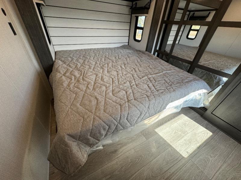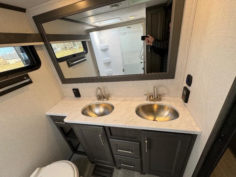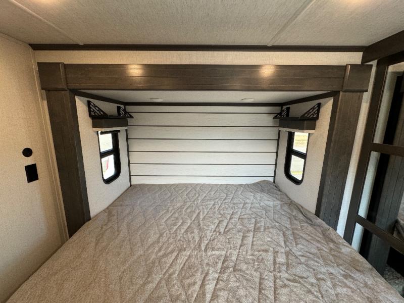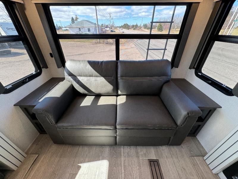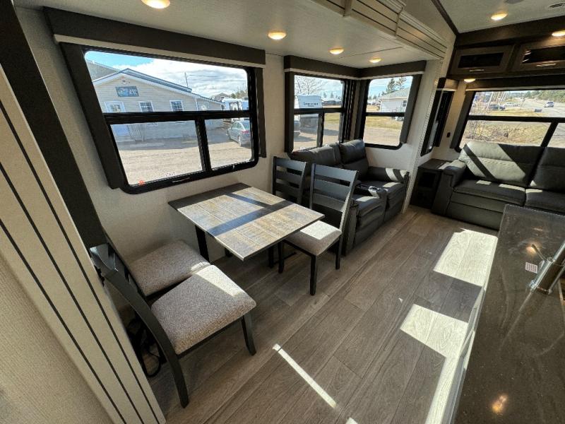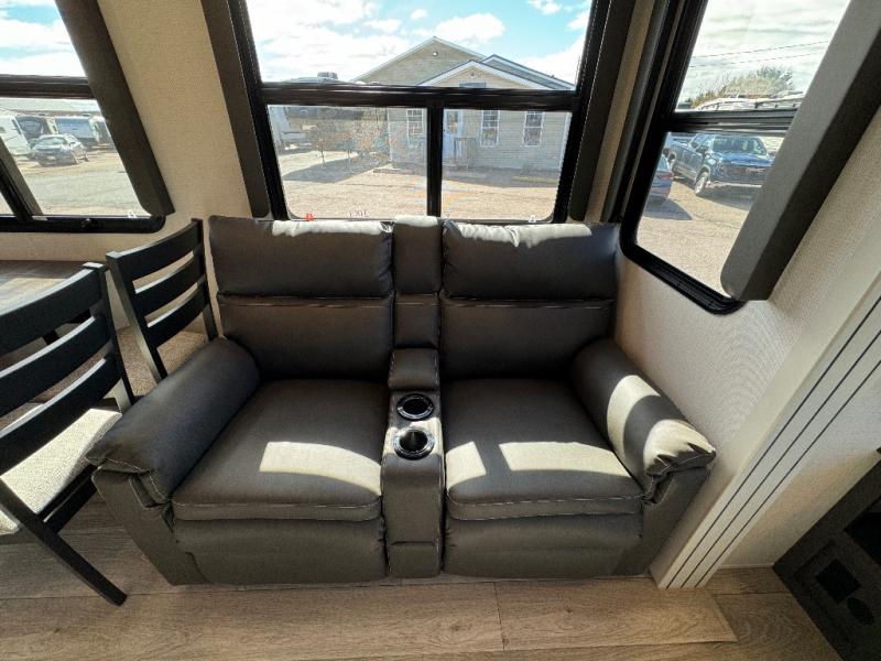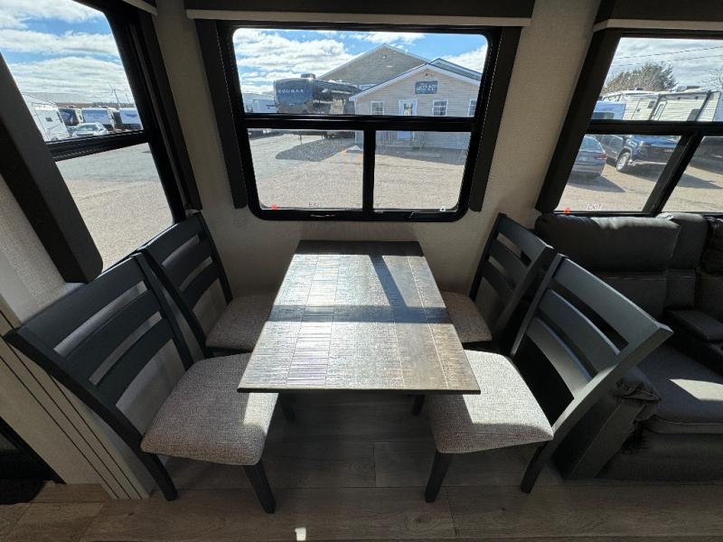 The dual-sink vanity in the full bathroom on this Cougar fifth wheel is what will make your morning routine feel just the same on the road as it does at home! You'll also sleep just as well on the queen-size bed in the front private bedroom, and there is under-bed storage, a full-height wardrobe, and a dresser for all of your personal belongings. As you spend time in the main living area, you'll appreciate having extra space thanks to the set of opposing slides, and the kitchen island will be easy to work around. You'll be able to relax on the tri-fold sleeper sofa and theater seating while you watch the LED HDTV, and the booth dinette is another seating location that can be used for meal time or game nights.