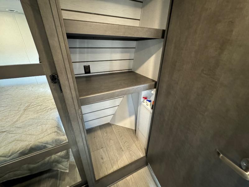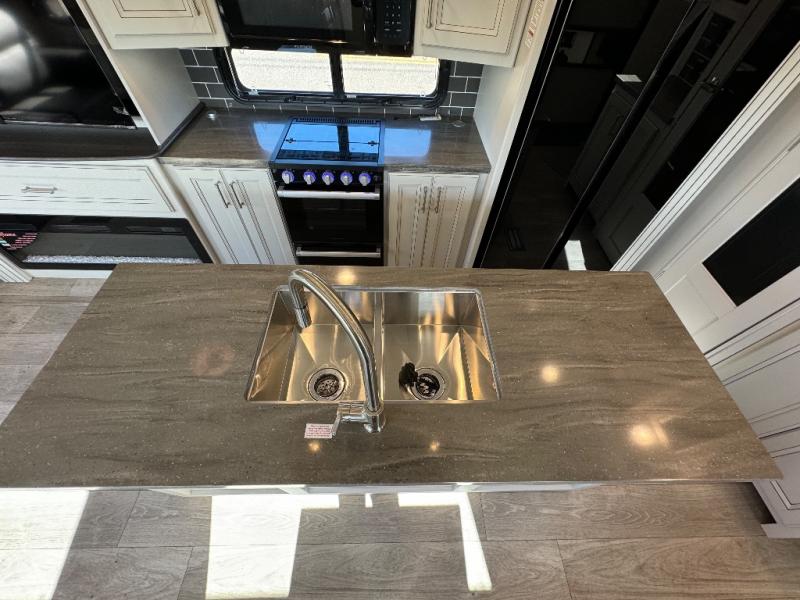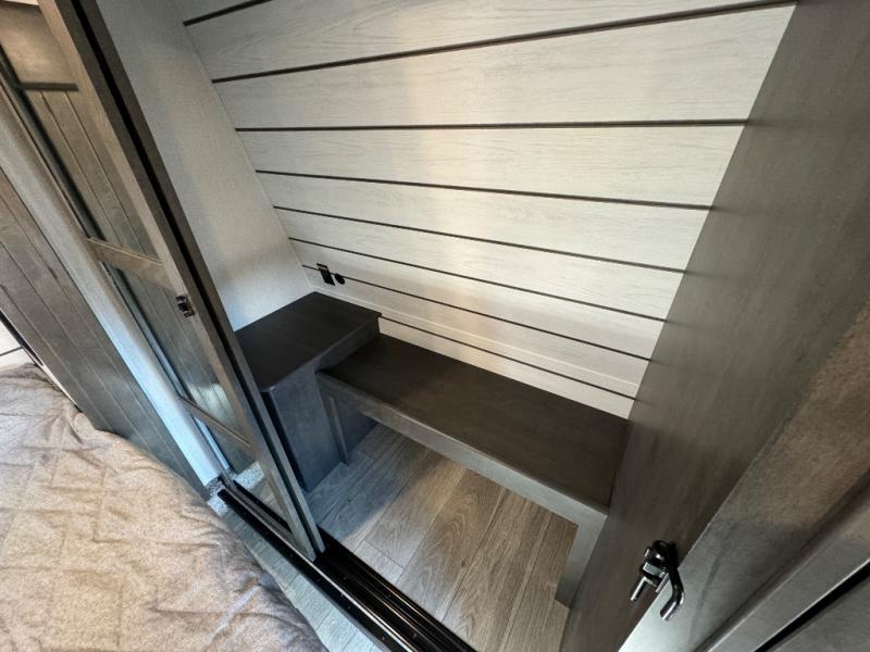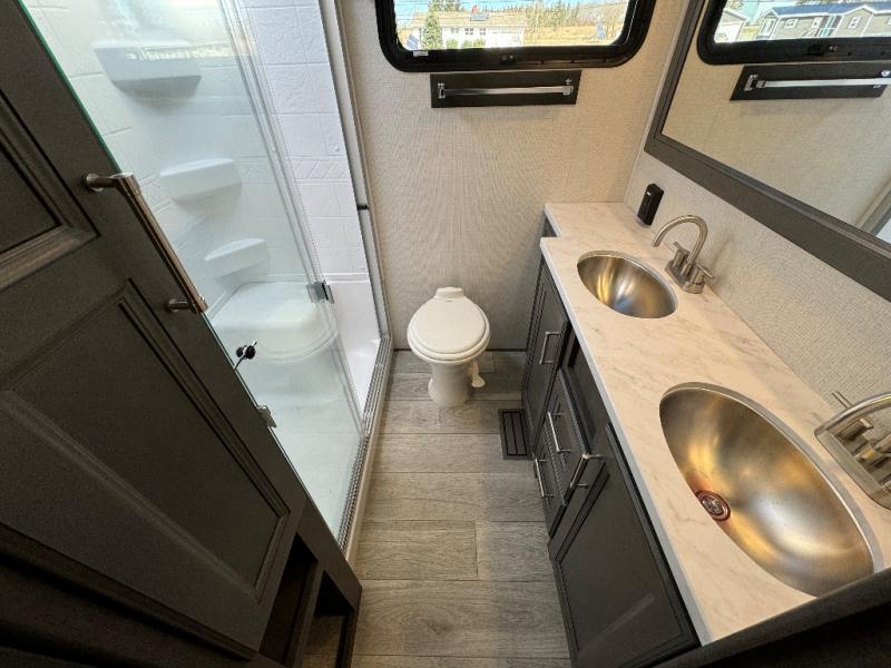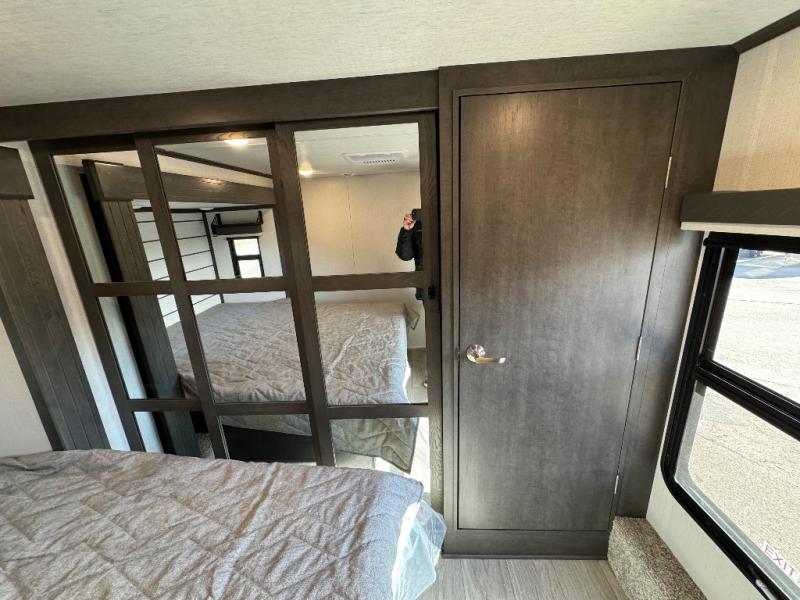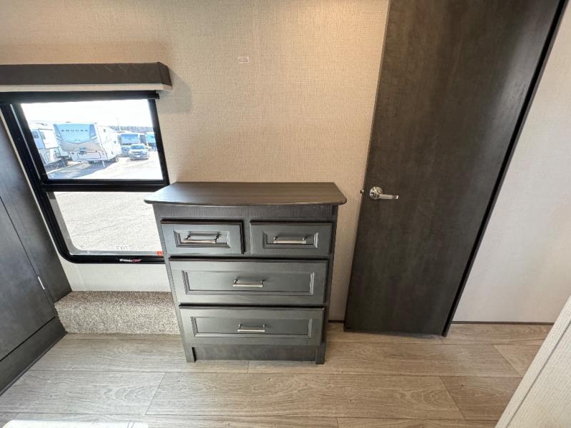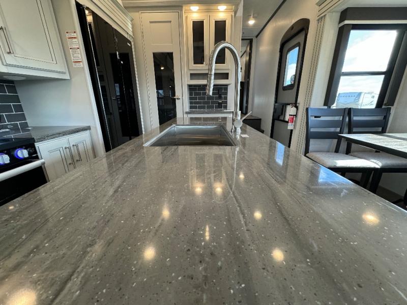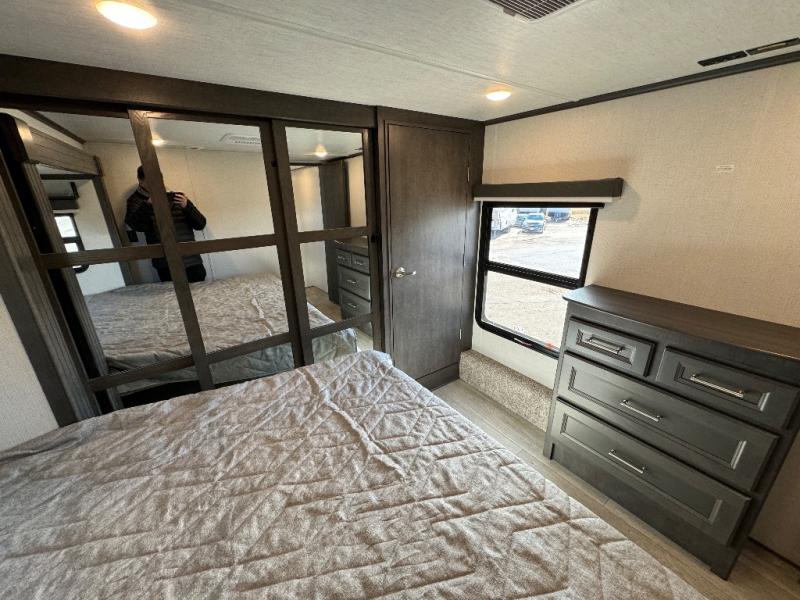 The dual-sink vanity in the full bathroom on this Cougar fifth wheel is what will make your morning routine feel just the same on the road as it does at home! You'll also sleep just as well on the queen-size bed in the front private bedroom, and there is under-bed storage, a full-height wardrobe, and a dresser for all of your personal belongings. As you spend time in the main living area, you'll appreciate having extra space thanks to the set of opposing slides, and the kitchen island will be easy to work around. You'll be able to relax on the tri-fold sleeper sofa and theater seating while you watch the LED HDTV, and the booth dinette is another seating location that can be used for meal time or game nights.