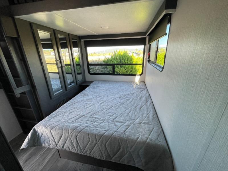 You'll want to pounce on this Cougar fifth wheel because of its amazing sleeping accommodations! Not only is there a master suite up front, but there is also a bedroom suite in the back. This rear suite has a 54" x 74" bed with a 54" x 74" loft bed above it. Plus, the second exterior entry door leads into the half bathroom, so you can exit the fifth wheel from this rear bedroom too. When you do exit, you'll be right next to the outdoor kitchen with a griddle and mini refrigerator, and the two 12' power awnings will protect you while you're outside. A 68" tri-fold sleeper sofa adds more sleeping space, and it also gives you a comfortable place to watch the LED HDTV at night. A kitchen island will be helpful to use while you're cooking, and the 16 cu. ft. 12V refrigerator will hold perishables for the whole week!