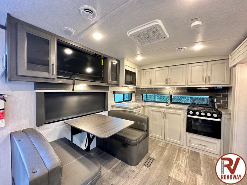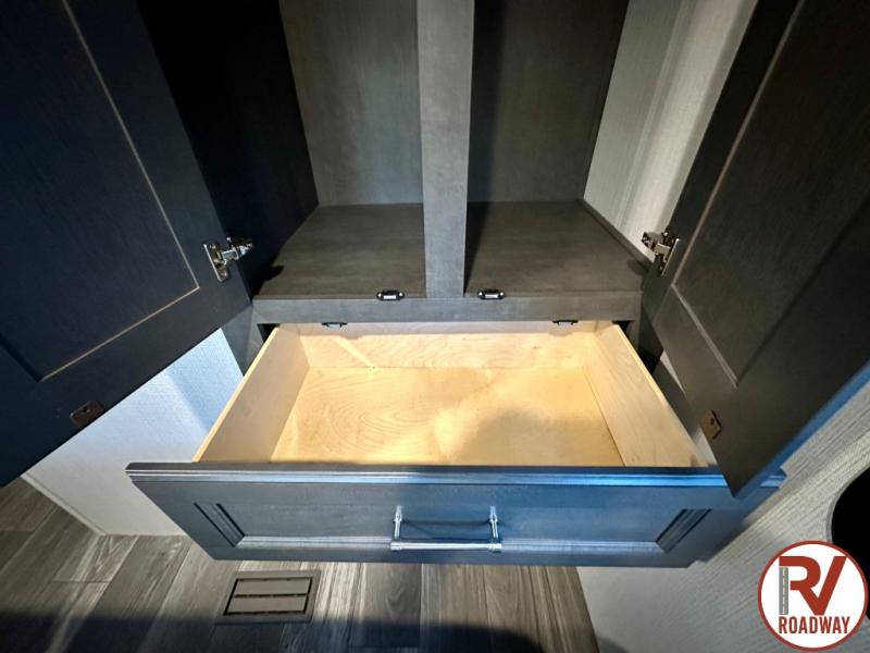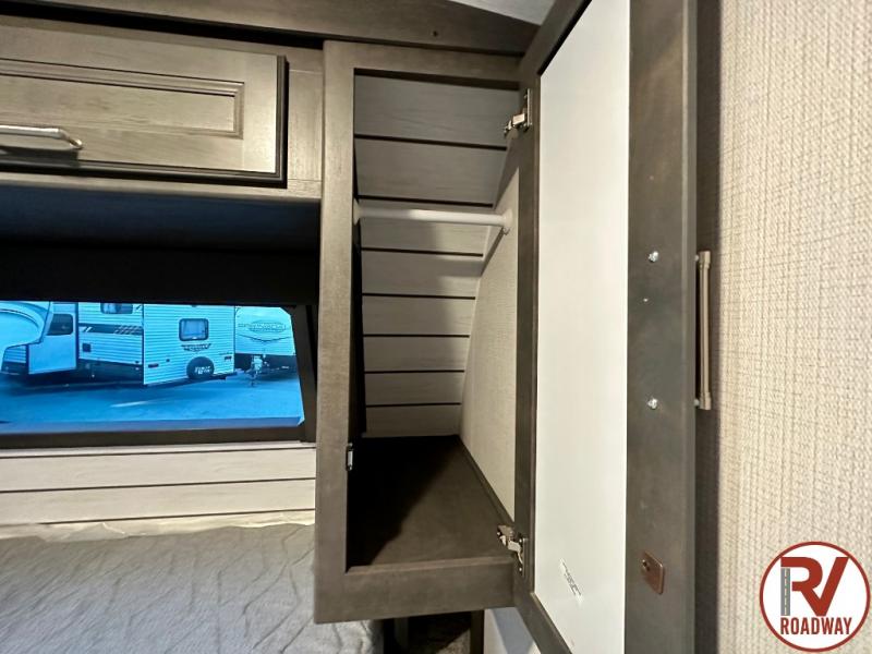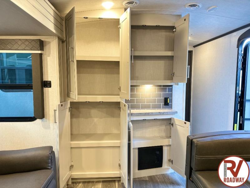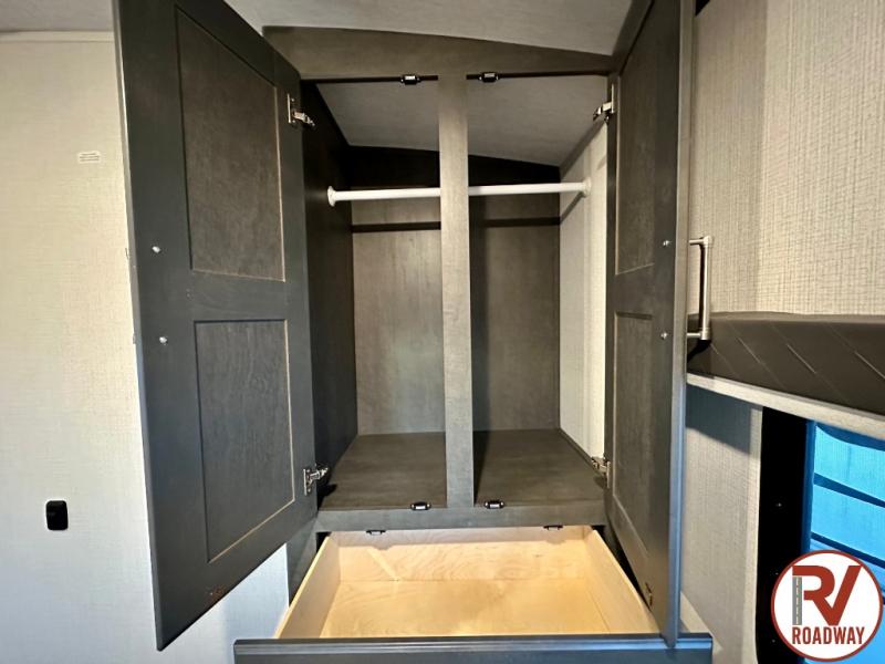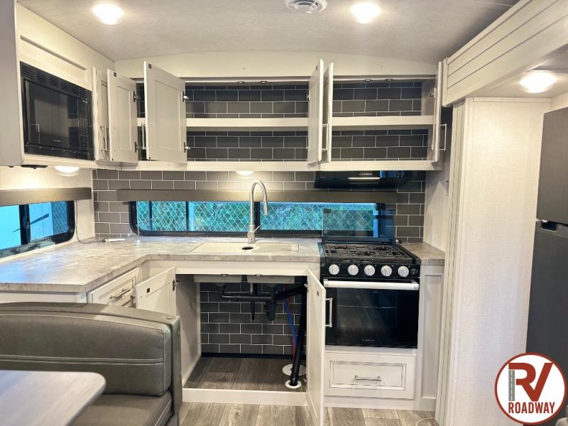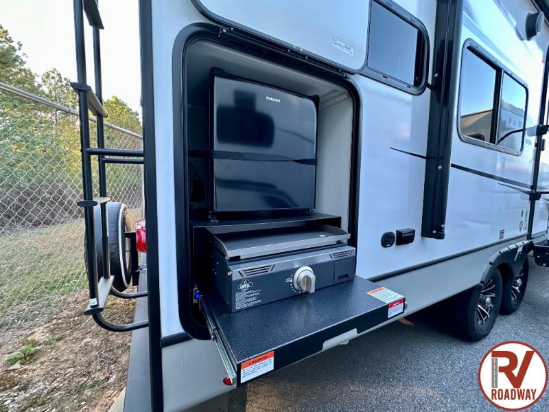If you're ready for fun summers at the lake, make your adventures complete with this travel trailer in tow. The rear kitchen includes ample counter space to prep burgers, and you can take your preparations outside to cook on the outdoor kitchen! If the weather is nice, you might just want to eat outside too under the 18' power awning, or dine inside at the booth dinette. There is also a tri-fold sleeper sofa within the large slide out and an LED HDTV for movie nights. You'll find plenty of storage throughout, including a kitchen pantry, overhead cabinets, plus dual bedroom wardrobes on either side of the king bed!