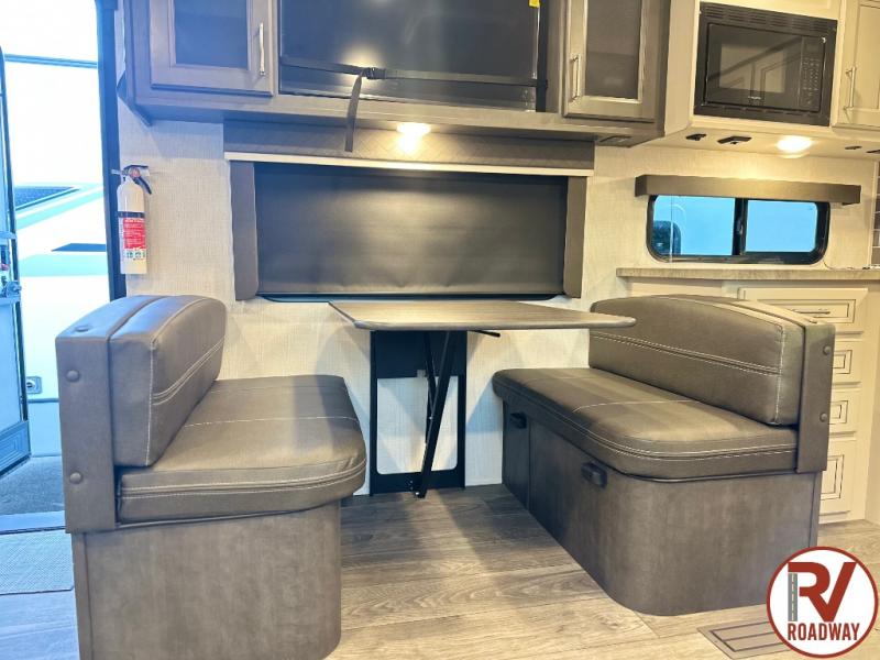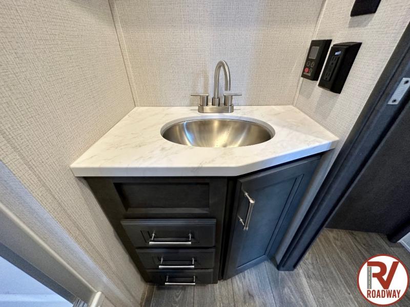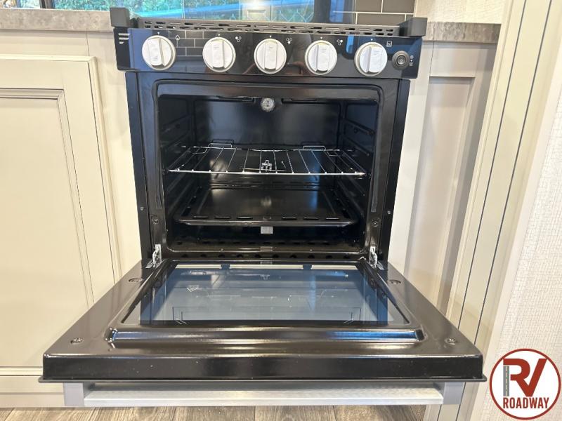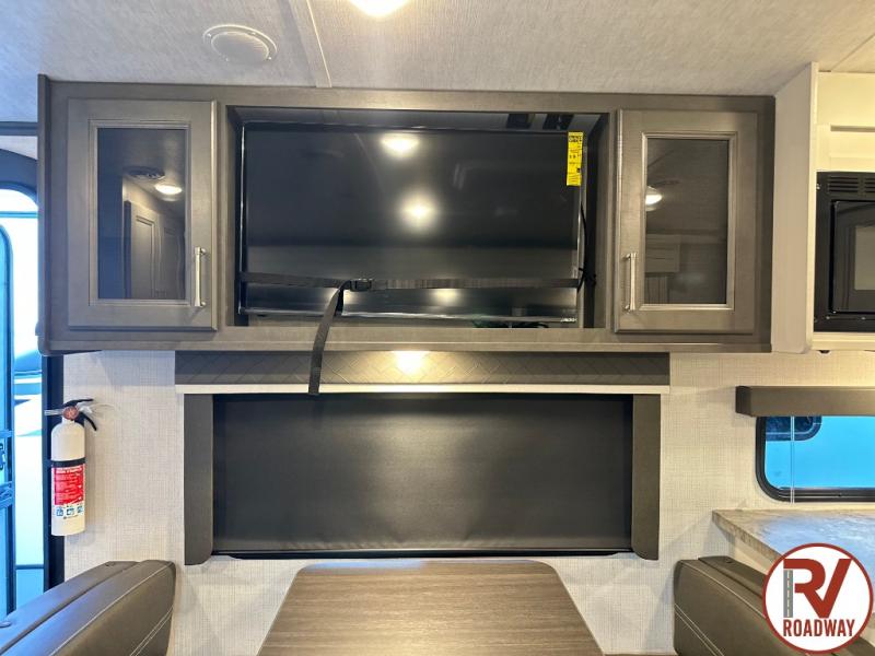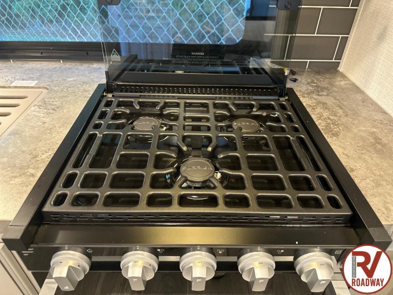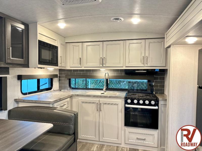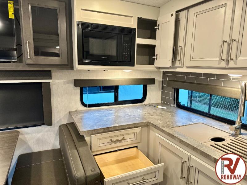 If you're ready for fun summers at the lake, make your adventures complete with this travel trailer in tow. The rear kitchen includes ample counter space to prep burgers, and you can take your preparations outside to cook on the outdoor kitchen! If the weather is nice, you might just want to eat outside too under the 18' power awning, or dine inside at the booth dinette. There is also a tri-fold sleeper sofa within the large slide out and an LED HDTV for movie nights. You'll find plenty of storage throughout, including a kitchen pantry, overhead cabinets, plus dual bedroom wardrobes on either side of the king bed!