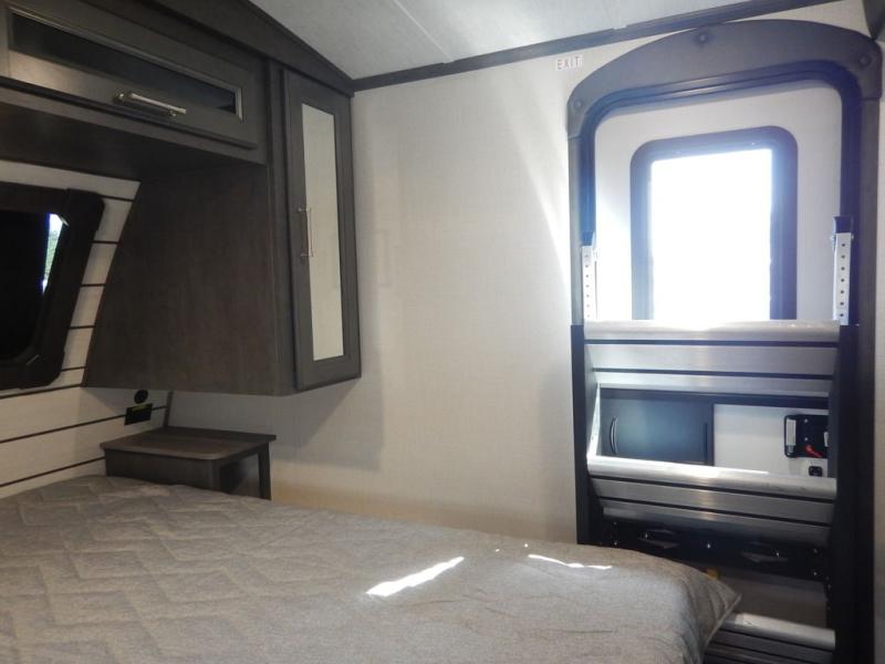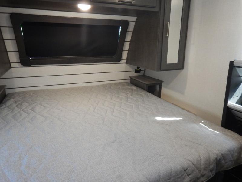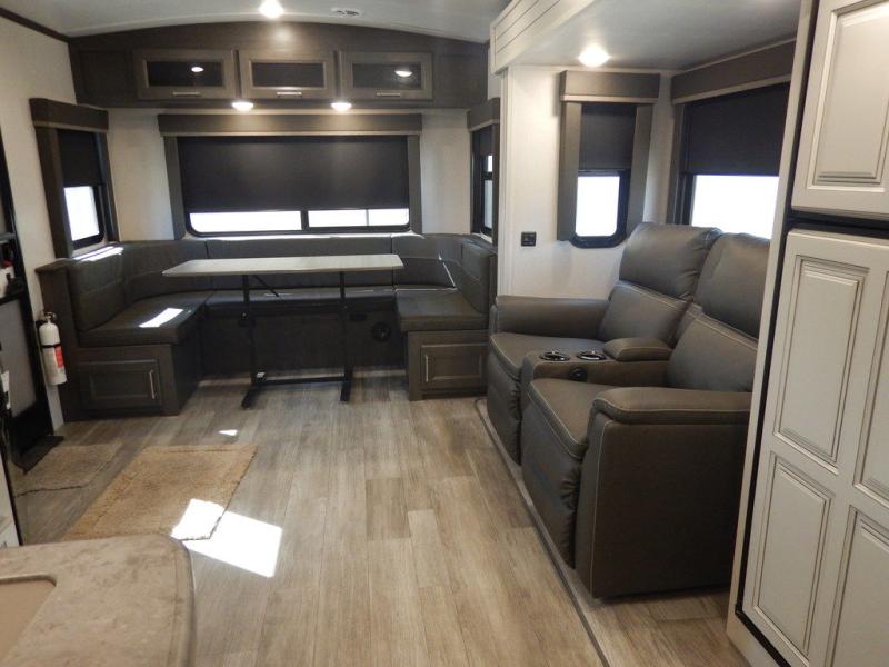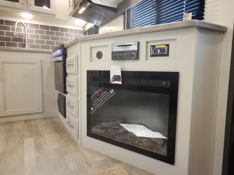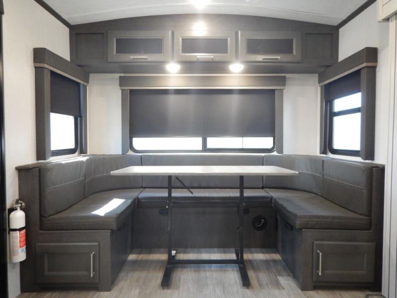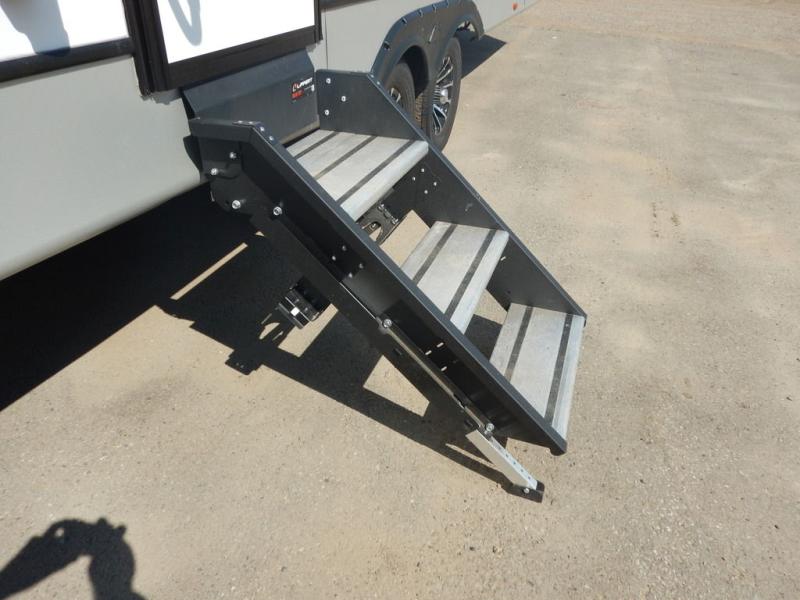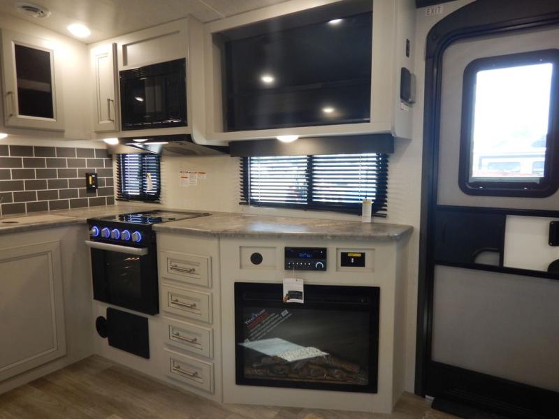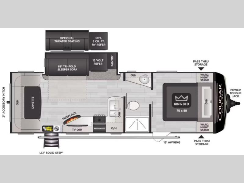 You will enjoy all of your adventures with this Cougar Half-Ton travel trailer in tow! Inside, you will find ample space and seating with a large slide that includes a tri-fold sofa sleeper along one side and a U-shaped dinette across the entire back of the unit making mealtime and game time loads of fun. These features will allow you to easily entertain your RV park friends and overnight guests too. The tri-fold sofa sleeper can comfortably sleep two guests who will also enjoy the cozy electric fireplace on a cool chilly night. A private front bedroom including a king-size bed will ensure that you have a great night's rest, and the private second entry door into the front bedroom makes it easy to slip out for a morning walk before your guests awake. This unit also features ample storage both inside and out with a front pass-through compartment, wardrobes and overhead cabinetry throughout, and a pantry for your non-perishables.
