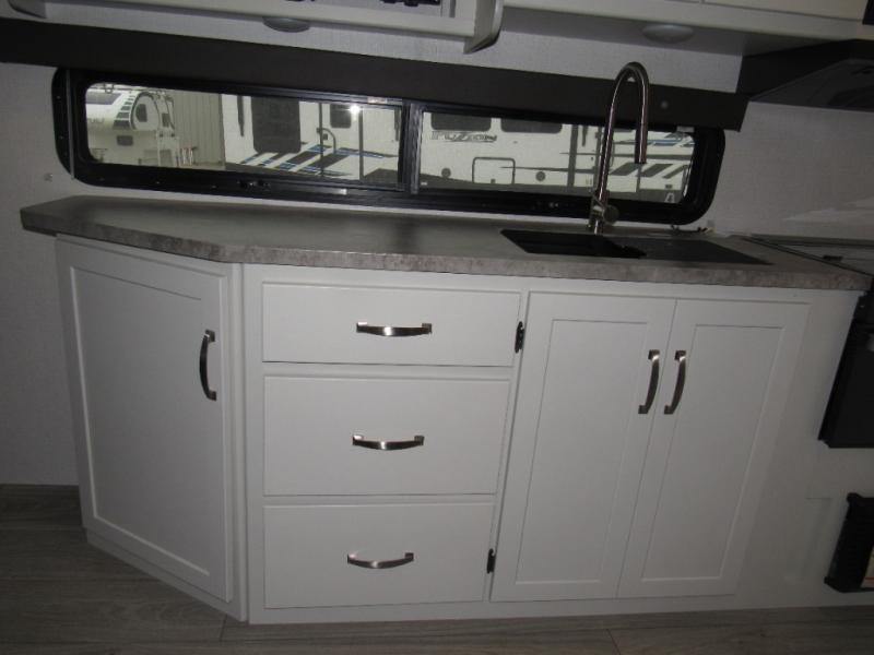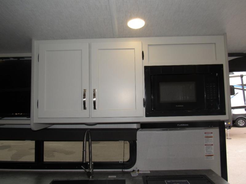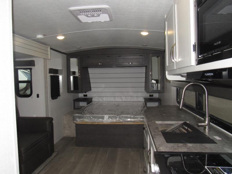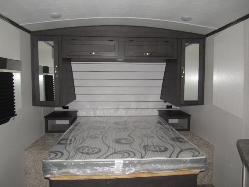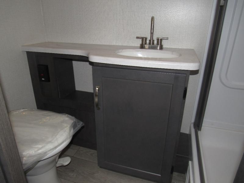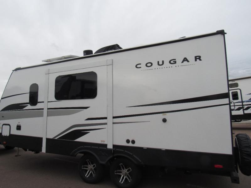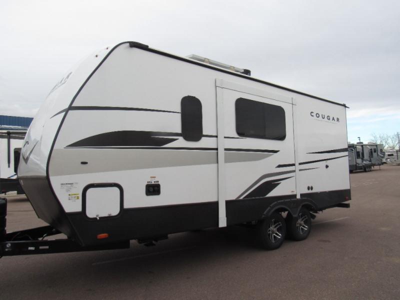 The Cougar Sport structural I-beam frame with stamped steel cross-members and outriggers, plus its laminated sidewalls with five-sided aluminum superstrucure and Alpha Super Flex roof membrane are what active RVers love about the construction of the Cougar line, and the Cougar Sport limited edition models are no exception when it comes to a great package, as well as being smaller and lighter weight than their big brother Cougar models. A one-piece, heated and enclosed polypropylene underbelly means a longer camping season. On the inside, residential shaker style hardwood cabinet doors and decorative crown molding, plus seamless pressed countertops and an on-demand water heater will make your unit feel even more like home. You are also sure to appreciate the shiplap style decorative accent wall behind the bed, a porcelain foot flush toilet in the bathroom, plus residential kitchen hardware, and so much more.