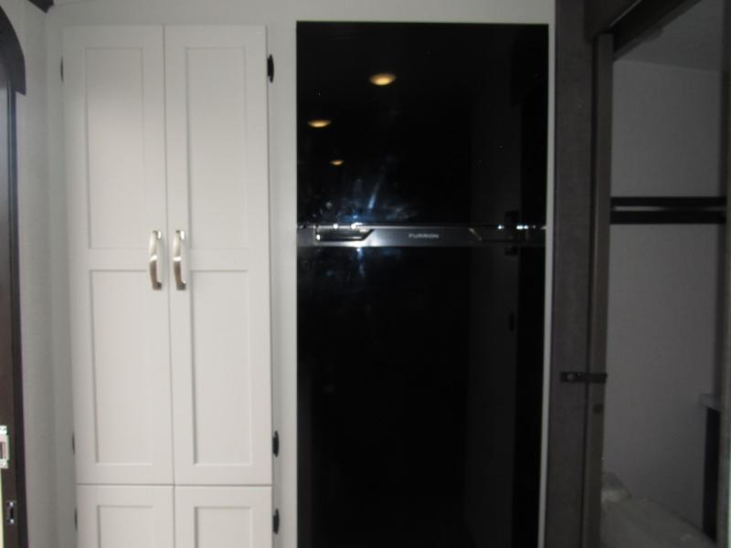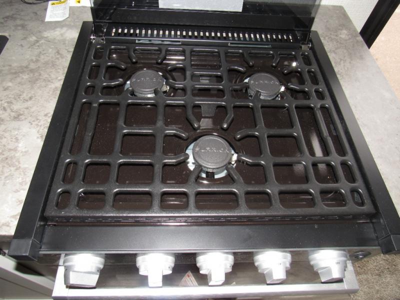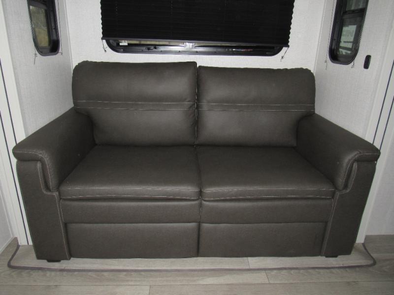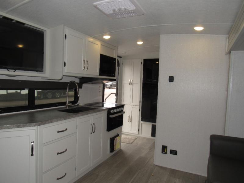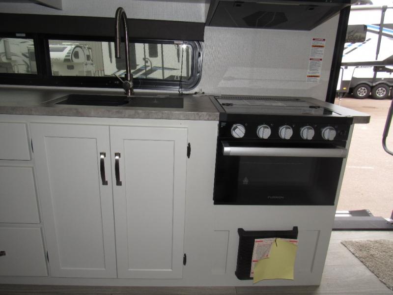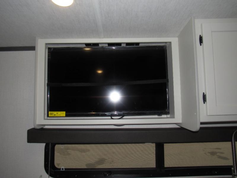 A cozy unit for two or four featuring a single slide out tri-fold sofa sleeper for family or overnight guests. Just inside the entry door, you will find a pantry and 12 volt refrigerator, a Furrion range with glass stovetop and microwave oven for all of your cooking needs. You will also find a large stainless steel undermount sink for cleaning up. A front queen bed offers wardrobes and nightstands for your clothing and personal items on either side, plus more overhead storage at the head of the bed. Here you can easily see the entertainment center where you will find an LED HD TV. Outside, a 2" accessory hitch for your hauling needs, a 15' power awning, plus LCI solid entry steps, and more.