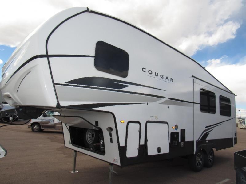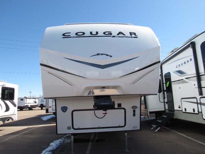 The Cougar Sport structural I-beam frame with stamped steel cross-members and outriggers, plus its laminated sidewalls with five-sided aluminum superstructure and Alpha Super Flex roof membrane are what active RVers love about the construction of the Cougar line. The Cougar Sport models are no exception when it comes to a great package, as well as being smaller and lighter weight than their big brother Cougar models. A one-piece, heated and enclosed polypropylene underbelly means a longer camping season. On the inside, residential shaker style hardwood cabinet doors and decorative crown molding, plus seamless pressed countertops and an on-demand water heater will make your unit feel even more like home. You are also sure to appreciate the shiplap style decorative accent wall behind the bed, a porcelain foot flush toilet in the bathroom, plus residential kitchen hardware, and so much more.