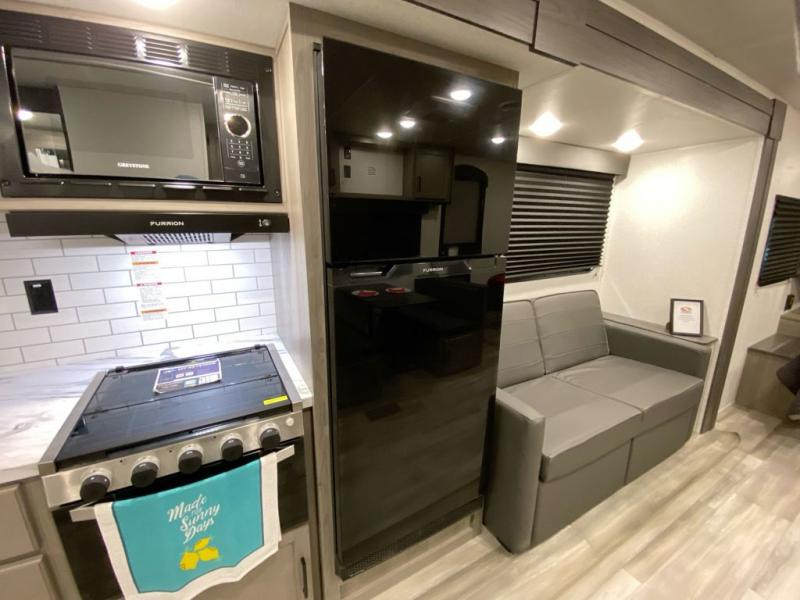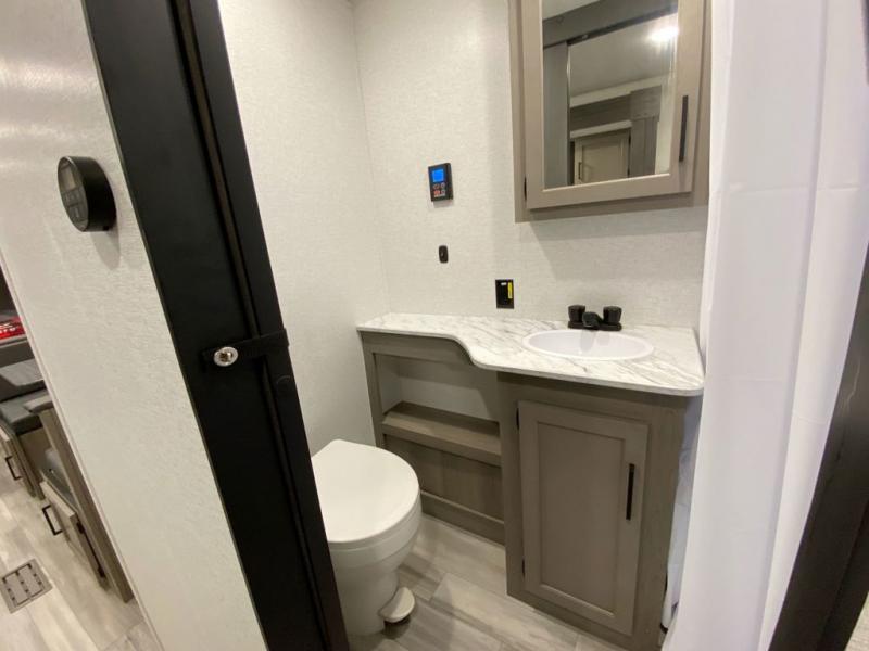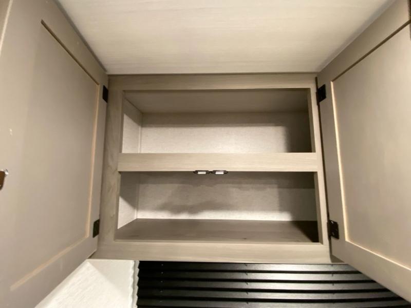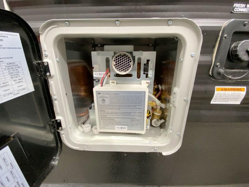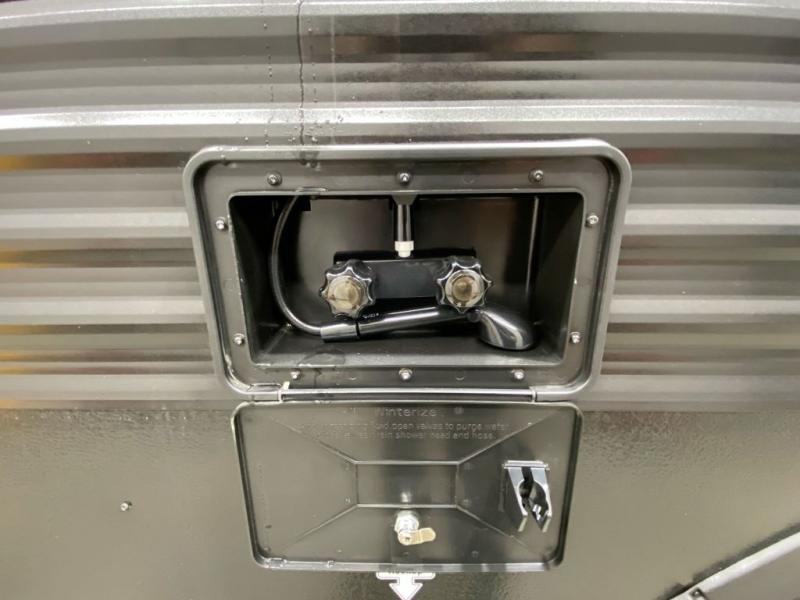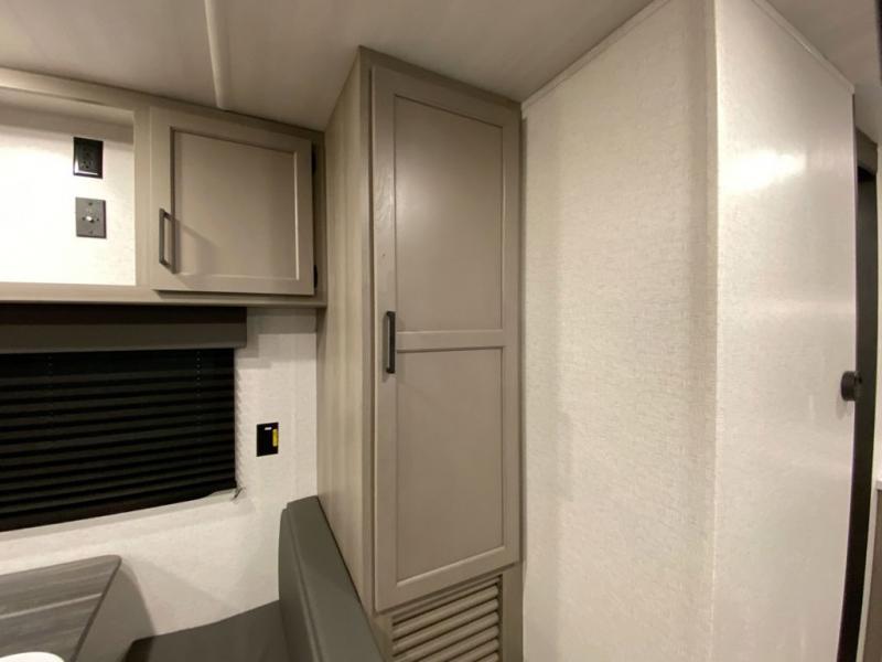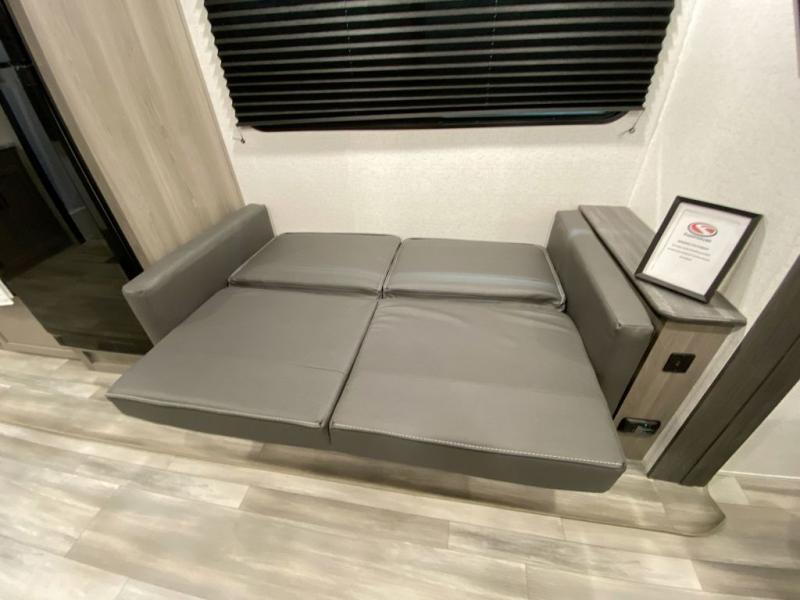 You'll love the added interior space this model has to offer thanks to the large slide out in the main living area. Here, you'll find the sofa, the three burner range, and the 10 cu. ft. 12V refrigerator. If you're needing a different seating space, just trade out the sofa for the optional theater seat! There is a large countertop in the back of this unit that houses the stainless steel sink, and the rear corner bath includes a spacious shower for convenience. You will love having your own space up front in the semi-private bedroom that includes a queen bed, dual closets and nightstands, plus a privacy curtain. There is even a laundry chute so you can throw dirty clothes straight to the pass-through storage!