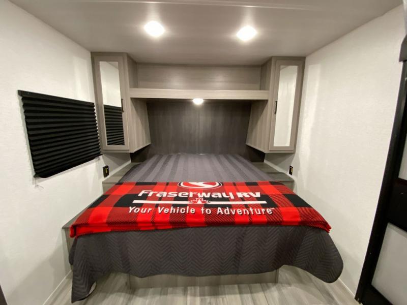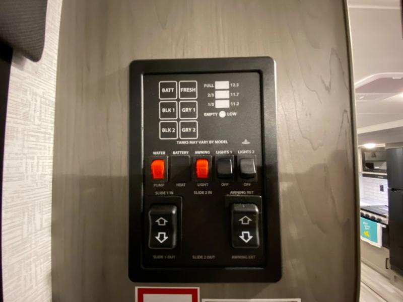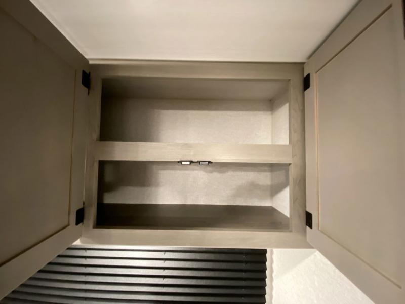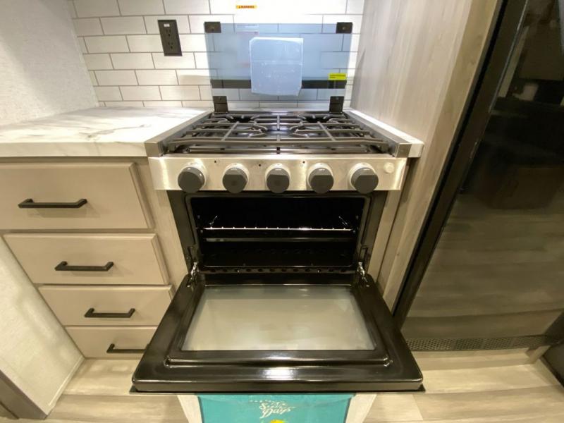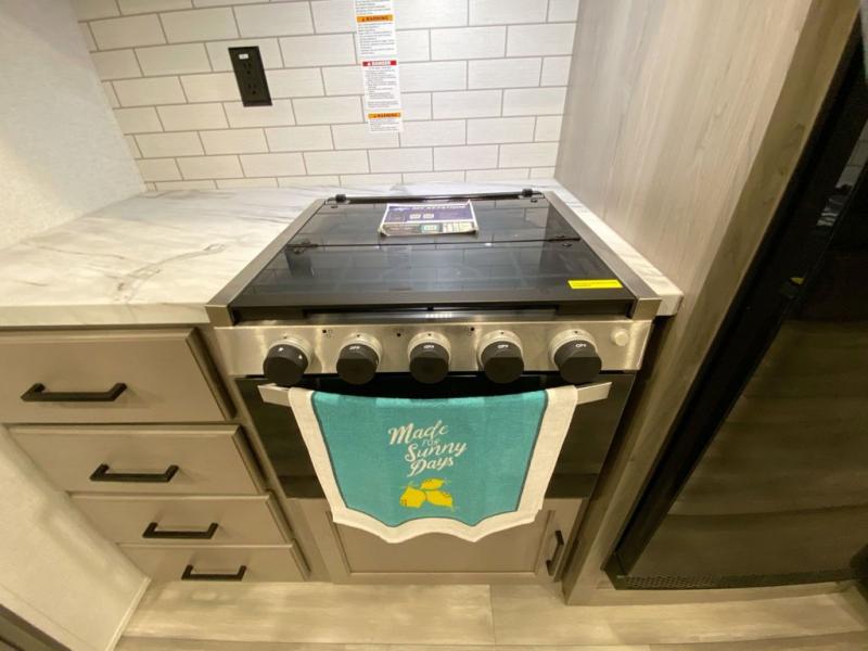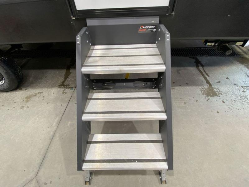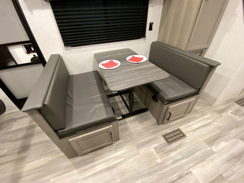 You'll love the added interior space this model has to offer thanks to the large slide out in the main living area. Here, you'll find the sofa, the three burner range, and the 10 cu. ft. 12V refrigerator. If you're needing a different seating space, just trade out the sofa for the optional theater seat! There is a large countertop in the back of this unit that houses the stainless steel sink, and the rear corner bath includes a spacious shower for convenience. You will love having your own space up front in the semi-private bedroom that includes a queen bed, dual closets and nightstands, plus a privacy curtain. There is even a laundry chute so you can throw dirty clothes straight to the pass-through storage!
