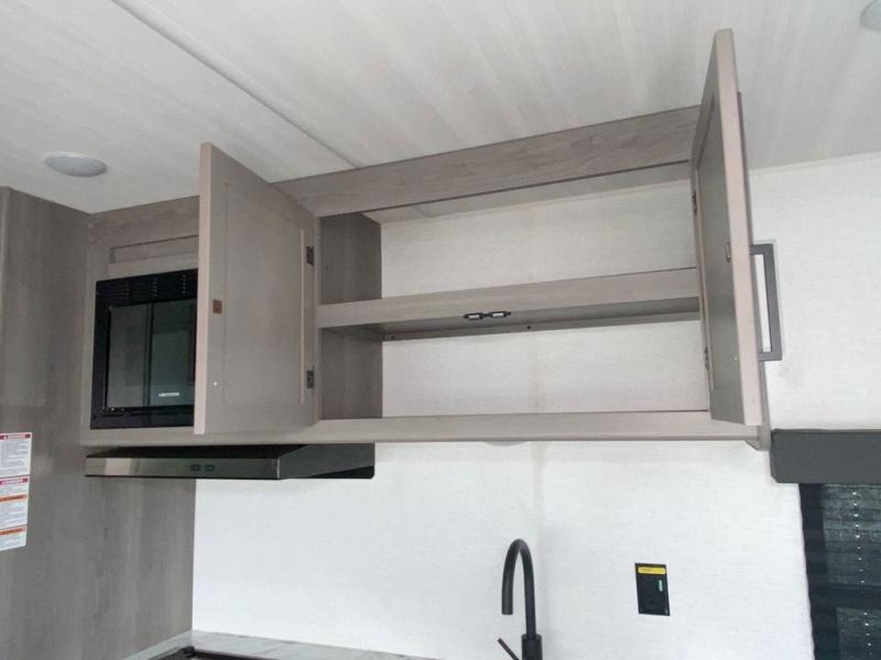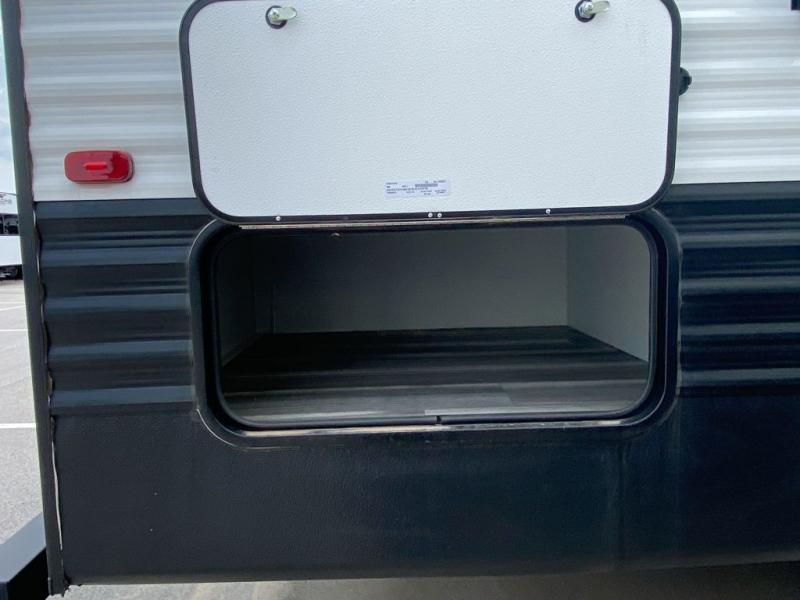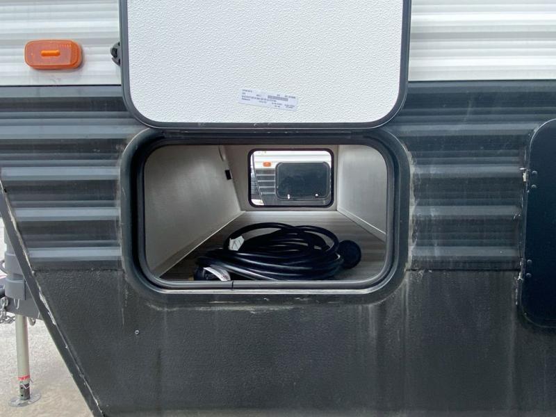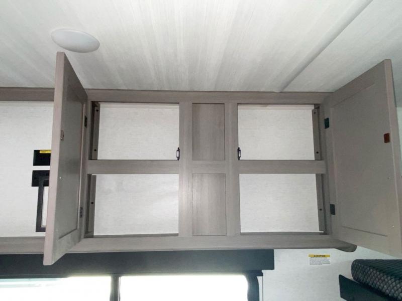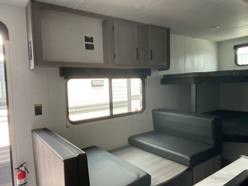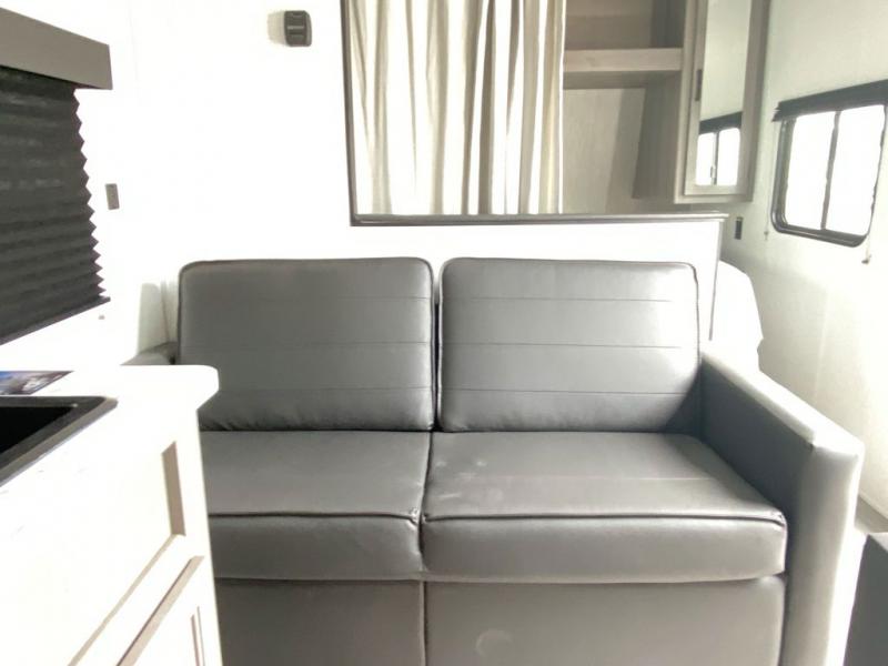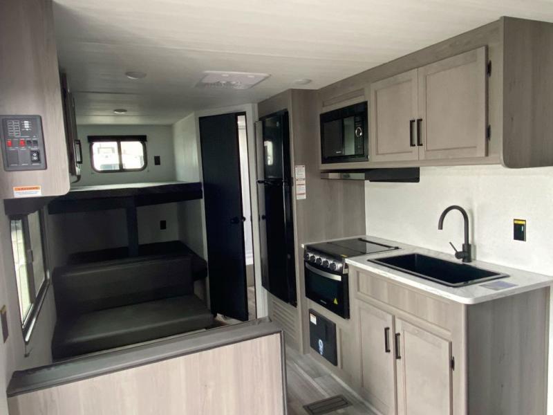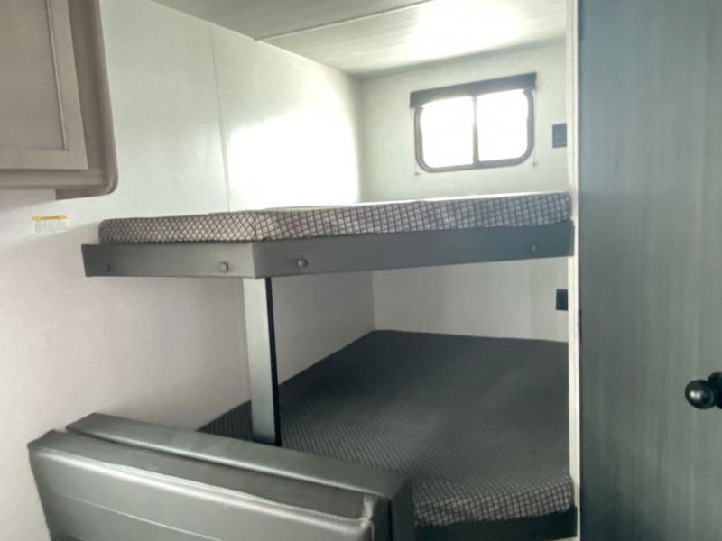 If you're looking for a travel trailer with a little more sleeping space, look no further than this Hideout Sport! There are double-size bunks with inside and outside storage, a walk-around queen bed in the front bedroom, plus a sofa and booth dinette for even more sleeping space. The kitchen comes with a two burner cooktop to cook meals on, a sink for clean up, and a 10 cu. ft. 12V refrigerator to store the milk and eggs. You will also find TV prep in this model if you enjoy movie nights while at the campground.