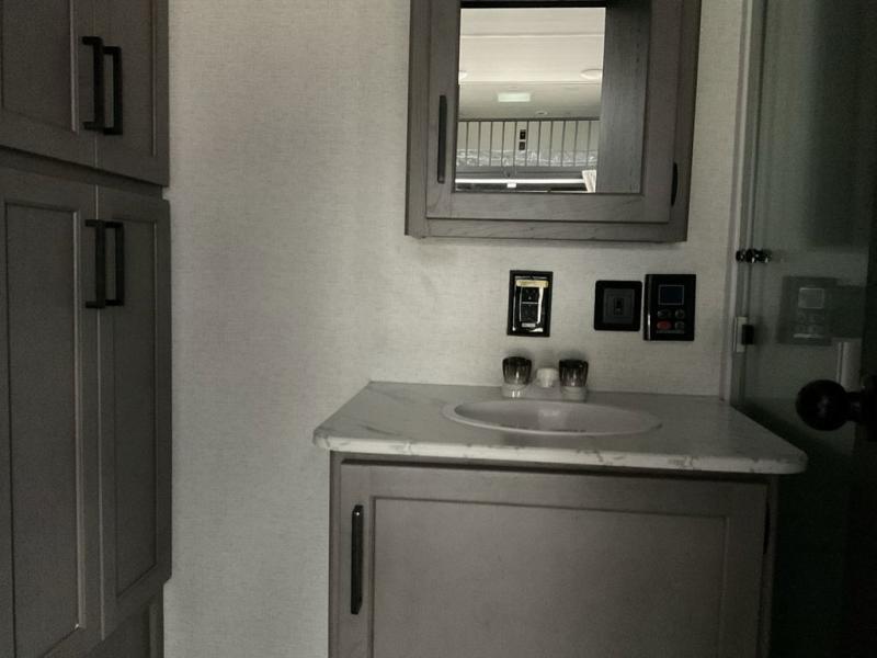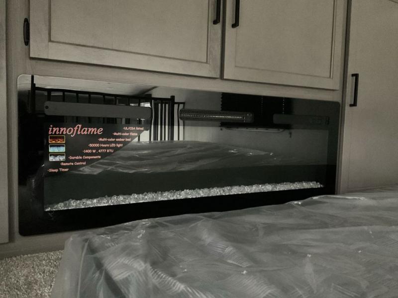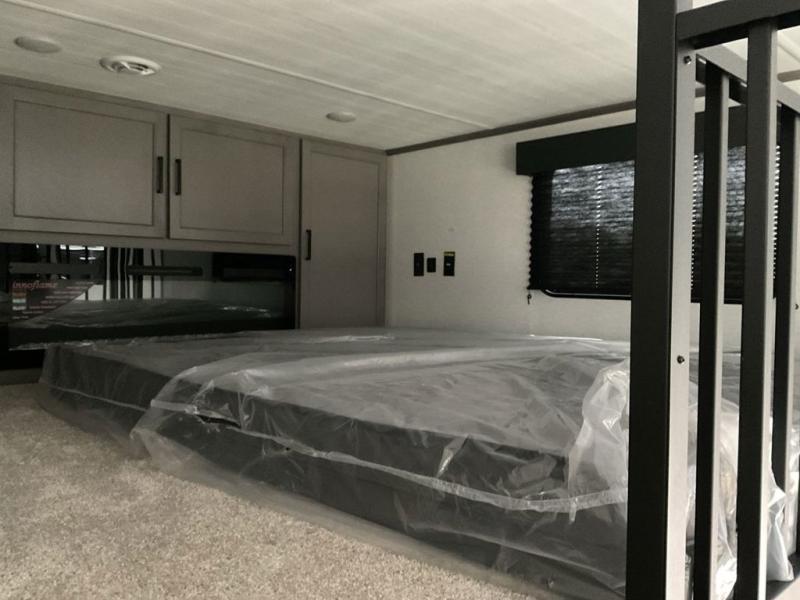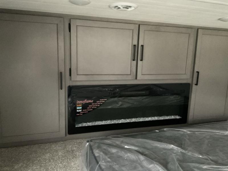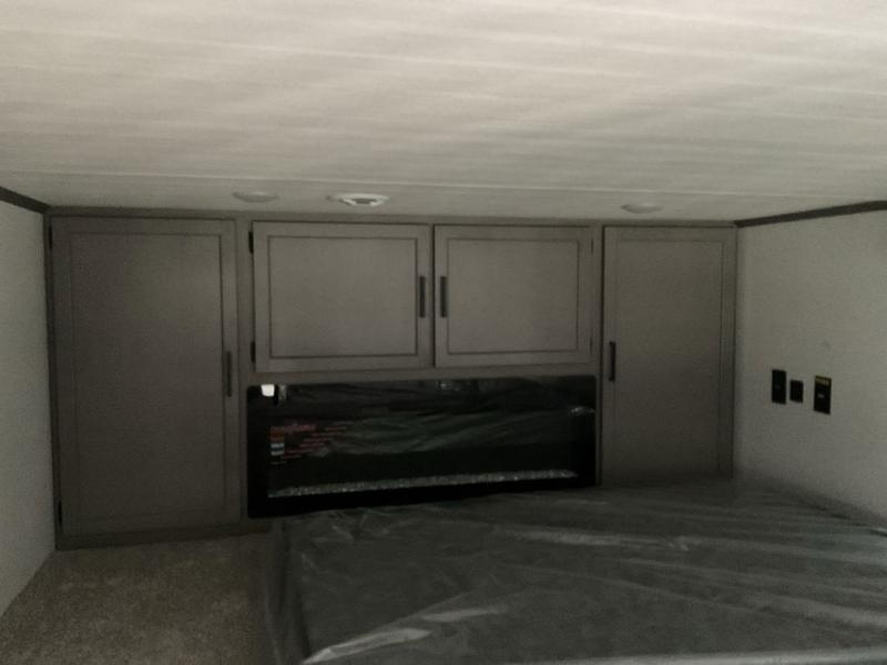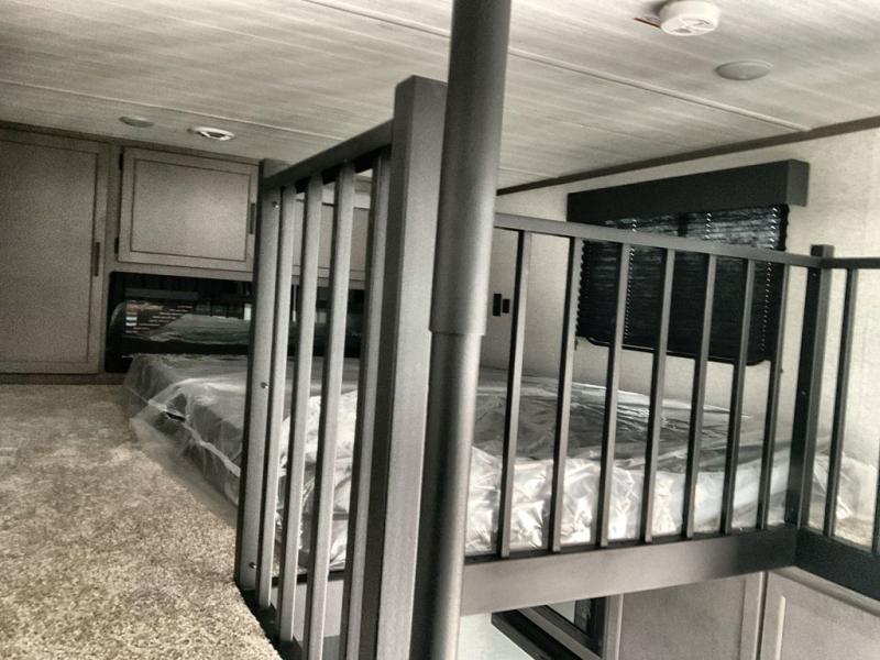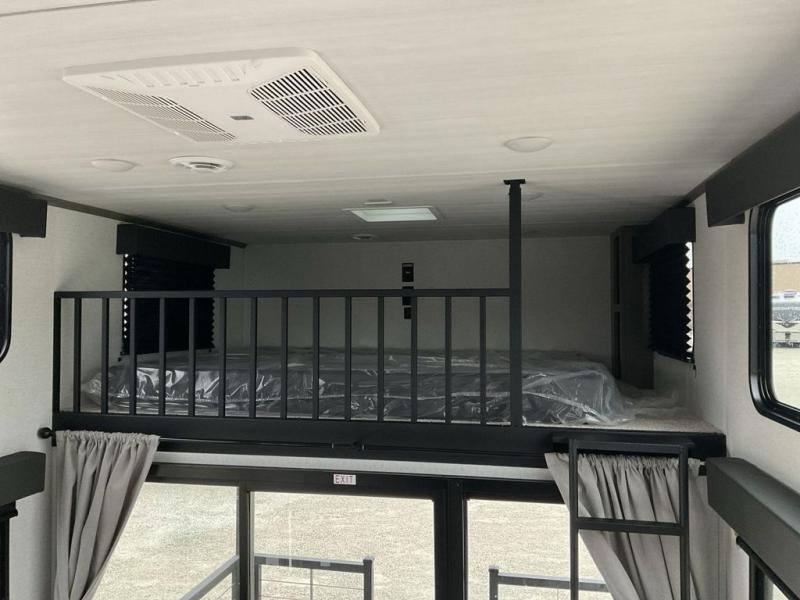 Any amount of time in this travel trailer will be time well spent! The rear entry door leads to the covered porch with a loft area above and queen-size bed. The patio door leads into the main living area where you can enjoy the sofa or dual lounge chairs with a pull-out table. Once you head to the front of this unit, you'll find the full kitchen with a three burner gas cooktop and 17" oven to cook meals on each day. There is also a pantry and 10 cu. ft. 12V refrigerator for food storage. The front full bath includes a shower with a seat, a toilet, sink, and a linen closet to keep clean towels close by. There is even a second loft above the kitchen and bath where you'll find a second queen-size bed and storage space for your things; how convenient!