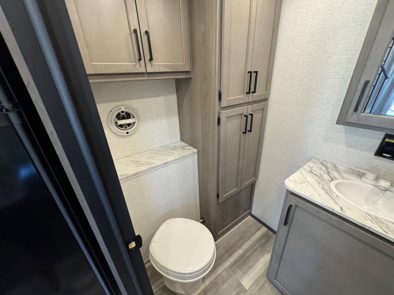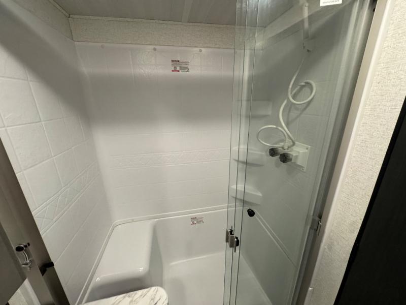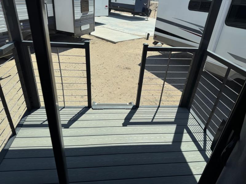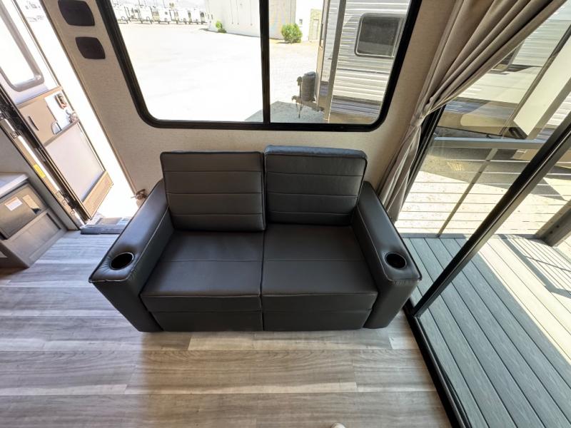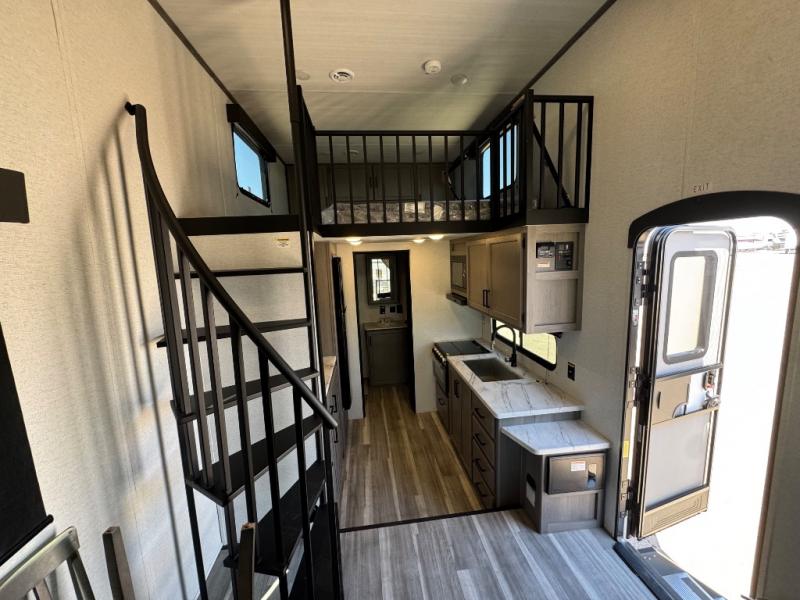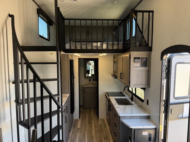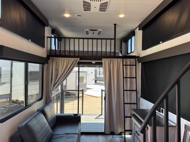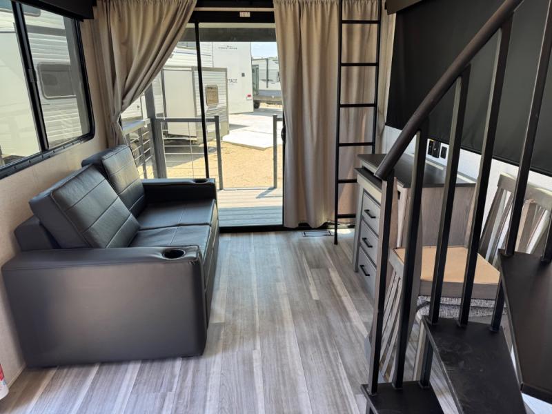 Any amount of time in this travel trailer will be time well spent! The rear entry door leads to the covered porch with a loft area above and queen-size bed. The patio door leads into the main living area where you can enjoy the sofa or dual lounge chairs with a pull-out table. Once you head to the front of this unit, you'll find the full kitchen with a three burner gas cooktop and 17" oven to cook meals on each day. There is also a pantry and 10 cu. ft. 12V refrigerator for food storage. The front full bath includes a shower with a seat, a toilet, sink, and a linen closet to keep clean towels close by. There is even a second loft above the kitchen and bath where you'll find a second queen-size bed and storage space for your things; how convenient!