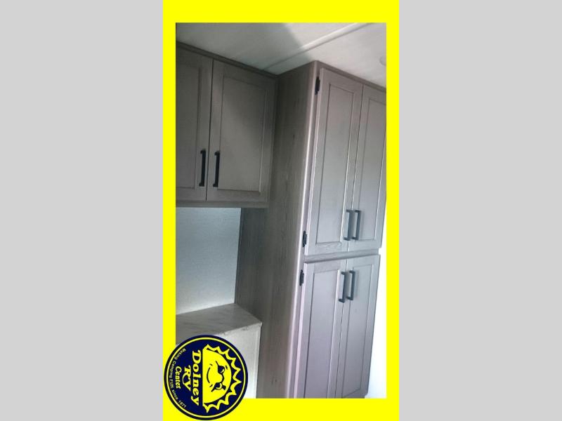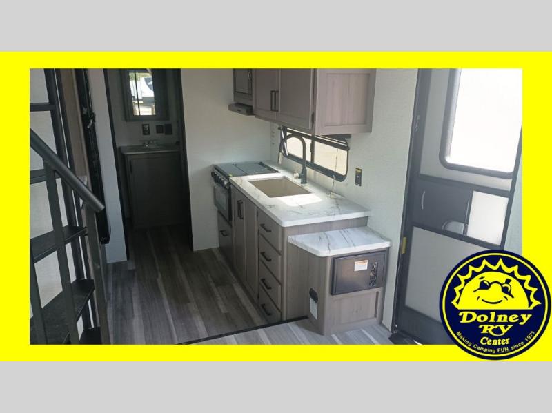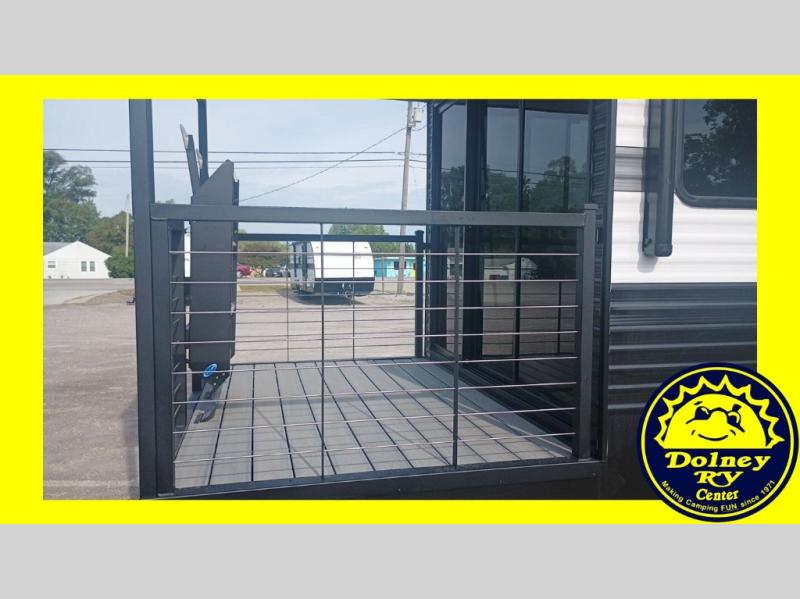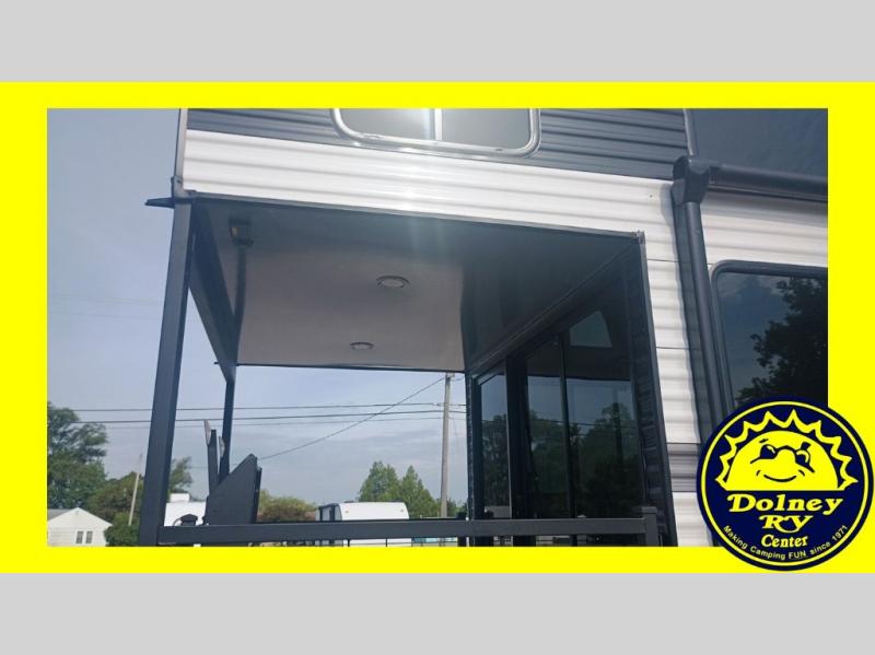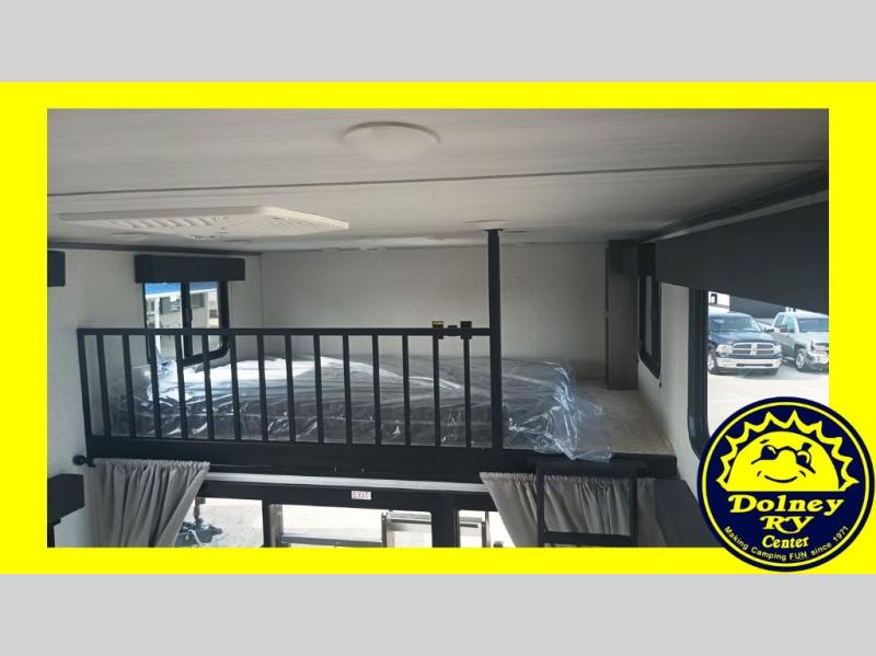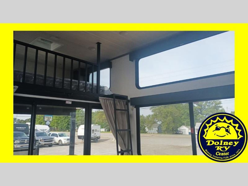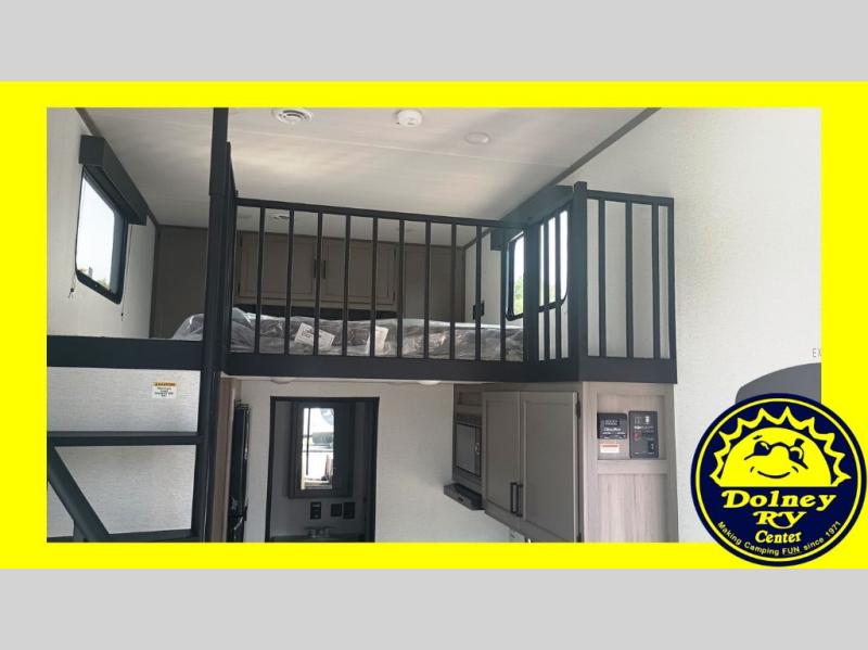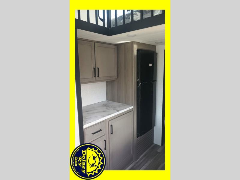 Any amount of time in this travel trailer will be time well spent! The rear entry door leads to the covered porch with a loft area above and queen-size bed. The patio door leads into the main living area where you can enjoy the sofa or dual lounge chairs with a pull-out table. Once you head to the front of this unit, you'll find the full kitchen with a three burner gas cooktop and 17" oven to cook meals on each day. There is also a pantry and 10 cu. ft. 12V refrigerator for food storage. The front full bath includes a shower with a seat, a toilet, sink, and a linen closet to keep clean towels close by. There is even a second loft above the kitchen and bath where you'll find a second queen-size bed and storage space for your things; how convenient!