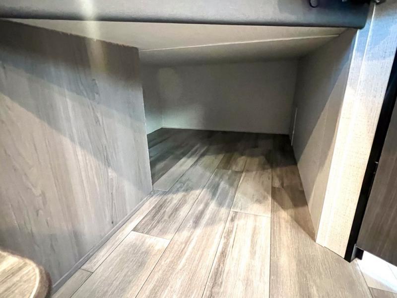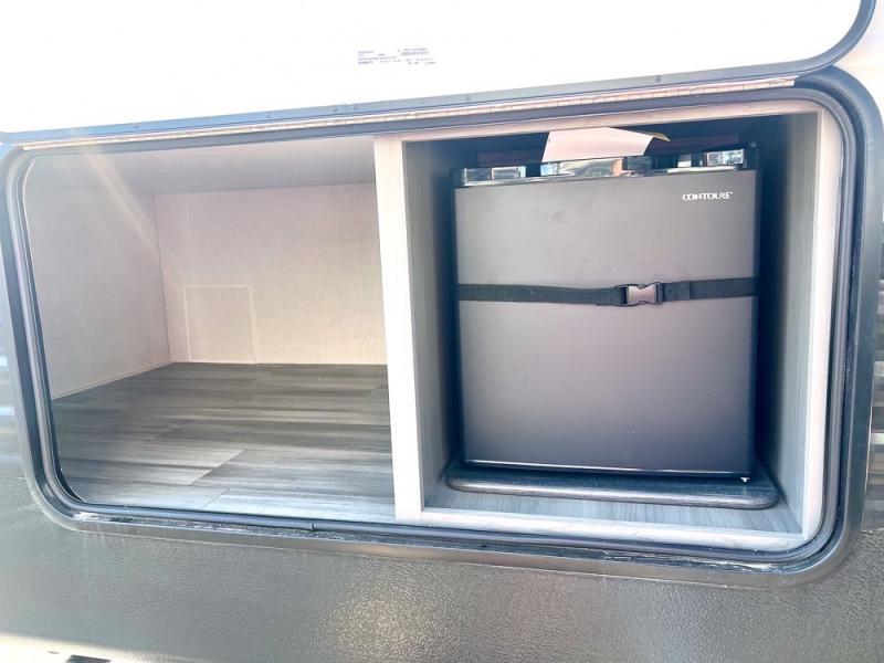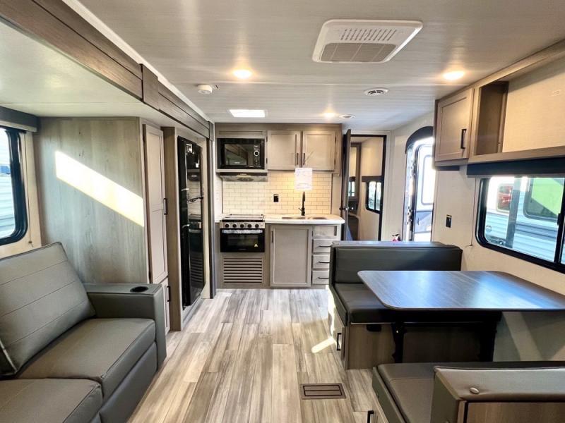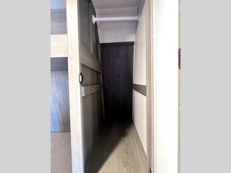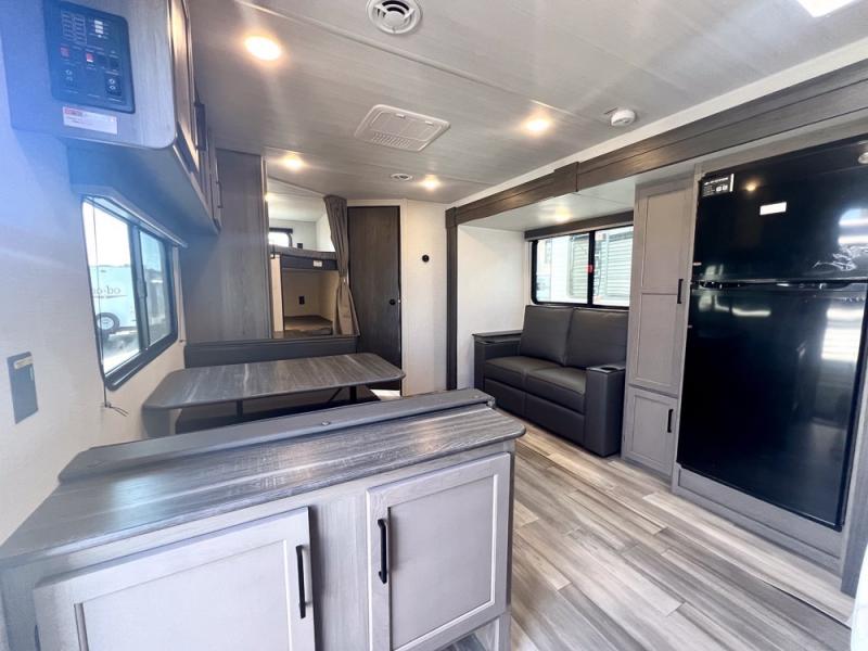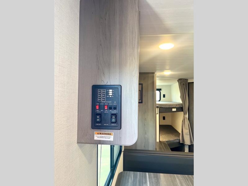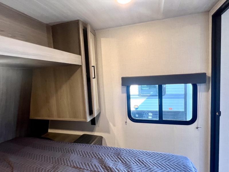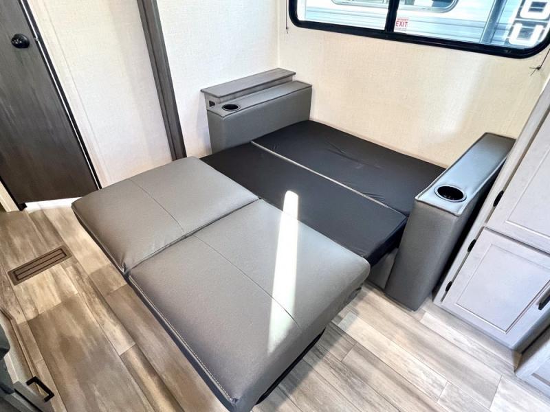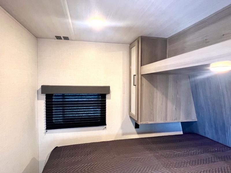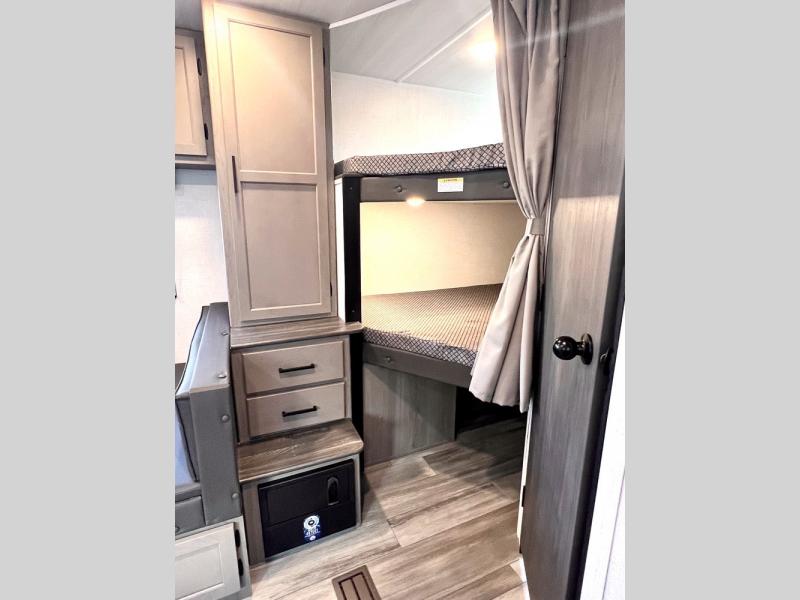 If you've been searching for a travel trailer with more space and a larger sleeping capacity, your search is over! This model includes double-size bunks with a flip-up bottom bunk for the little ones or your guests, plus a large slide out in the main living area, creating an open concept layout. The chef of your group can make meals on the three burner cooktop, and perishables can be kept in the 10 cu. ft. 12V refrigerator. A walk-around queen bed in the front bedroom will make this space feel more like home, and you'll enjoy dual closets and nightstands for your belongings. And don't forget to throw your dirty clothes in the convenient laundry chute!