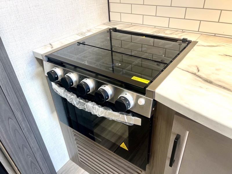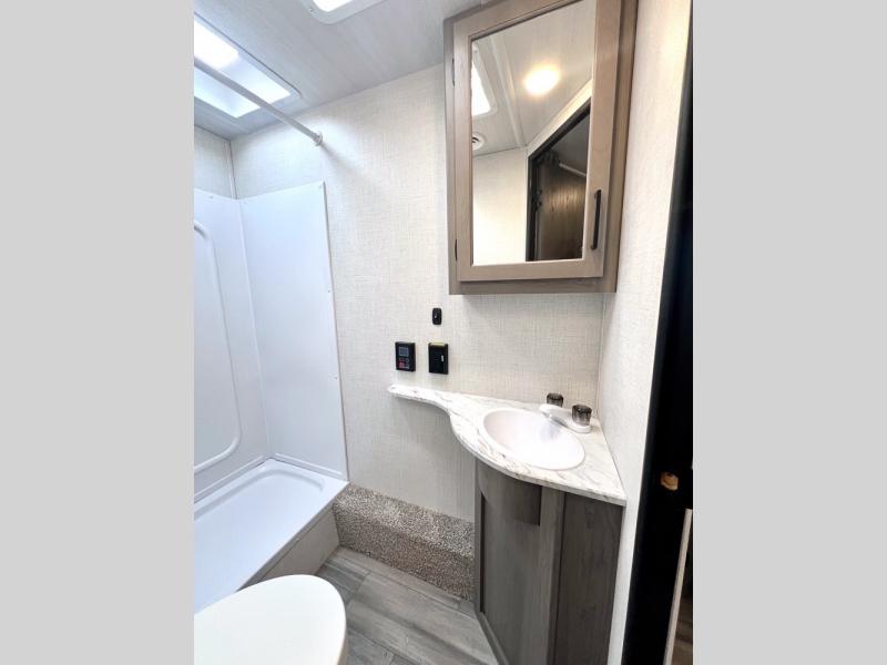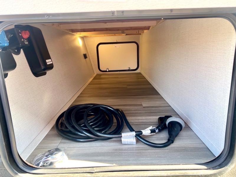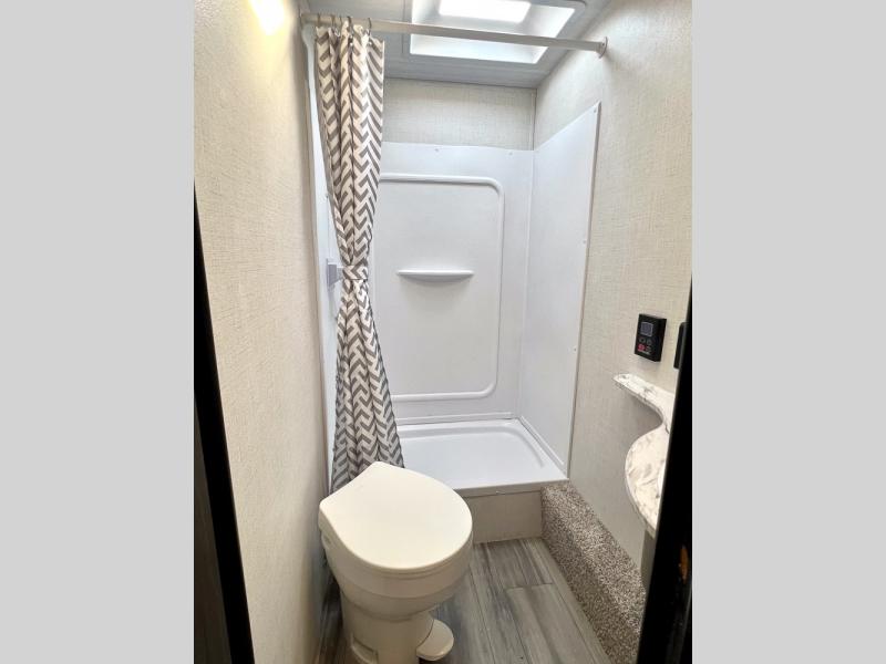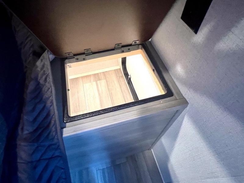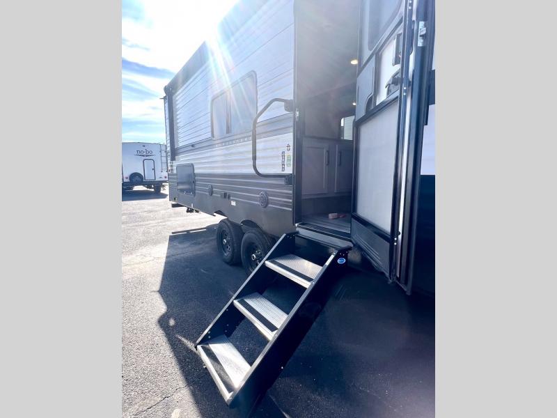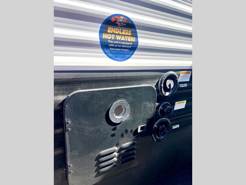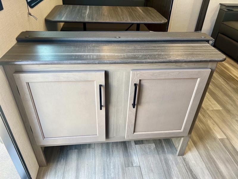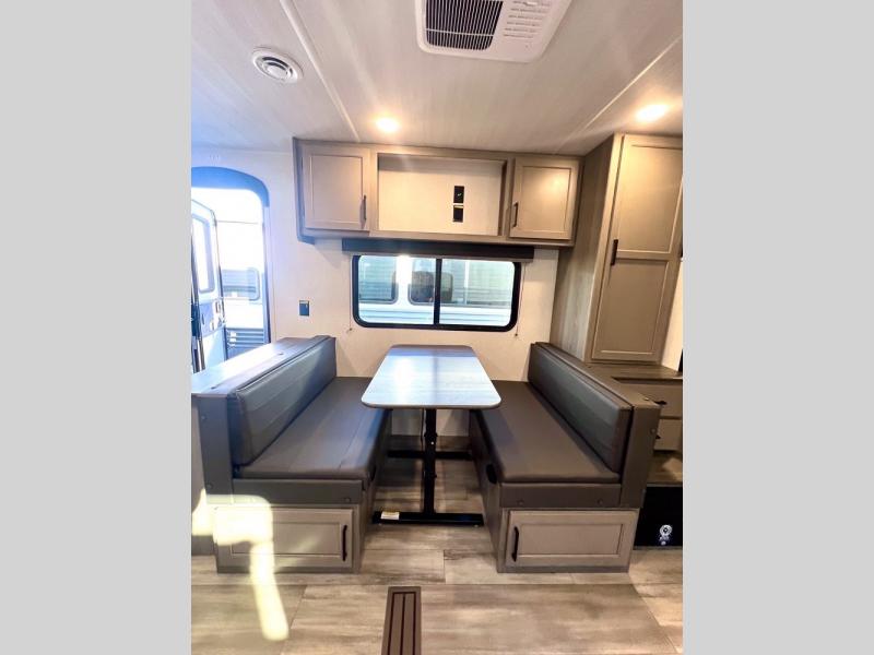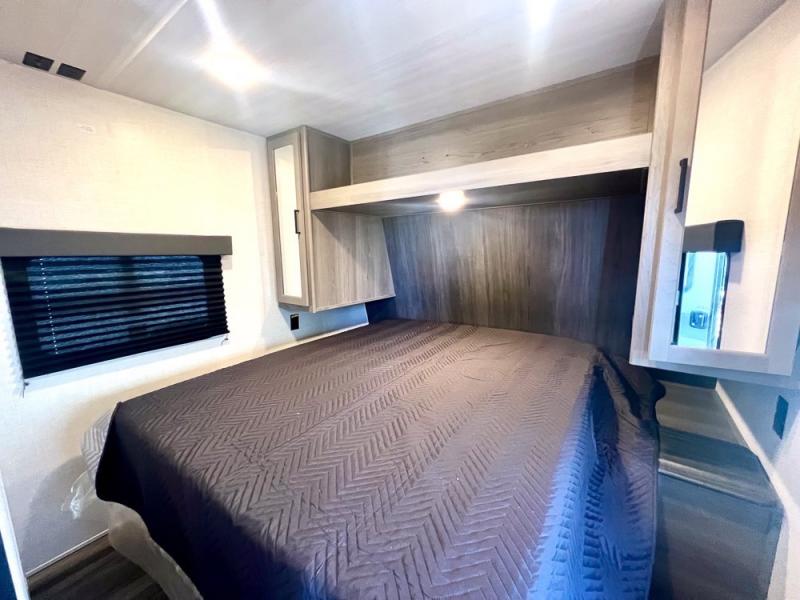 If you've been searching for a travel trailer with more space and a larger sleeping capacity, your search is over! This model includes double-size bunks with a flip-up bottom bunk for the little ones or your guests, plus a large slide out in the main living area, creating an open concept layout. The chef of your group can make meals on the three burner cooktop, and perishables can be kept in the 10 cu. ft. 12V refrigerator. A walk-around queen bed in the front bedroom will make this space feel more like home, and you'll enjoy dual closets and nightstands for your belongings. And don't forget to throw your dirty clothes in the convenient laundry chute!