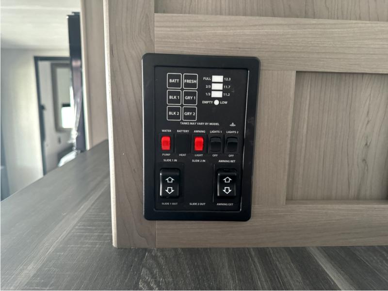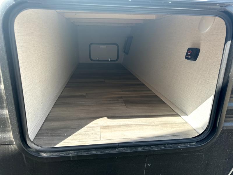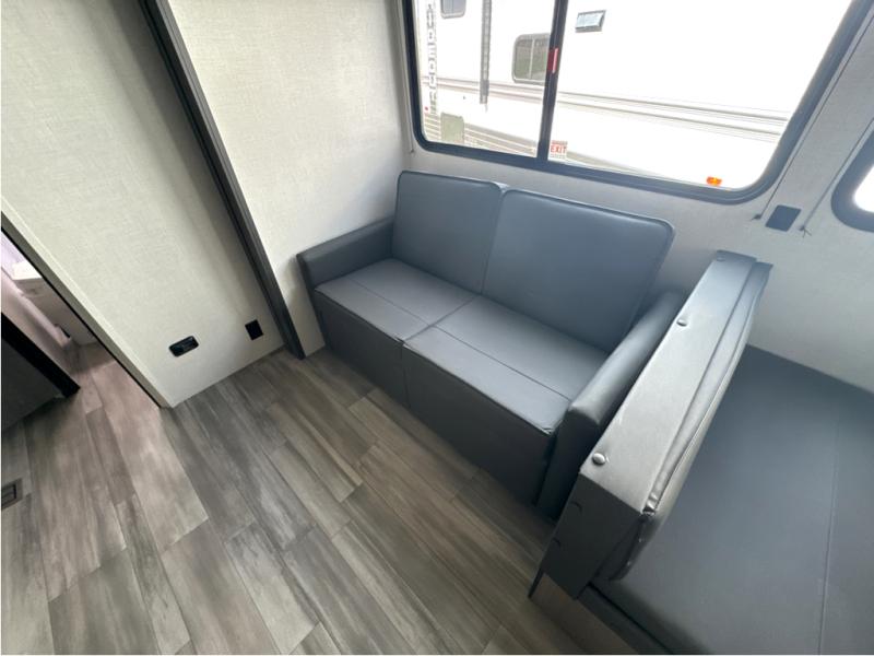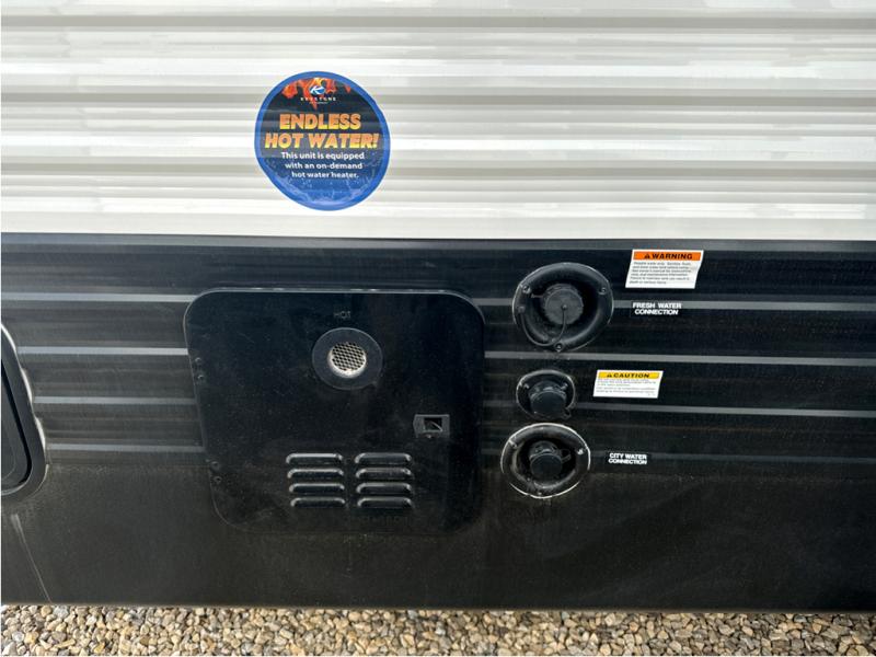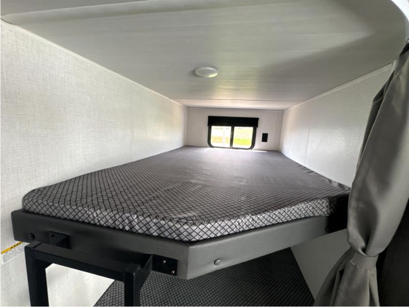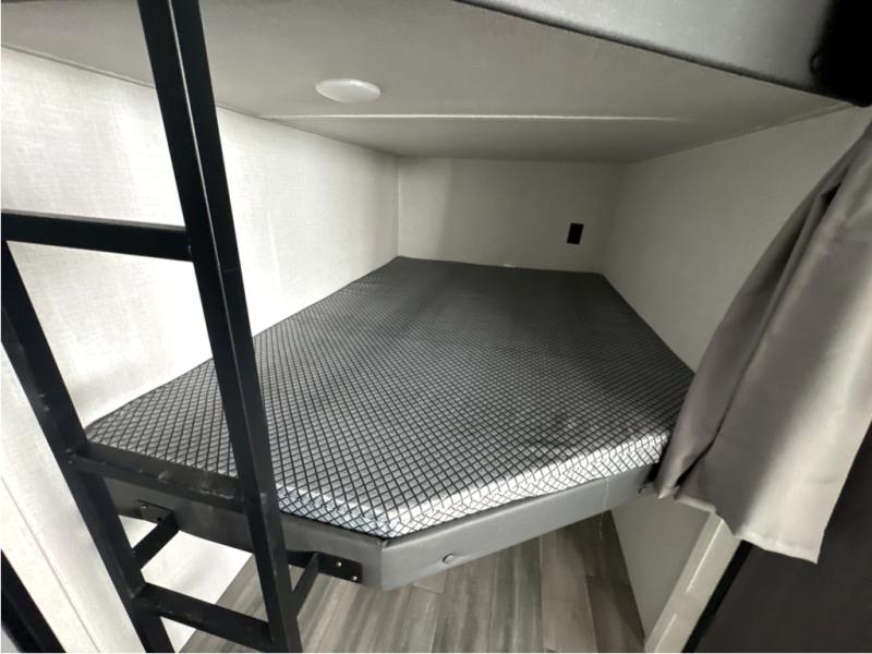 A large slide, front private bedroom, and double-size bunks make this Hideout Sport the ultimate travel trailer! You will enjoy a walk-around queen bed in the bedroom plus dual closets and nightstands for your things. The full bath is towards the back and beside the bunks for easy nighttime use, and there is outside storage under the bunks for your gear. Head to the kitchen to prepare lunch on the two burner cooktop, then dine at the booth dinette and sofa within the large slide. If the weather is nice, you might just want to take your plate outdoors to sit under the power awning!