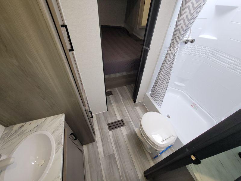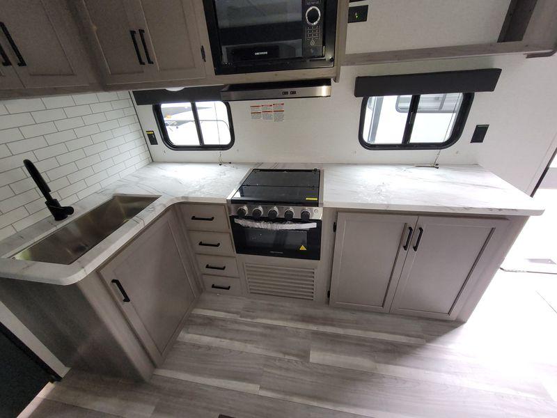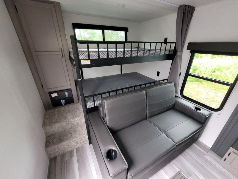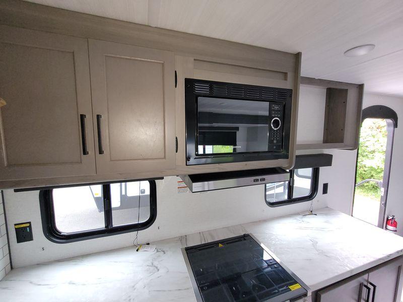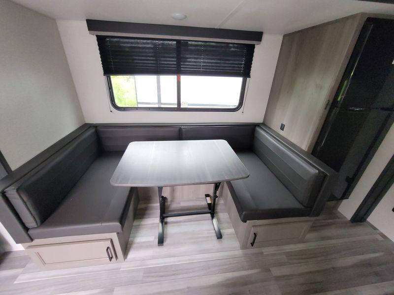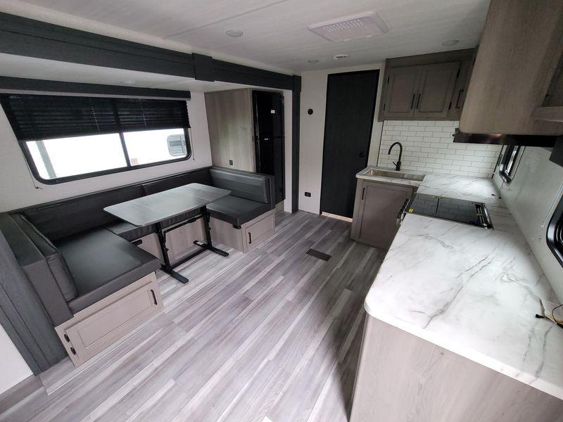 Are you looking for a travel trailer with more space, more amenities, and more sleeping space? Look no further than this Hideout! There are convenient dual entry doors for a smooth flow of traffic, a walk-through bath that will create a front master bedroom, plus bunks in the back with flip-up utility storage for your gear. And you can easily access this gear from outside using the storage door under the bunks! Everyone can meet in the main living area around the U-shaped dinette or on the sofa that be switched out for an optional tri-fold sofa or optional theater seating. And since there is TV prep you can make this space feel even more like home! The chef of your group will have everything they need to prepare meals each day, including a three burner cooktop and plenty of counter space. Head outdoors after dinner to enjoy the 21' power awning and grab a cold drink from the outdoor refrigerator!