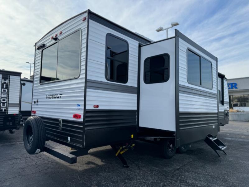 The Keystone Hideout travel trailers will be just what the doctor ordered for a stress-free holiday at your favorite campsite! There are a few exclusive features that you'll only find on a Keystone product, like the 4G LTE and Wi-Fi prep, the in-floor heating ducts, and the Tru-fit™ slide construction. Each model has a power awning for some shade in the afternoon, and the tinted safety glass windows will prevent the harmful UV rays from getting inside. You'll also have blackout night shades that you can close when you want privacy and one-piece pressed countertops that are not only sleek looking, but easy to keep clean.