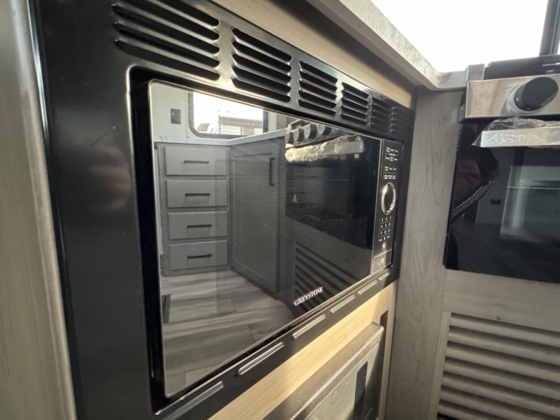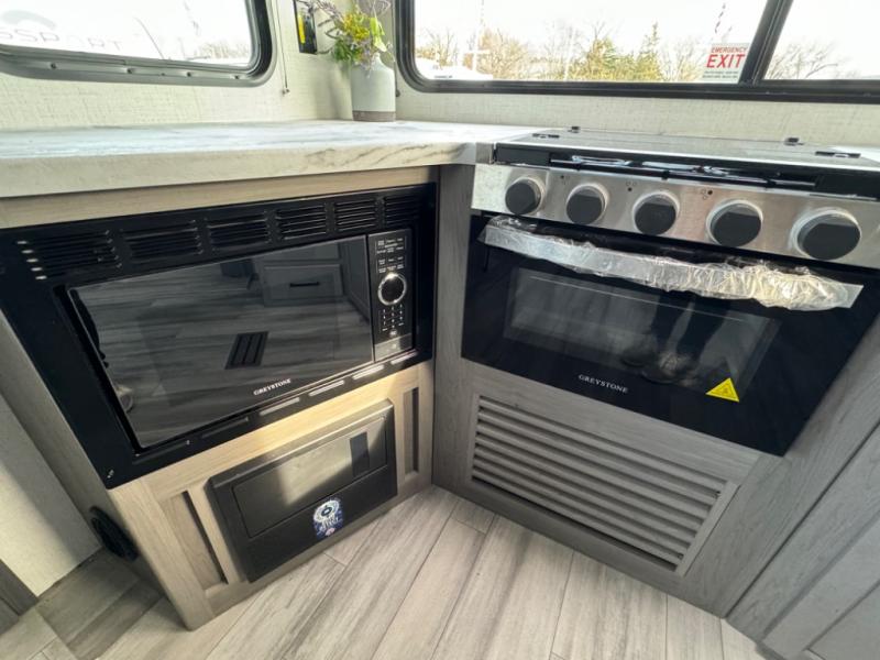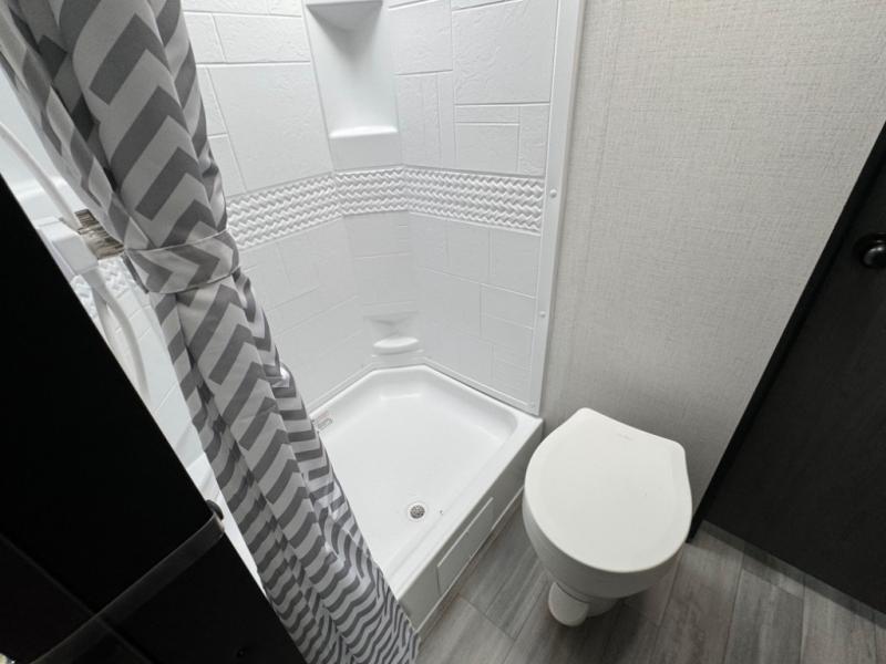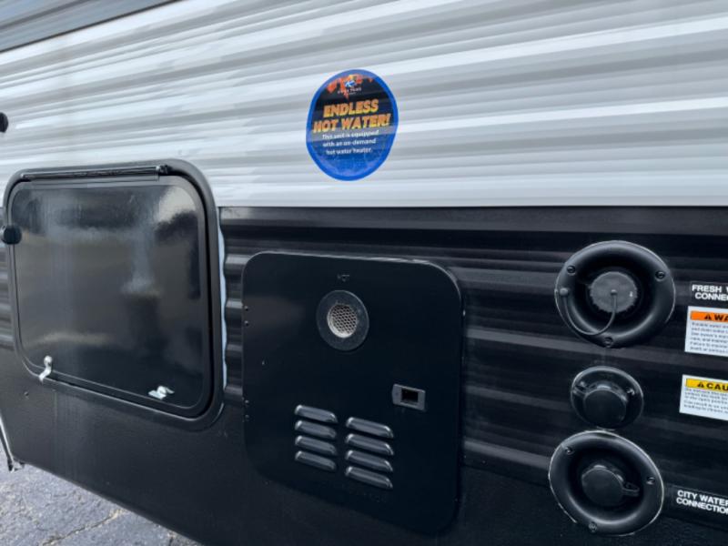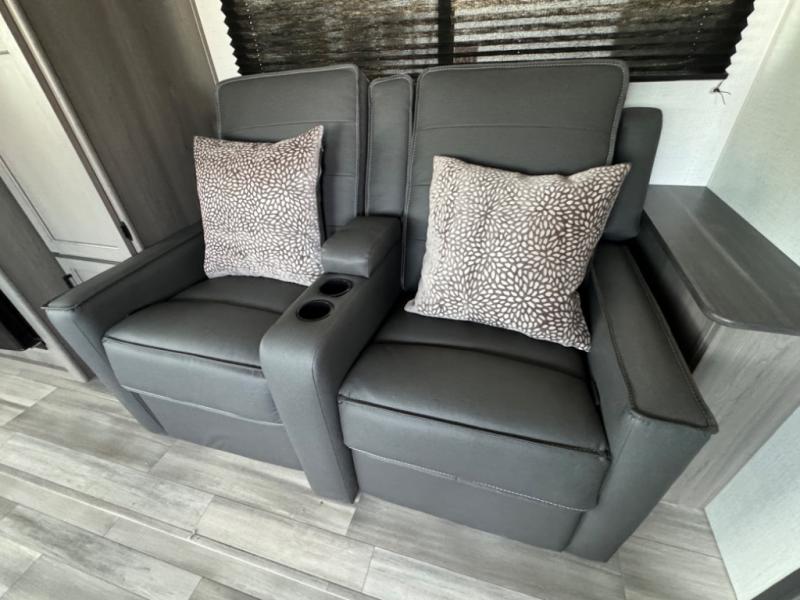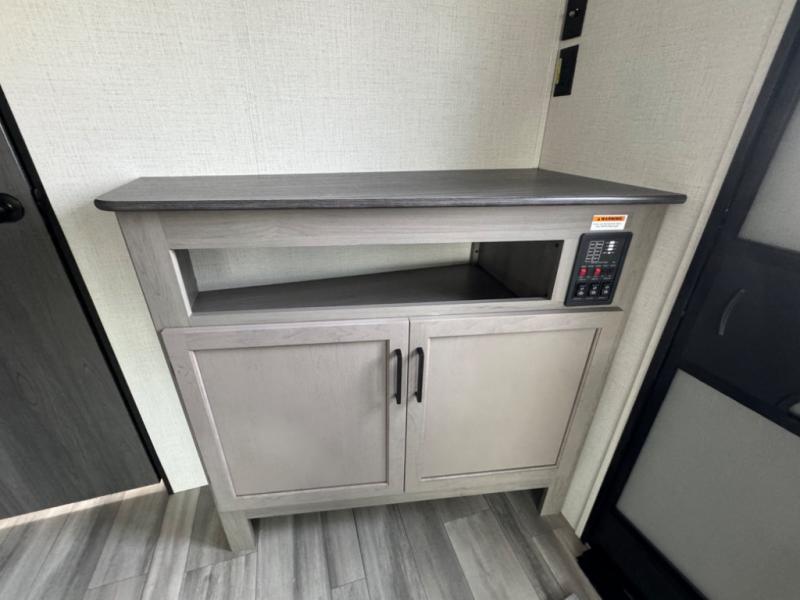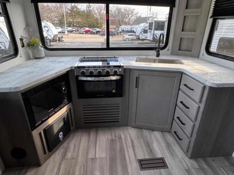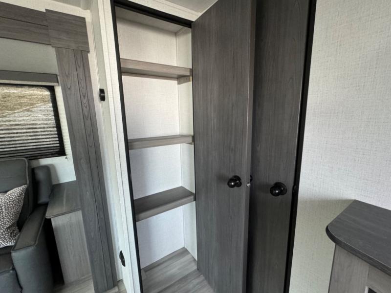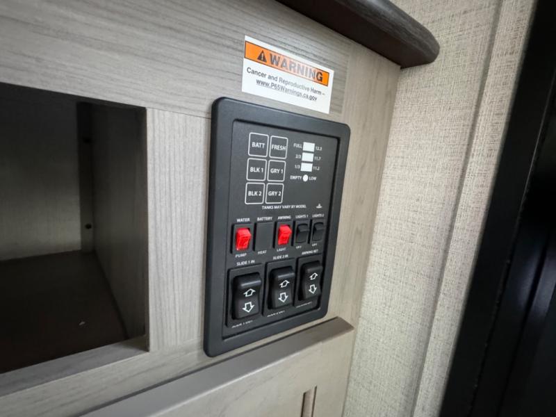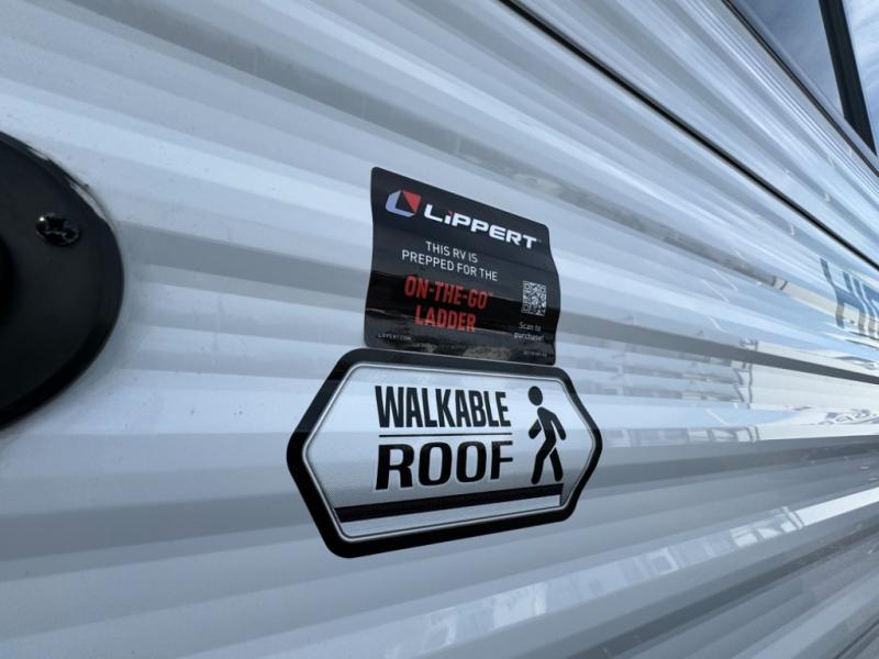 If extra space is what you're wanting, extra space is what you'll get with this travel trailer! There are dual opposing slides in the middle living area, a rear kitchen with tons of counter space, and a walk-through bath for easy access. Whether you're dining around the U-shaped dinette, relaxing on the sofa across from the entertainment center, or sitting under the 12' power awning, you're sure to have a great time. The front master bedroom will have you feeling right at home with its walk-around queen bed, dual closets, and laundry chute that goes straight to the pass-through storage!