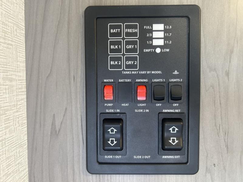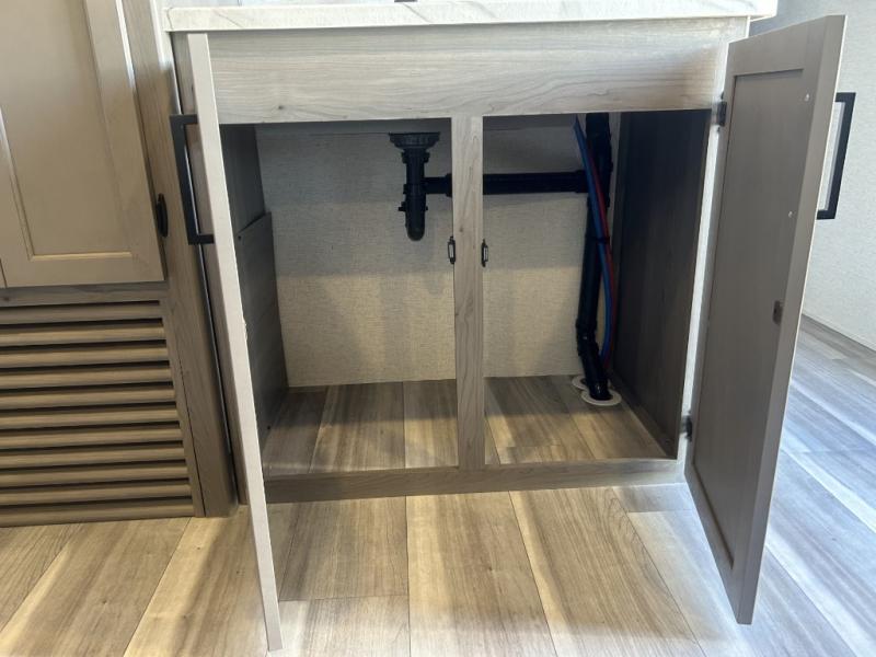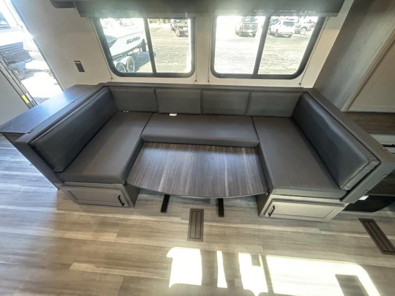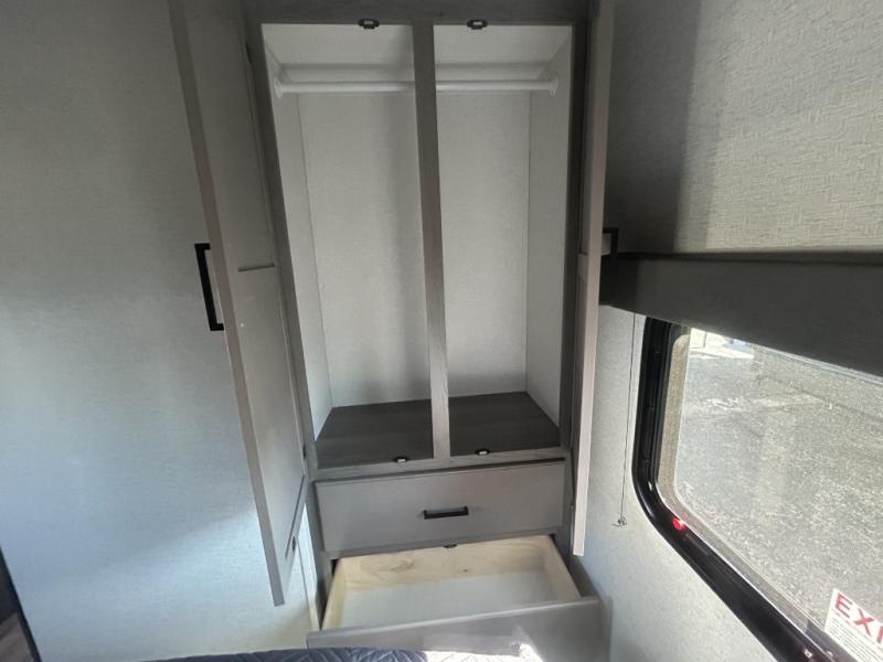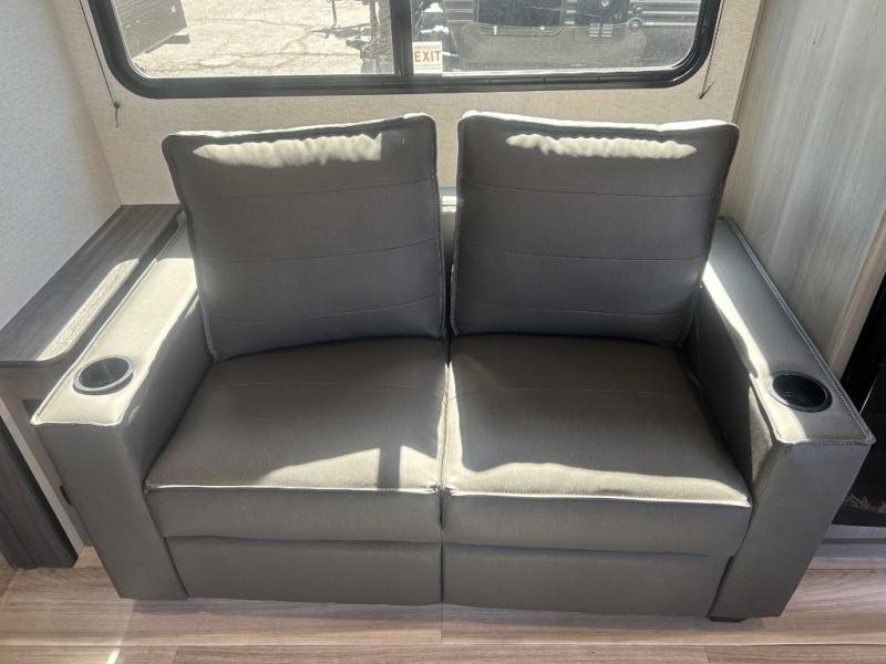 Check out this travel trailer with queen-size bunks in the back your guests are sure to love! There are also two sets of stairs and closets so they can easily climb into bed and store their belongings in their own space. The front private bedroom includes a walk-around queen bed, dual closets and dual nightstands, plus a convenient laundry chute that goes straight to the pass-through storage. And you'll find additional outdoor storage under the bunks in the back! Everyone can meet in the main living area each morning to dine around the U-shaped dinette or relax on the standard sofa. This sofa can also be switched out for an optional tri-fold sofa or optional theater seating, depending on your needs. The full kitchen includes a three burner cooktop, a spacious pantry, and a 10 cu. ft. 12V refrigerator for cold items. Start camping today!
