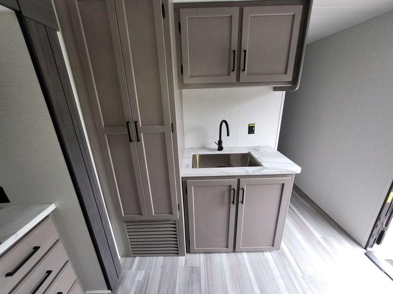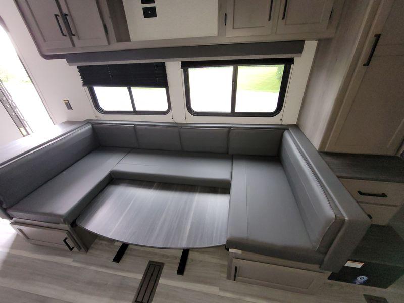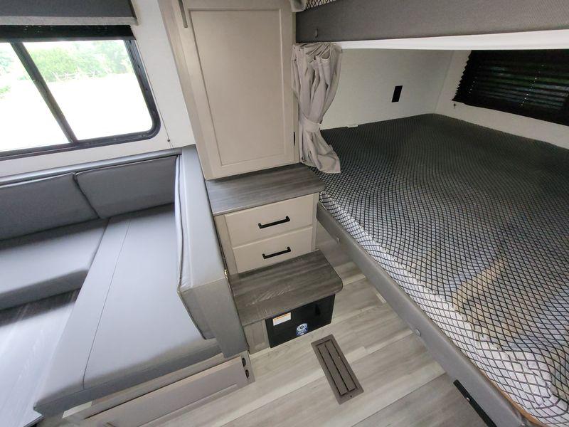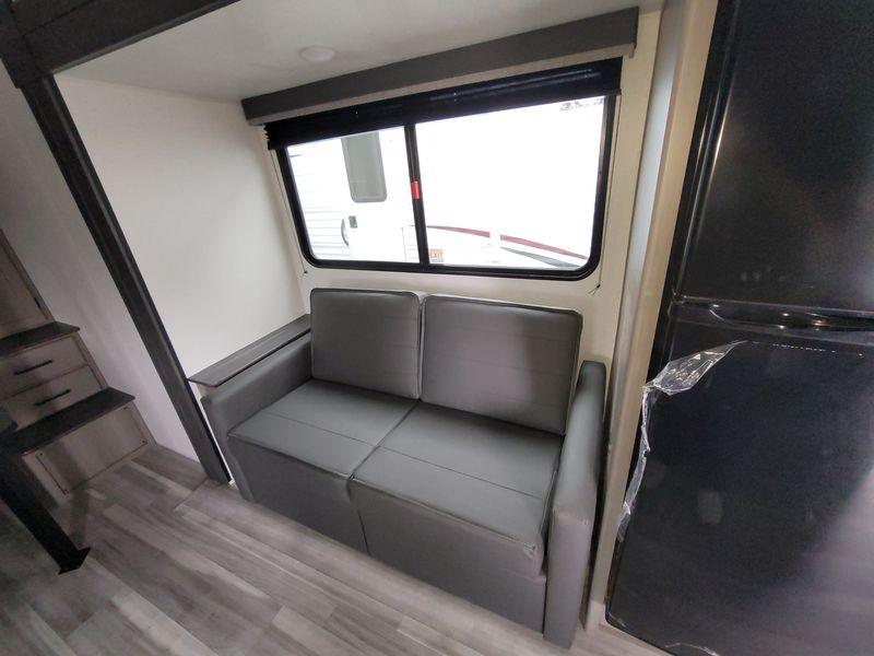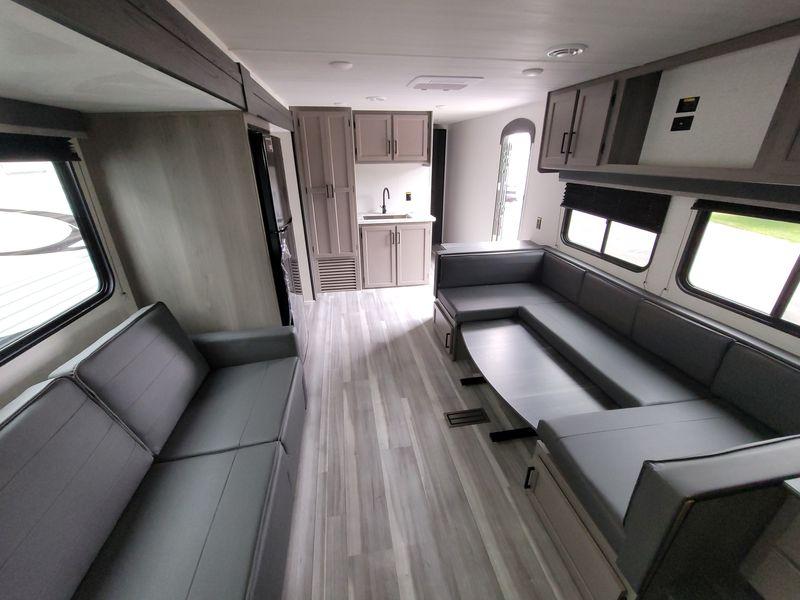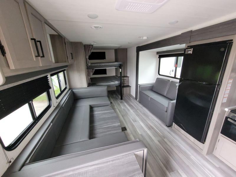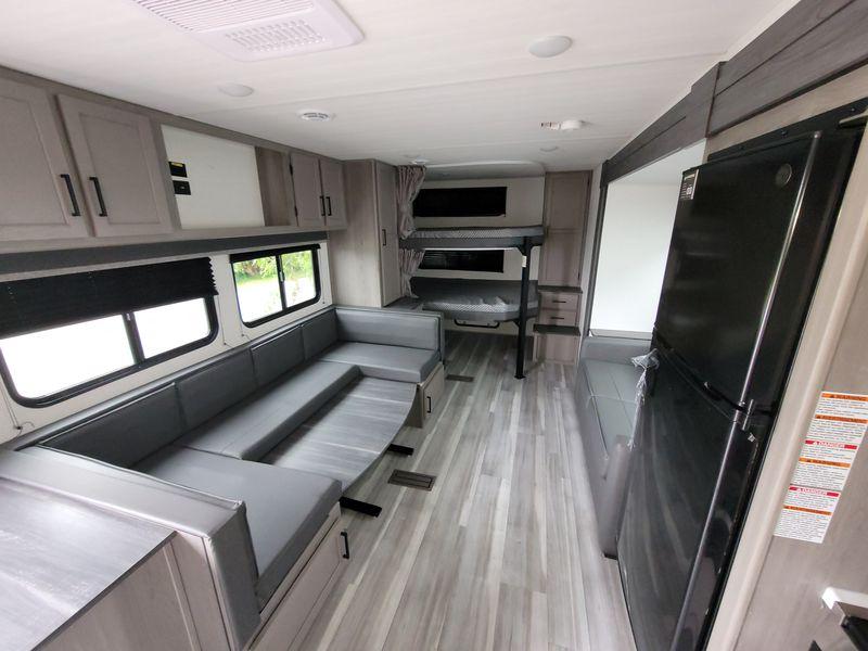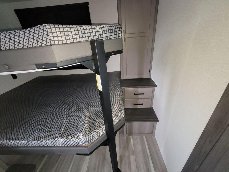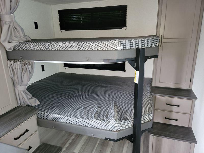 Check out this travel trailer with queen-size bunks in the back your guests are sure to love! There are also two sets of stairs and closets so they can easily climb into bed and store their belongings in their own space. The front private bedroom includes a walk-around queen bed, dual closets and dual nightstands, plus a convenient laundry chute that goes straight to the pass-through storage. And you'll find additional outdoor storage under the bunks in the back! Everyone can meet in the main living area each morning to dine around the U-shaped dinette or relax on the standard sofa. This sofa can also be switched out for an optional tri-fold sofa or optional theater seating, depending on your needs. The full kitchen includes a three burner cooktop, a spacious pantry, and a 10 cu. ft. 12V refrigerator for cold items. Start camping today!