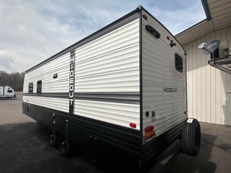 If you're looking for a travel trailer with a little more sleeping space, look no further than this Hideout Sport! There are double-size bunks with inside and outside storage, a walk-around queen bed in the front bedroom, plus a sofa and booth dinette for even more sleeping space. The kitchen comes with a two burner cooktop to cook meals on, a sink for clean up, and a 10 cu. ft. 12V refrigerator to store the milk and eggs. You will also find TV prep in this model if you enjoy movie nights while at the campground.
