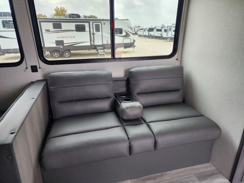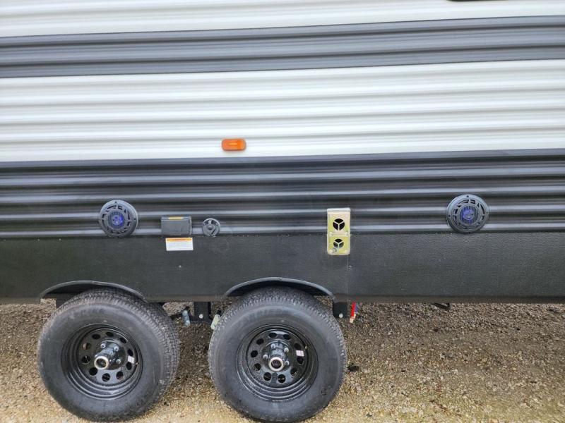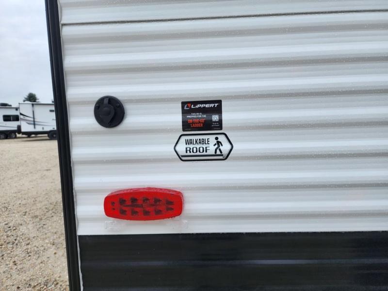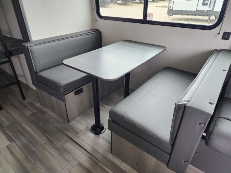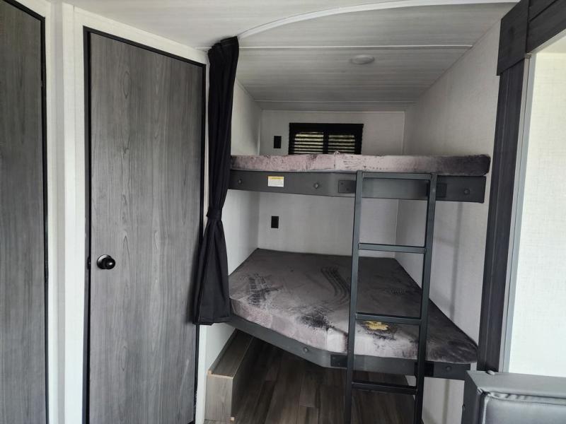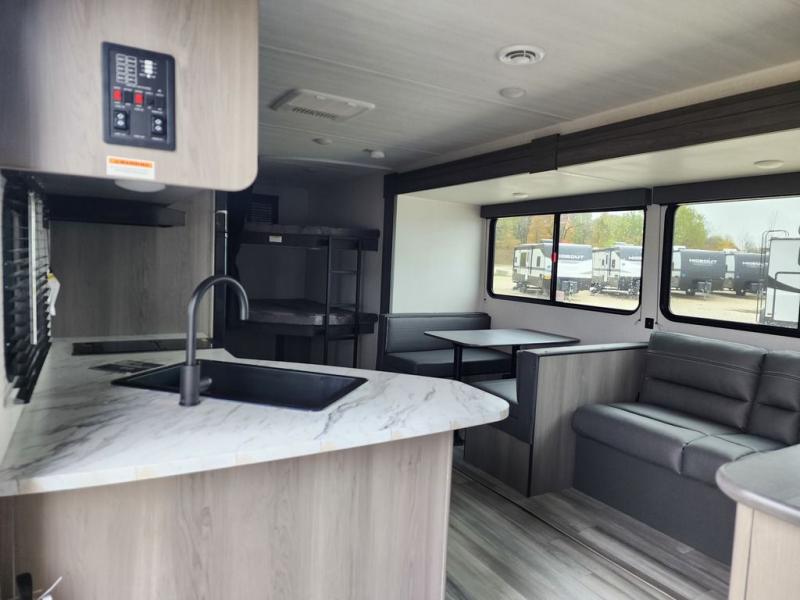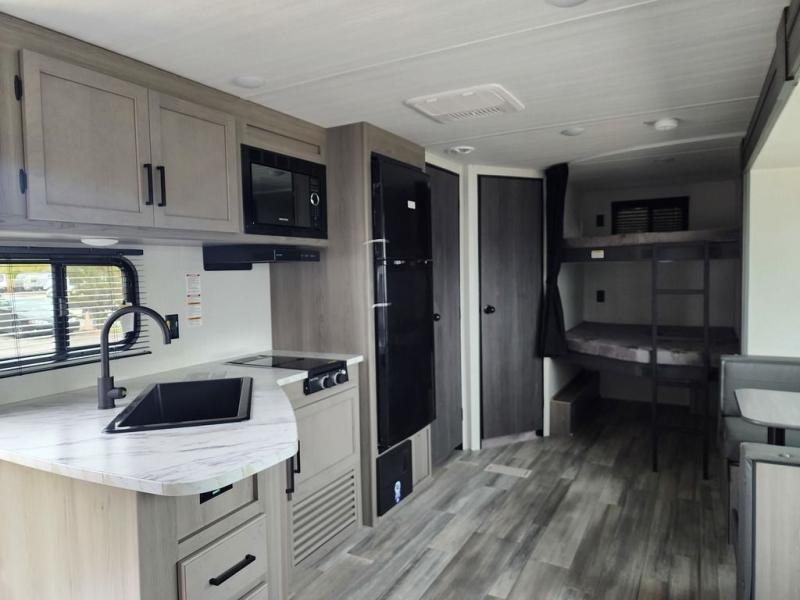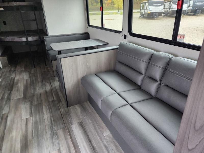 Pack your bags and head for the lake or woods in this spacious trailer! You can comfortably sleep nine to ten with the double-size bunks and the queen bed in the front private bedroom, plus the booth dinette and sofa in the main living area. There is even TV prep here if you want to add a television to the entertainment center for movie nights. The kitchen includes a 10 cu. ft. 12V refrigerator and an extra large pantry for food storage, plus a two burner cooktop to prepare meals each day. The full bath included will let you clean up after a day of exploring outdoors, and you'll find the second entry door here for convenience!