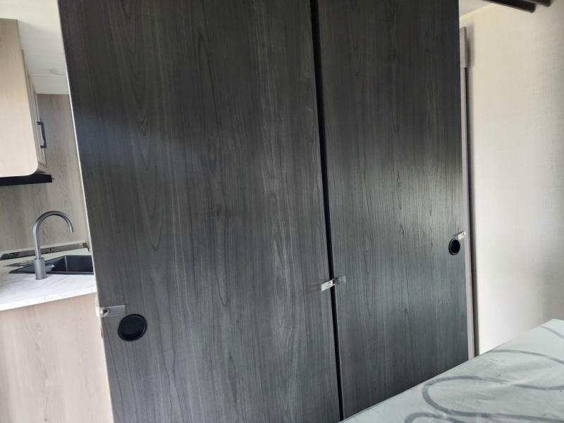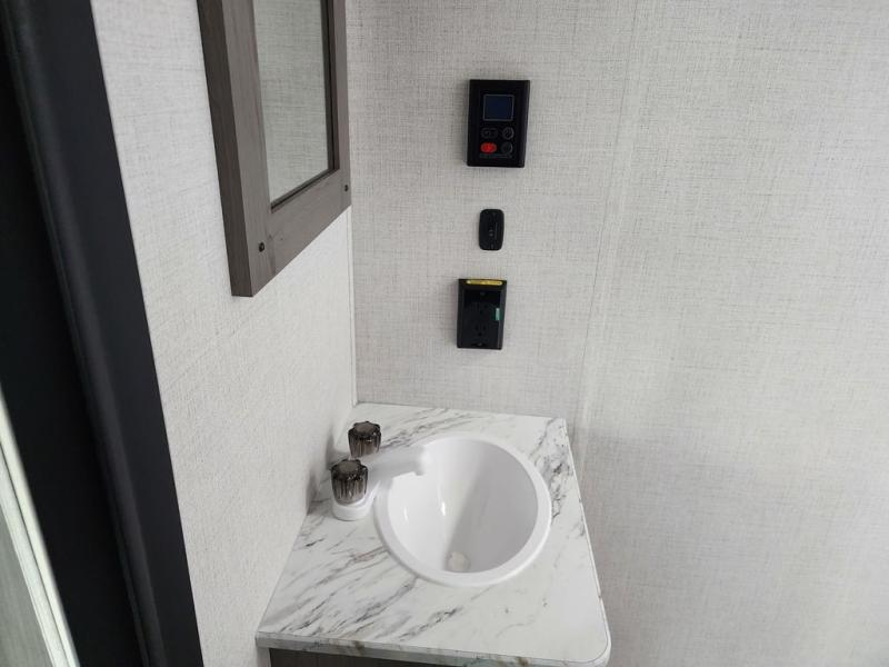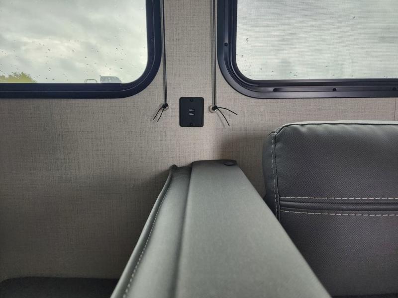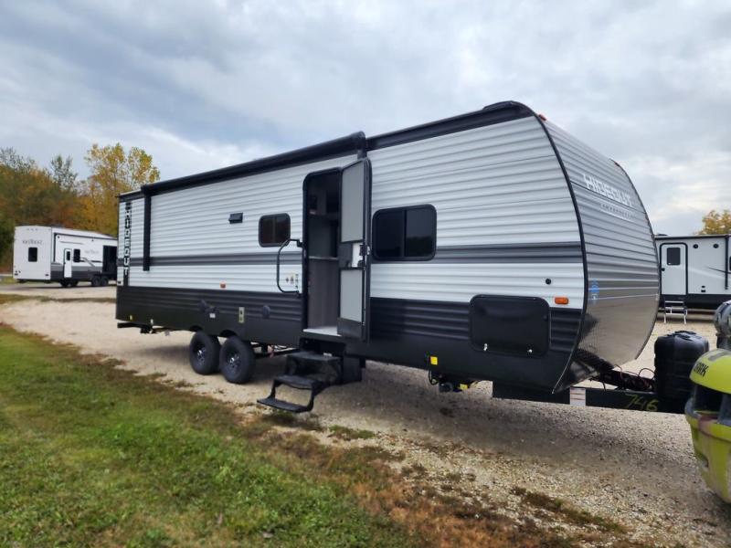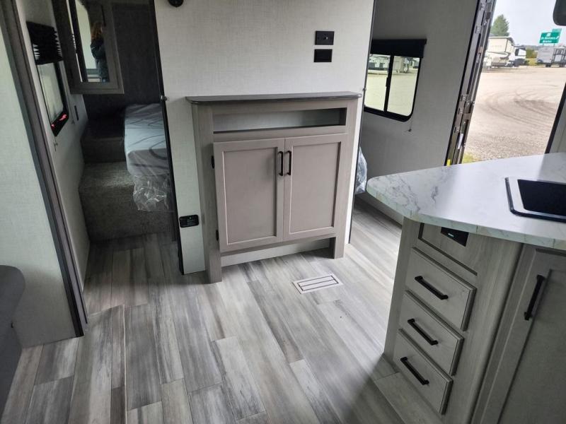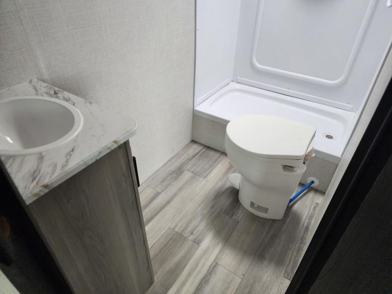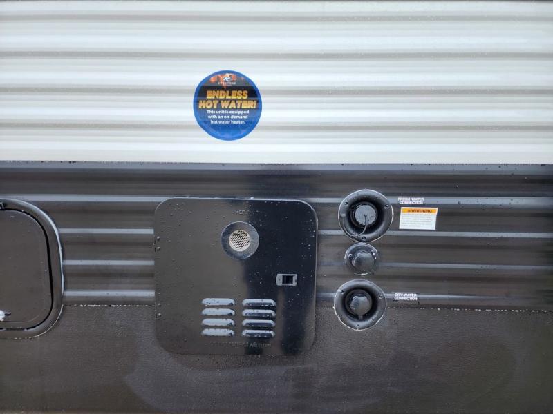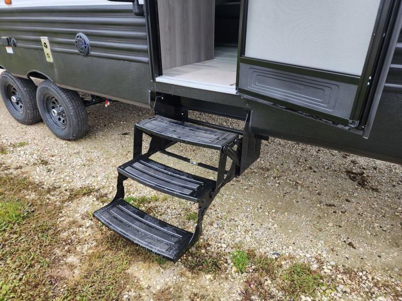 Pack your bags and head for the lake or woods in this spacious trailer! You can comfortably sleep nine to ten with the double-size bunks and the queen bed in the front private bedroom, plus the booth dinette and sofa in the main living area. There is even TV prep here if you want to add a television to the entertainment center for movie nights. The kitchen includes a 10 cu. ft. 12V refrigerator and an extra large pantry for food storage, plus a two burner cooktop to prepare meals each day. The full bath included will let you clean up after a day of exploring outdoors, and you'll find the second entry door here for convenience!