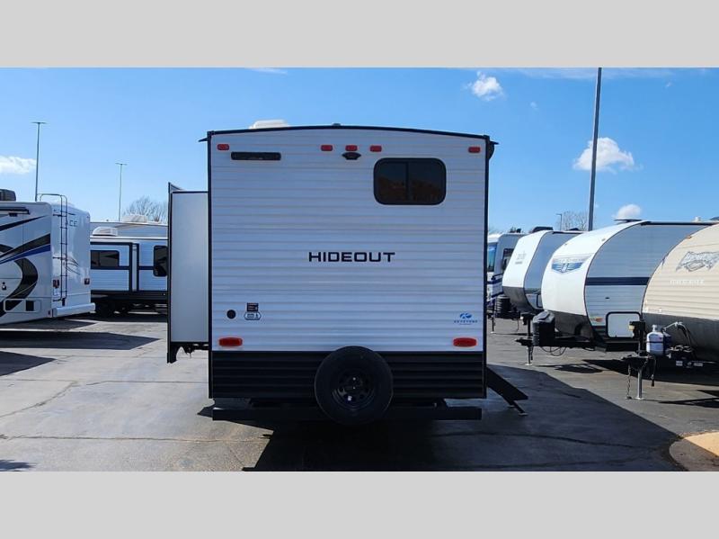 A large slide, front private bedroom, and double-size bunks make this Hideout Sport the ultimate travel trailer! You will enjoy a walk-around queen bed in the bedroom plus dual closets and nightstands for your things. The full bath is towards the back and beside the bunks for easy nighttime use, and there is outside storage under the bunks for your gear. Head to the kitchen to prepare lunch on the two burner cooktop, then dine at the booth dinette and sofa within the large slide. If the weather is nice, you might just want to take your plate outdoors to sit under the power awning!