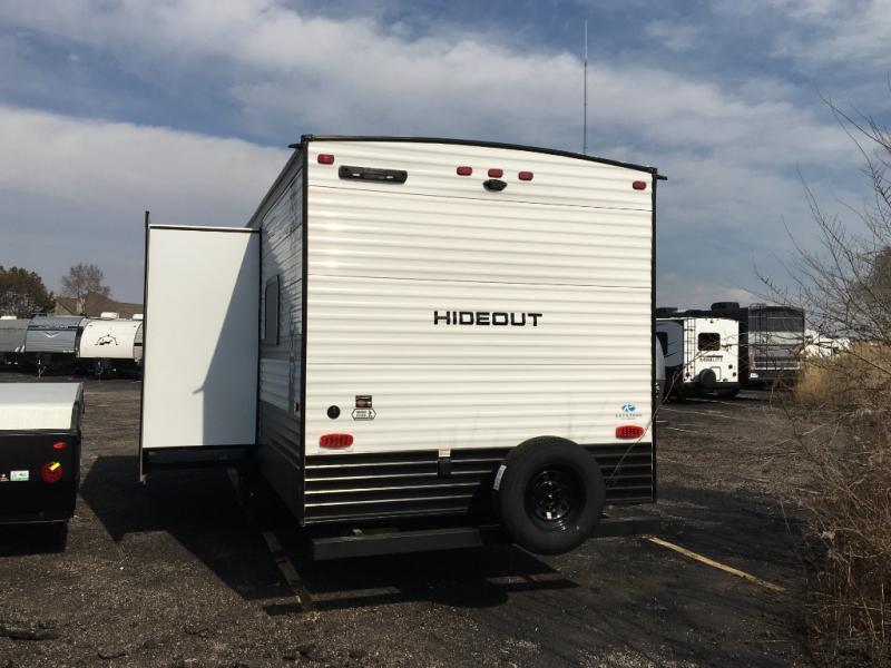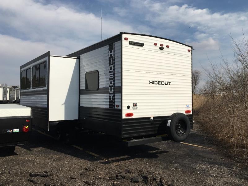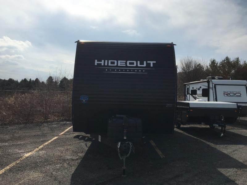 With any Hideout Sport travel trailer by Keystone you will enjoy simplified camping solutions that won't break the bank! Each model is constructed with a durable aluminum exterior, tinted safety glass windows, a walkable roof, and an I-beam frame. There are power tongue jacks and electric stabilizer jacks that will make it easier than ever to hitch up and go, and you can add the optional spare tire kit in case you have any unfortunate flats on the way to the campground. An XL entry assist handle will also provide convenience, along with a power awning that will provide much wanted shade during the day. You will feel right at home in a Hideout Sport with its stylish decor, blackout night shades, and cozy queen bed with storage underneath!