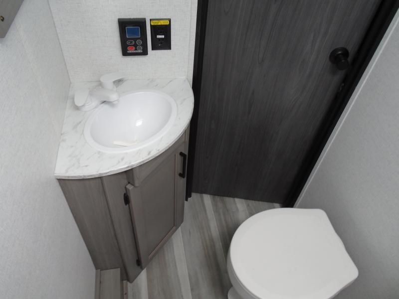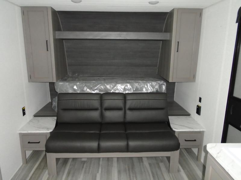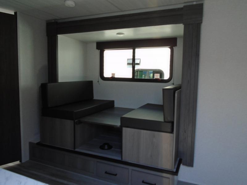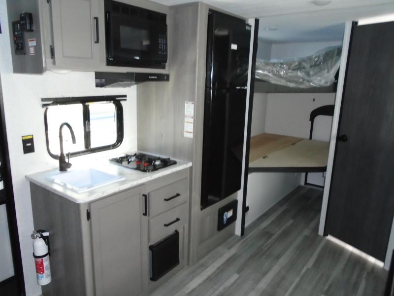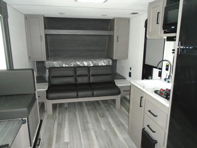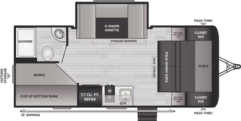 You will love how versatile this travel trailer is with its front Murphy bed that has a queen bed to lay your head on at night, folds down into a sofa, and even has shoe storage underneath it! There is a set of double bunk beds in the rear corner and a U-shaped dinette slide with storage drawers to keep your games out of the way. There is also outside storage under the bunks where you can easily flip up the bottom bunk to unload everything! You can keep everyone well fed with the two burner cooktop and 7.7 cu. ft. refrigerator, and the 15' power awning outdoors will provide a place for you all to visit after dinner.