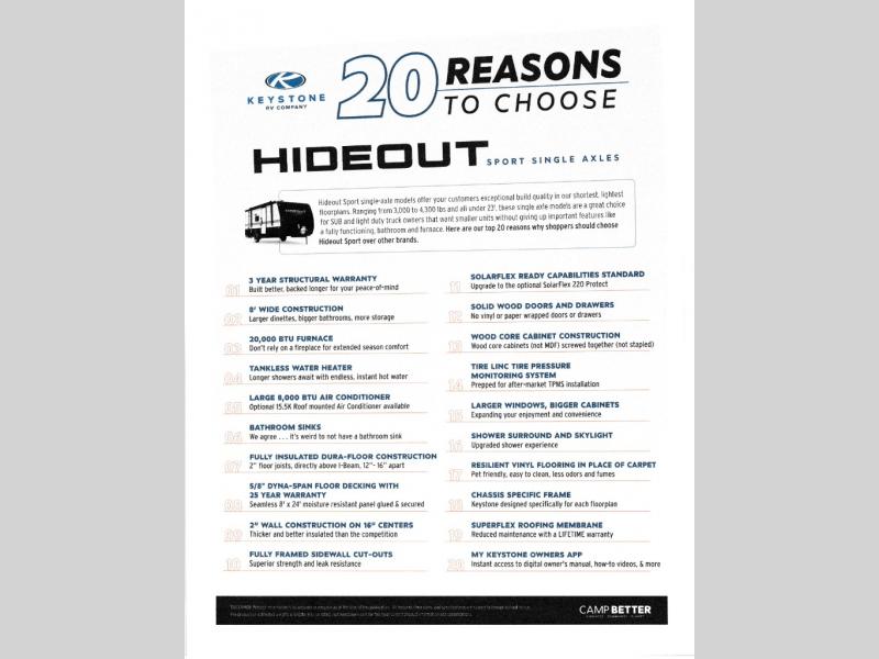 Open your horizons with the Hideout Sport Single Axle travel trailers by Keystone. They are compact, convenient, and lightweight; everything you're looking for in an RV! Each model features an aluminum exterior, tinted safety glass windows, and an I-beam frame with stamped steel cross-members and outriggers for added support. The interior includes blackout night shades for added privacy and real wood doors and drawers that will give a more at-home touch. The Girard tankless water heater is a feature you won't want to camp without, and the LED lighting will keep your space bright and open!