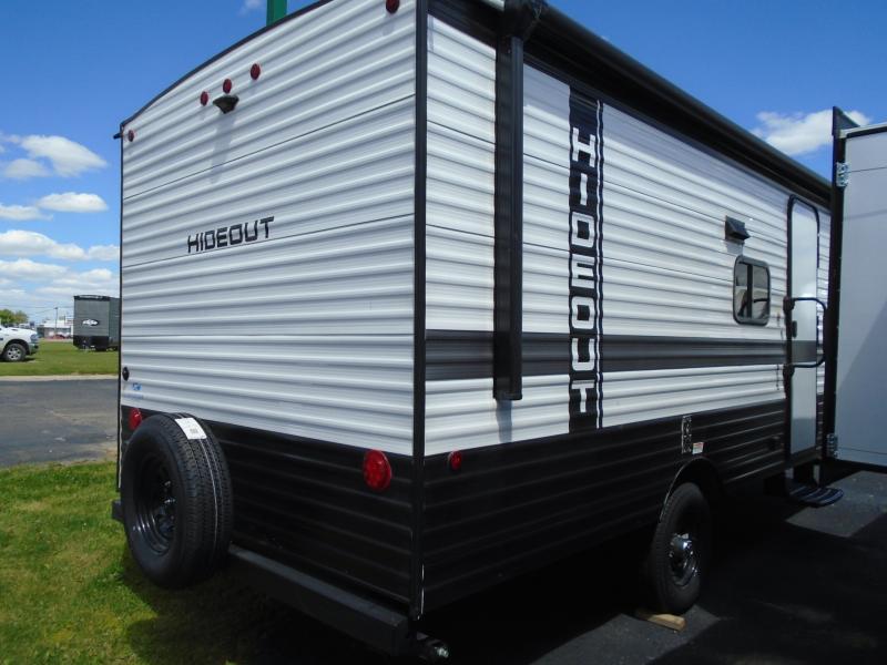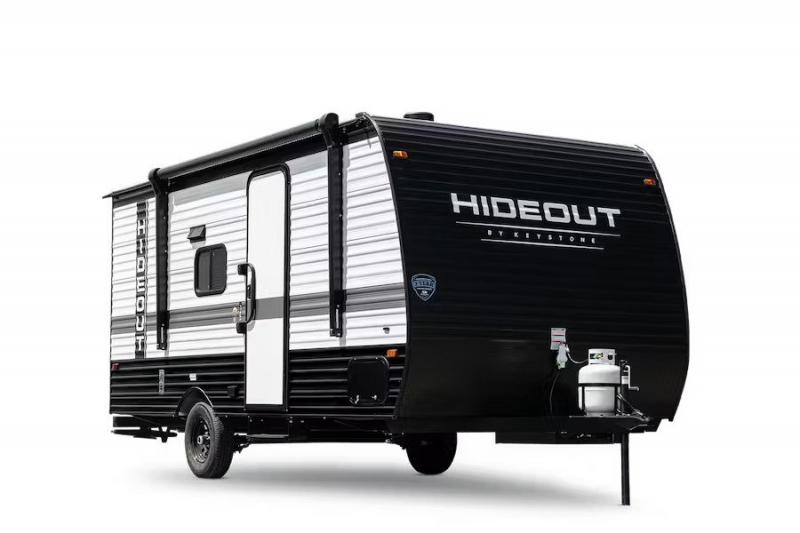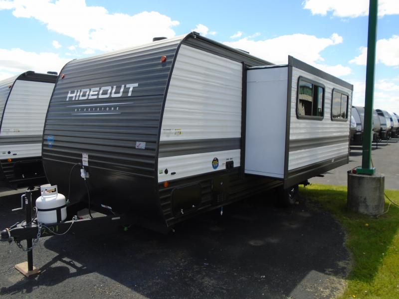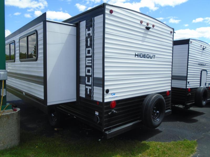 Open your horizons with the Hideout Sport Single Axle travel trailers by Keystone. They are compact, convenient, and lightweight; everything you're looking for in an RV! Each model features an aluminum exterior, tinted safety glass windows, and an I-beam frame with stamped steel cross-members and outriggers for added support. The interior includes blackout night shades for added privacy and real wood doors and drawers that will give a more at-home touch. The Girard tankless water heater is a feature you won't want to camp without, and the LED lighting will keep your space bright and open!