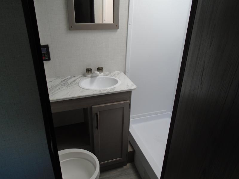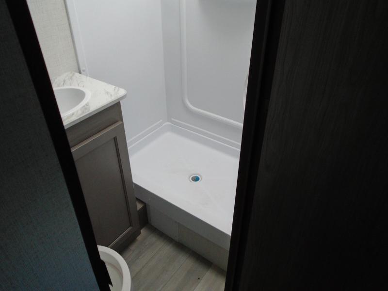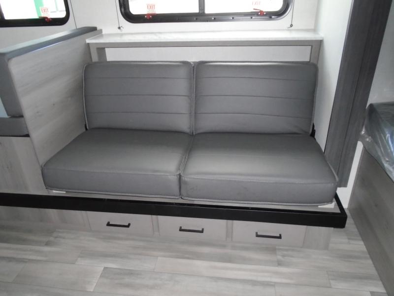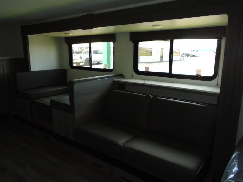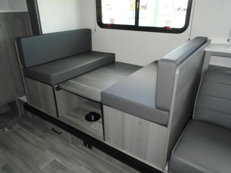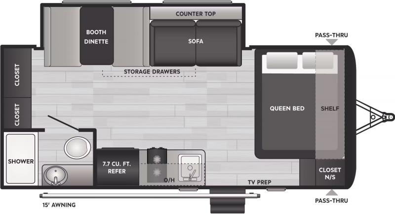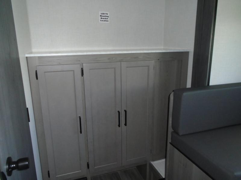Head to the lake in this spacious trailer that can sleep five to six each night. There is a front queen bed for you, plus a sofa and booth dinette within the large slide out that doubles as seating and sleeping space. You will also find storage drawers below, and there is a pantry and closet along the rear wall for all your goodies and such. The cook will love the galley kitchen with a two burner cooktop and a 7.7 cu. ft. refrigerator for food storage. The TV prep means you can bring along your television for movie nights, and the countertop behind the sofa provides more space for belongings!