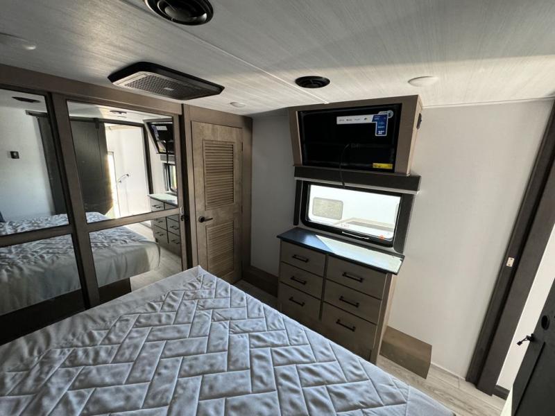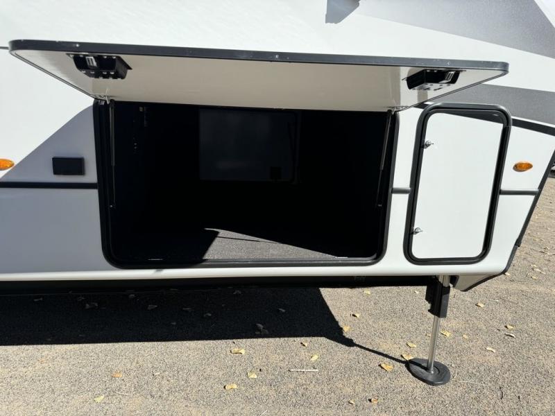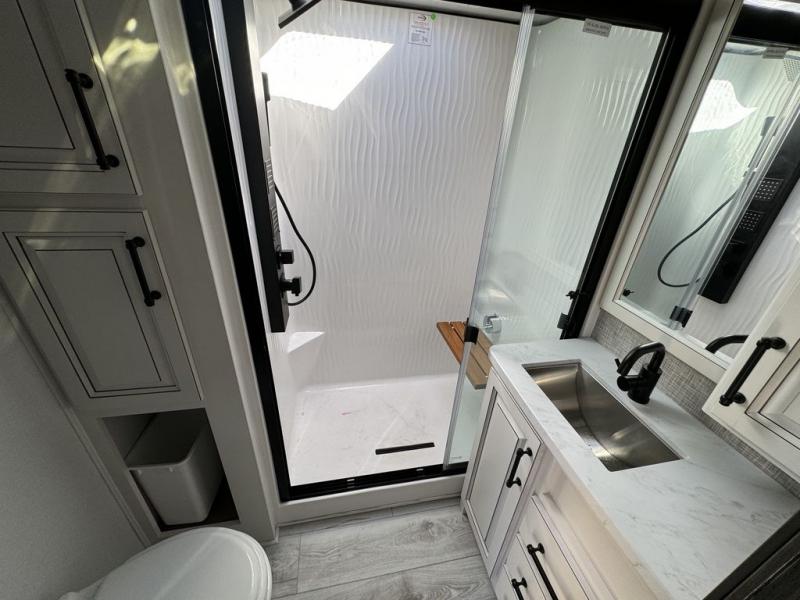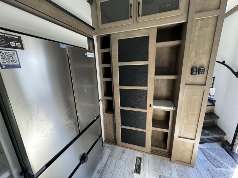 Luxury abounds throughout this fifth wheel starting in the centrally located kitchen featuring an L-shaped counter, a large floor to ceiling pantry with sliding glass doors, a 24" range with an overhead convection microwave, and an 18 cu. ft. residential refrigerator with ice an maker. Just up the steps to the right of the entry, you will find a spacious bathroom featuring a 48" x 30" fiberglass shower with a seat, decorative glass enclosure, linen cabinet, and skylight above it for more natural lighting. Sleep like a baby in the front private bedroom on the king bed slide with storage underneath, and keep your clothes looking their best with the front closet that has a clothing hamper and stackable washer/dryer prep. The rear entertainment living area offers true relaxation with L-shaped seating including a hide-a-bed sofa along the roadside, and powered theater seating facing the entertainment center with a 5,000 BTU decorative fireplace heater and Smart TV to watch your favorite movies!