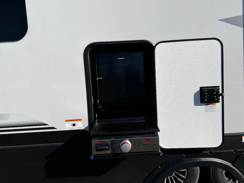 This couples coach will have you excited about traveling to all of your favorite places, and new locations too! The triple slide unit features an open concept living/dining area with dual opposing slides at the very back featuring a hide-a-bed sofa along the curbside, and a dining space opposite with a booth dinette or choose the optional table and four chairs. Power theater seats will be a comfortable place to kick back for a movie, and you will love the all-new entertainment center design featuring a fireplace, Smart TV, and overhead cabinets. In the evening, head up to your private retreat with a spacious bath including dual entry doors from the hall at the top of the stairs or from within the private bedroom. Get cleaned up in the large radius shower with seat and snuggle up in a king bed slide. The bedroom slide also features a large wardrobe that has been prepped for a washer/dryer if you choose to add the convenience. You will find plenty more storage spaces for your clothing and belongings in the two dressers or dual wardrobes along the full front wall. Another bonus with this unit is the outdoor kitchen which gives you a choice to cook inside or out!