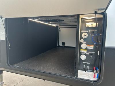 Just one look at this Montana High Country fifth wheel will impress you! There is an extra middle room that can be used for many different purposes, like an office, a guest bedroom, a craft room, or a hangout room. The hide-a-bed sofa sits on a slide for more space in this room, and there is a desk that can be used to get some work done. Above this room is a loft, so you have even more sleeping space. You also have a hide-a-bed sofa in the living area, and the king-size bed in the front private bedroom has storage underneath. The power theater seating sits across from the fireplace and 50" LCD TV for nighttime entertainment, and the kitchen island has a countertop extension for more prep space.