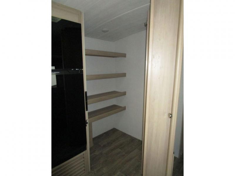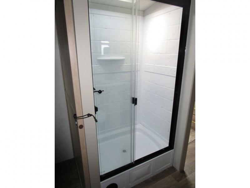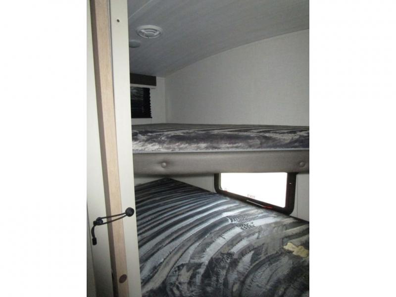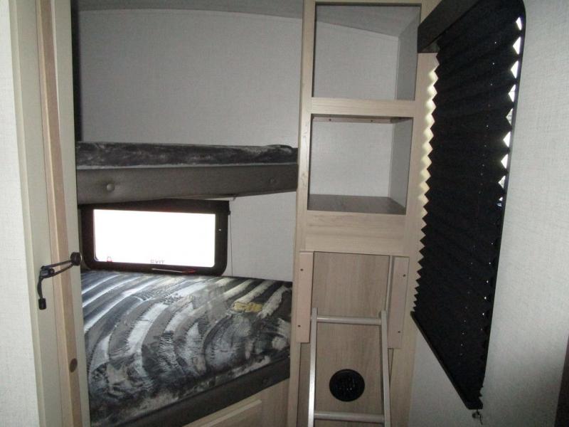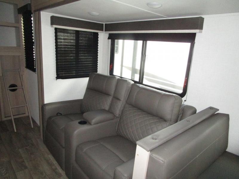 Get out and explore, hike, and camp in comfort! This trailer offers a private bunkhouse with double-size bunks and a wardrobe, a private front bedroom with a walk-around queen bed with a built-in pet kennel storage for your family's best friend, a laundry chute to keep everything tidy, and dual wardrobes for your clothing. You can access the walk-through bathroom from the bedroom and the main living and kitchen area through barn slider doors. Your guests can sleep on the sofa sleeper and booth dinette slide out while watching the 40" TV within the entertainment center after grabbing some snacks from the hidden pantry. There are full kitchen amenities inside, plus there is an outside kitchen to use, a 21' awning offers protection from the elements, and a pass-through storage to carry your larger gear like fishing poles, an outdoor table, and camping chairs.