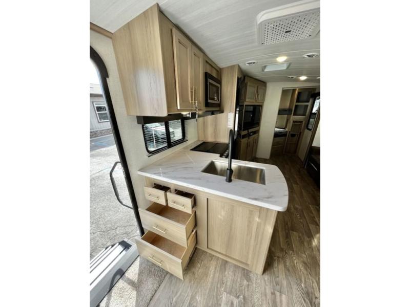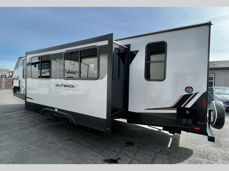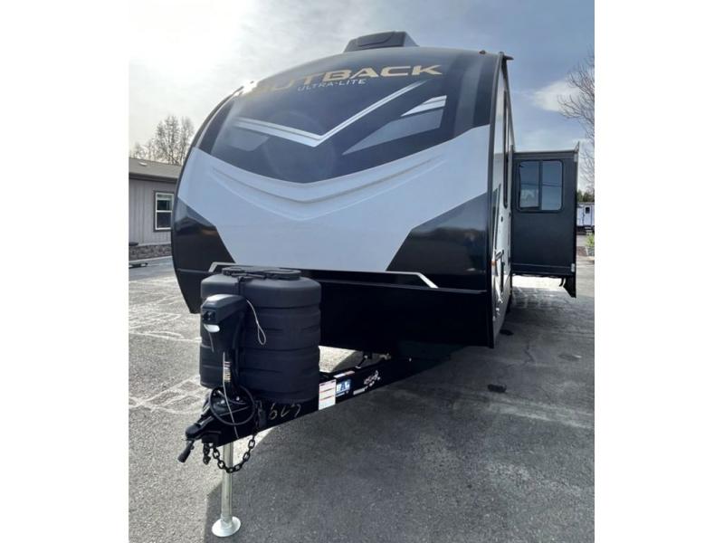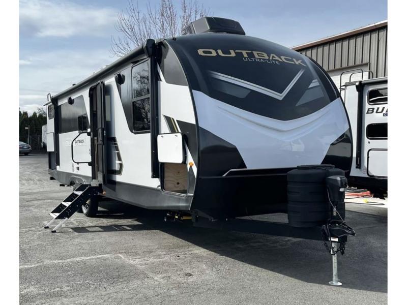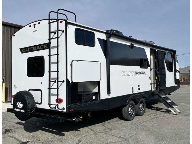 With any Outback Ultra Lite travel trailer or toy hauler by Keystone, you begin with a BAL Norco huck bolted "Z" channel frame, which is one of the most durable lightweight frames in the industry. There is also a pinch rolled laminated gel-coated fiberglass exterior, a leaf spring suspension system, large panoramic black framed tinted safety glass windows, plus a power tongue jack and LCI power stabilizing jacks for easy setup. You will appreciate the SolarFlex Protect 200 that comes standard, or you can choose the optional SolarFlex Discover 400i for even more off-grid capabilities! The interior offers pre-drilled and screwed hand-glazed modern cabinetry, extra tall slide height for maximum space, in-floor heating ducts, a Dream dinette with max-store for more storage space, and an on-demand hot water heater to mention a few highlights. Make your lightweight towing decision today, choose a comfortable and stylish Outback Ultra Lite today!