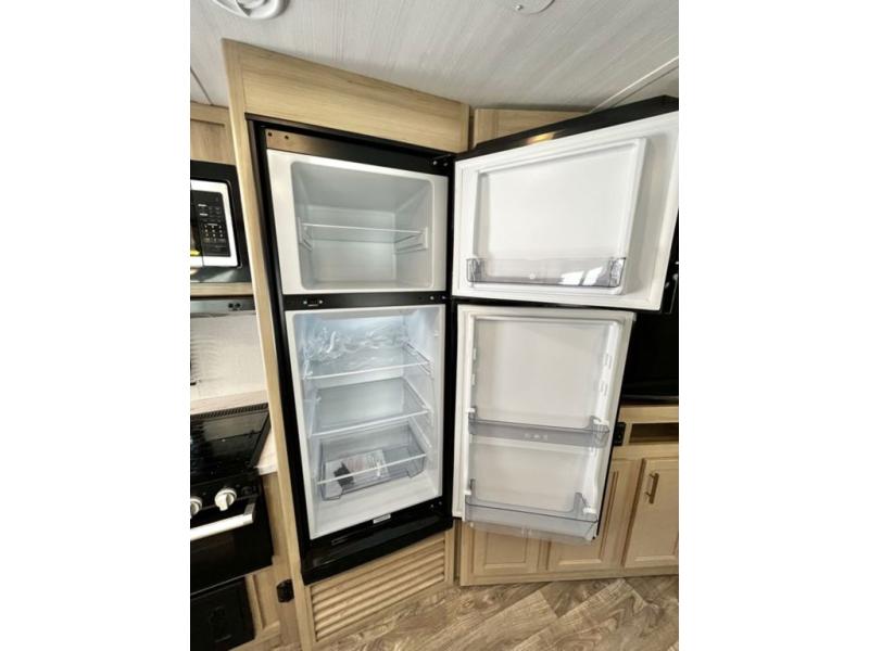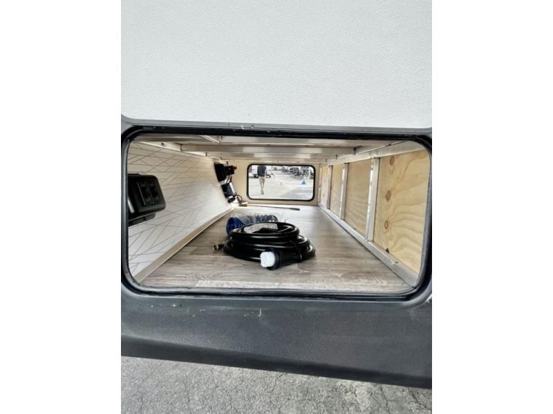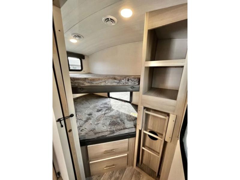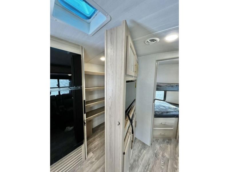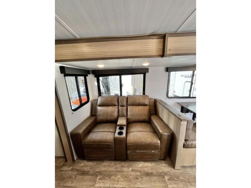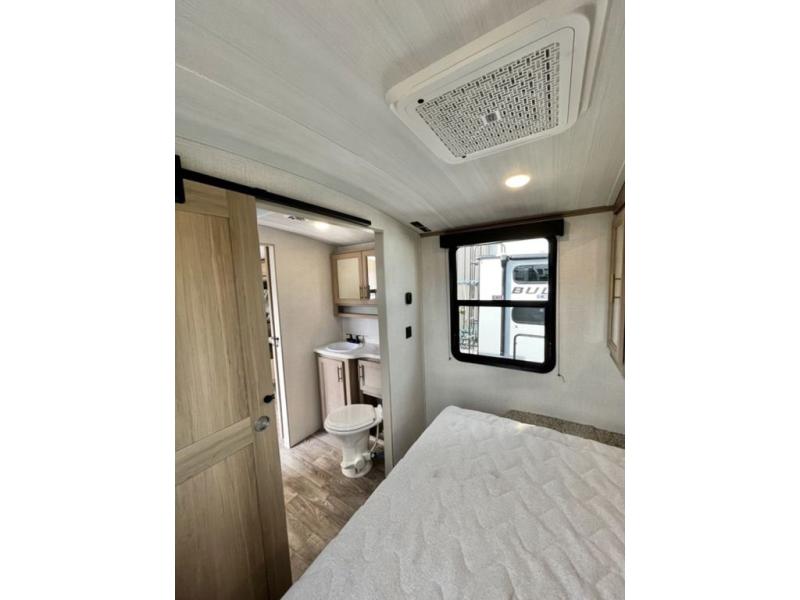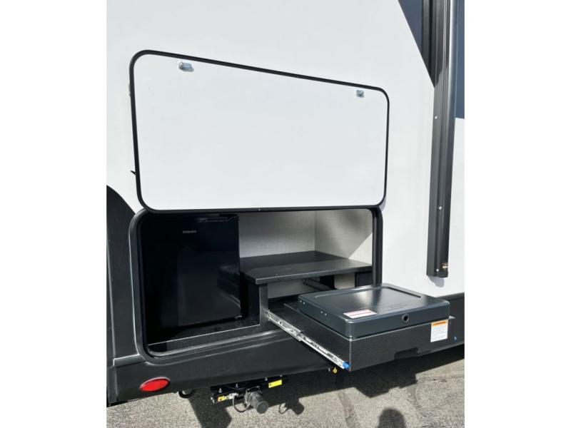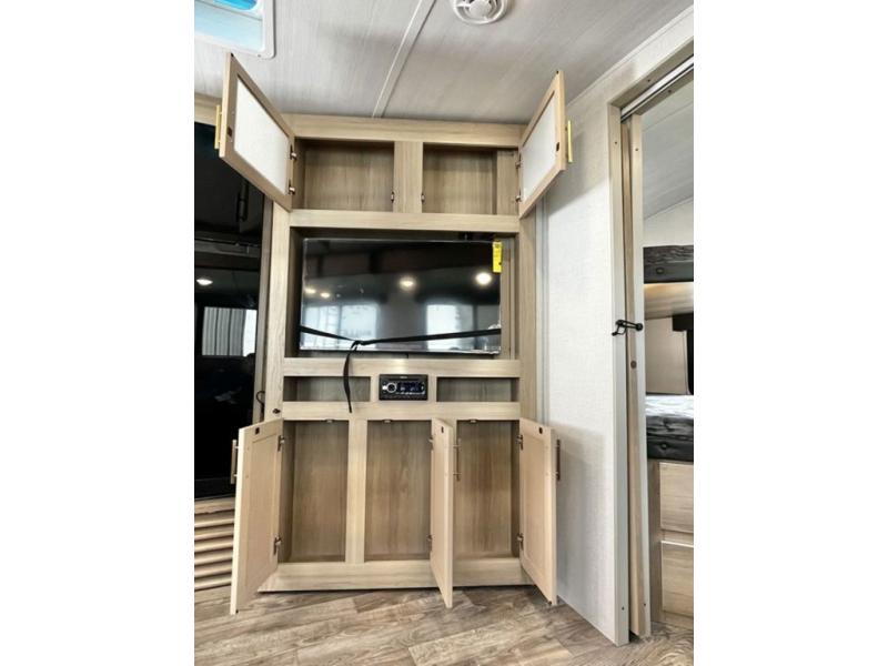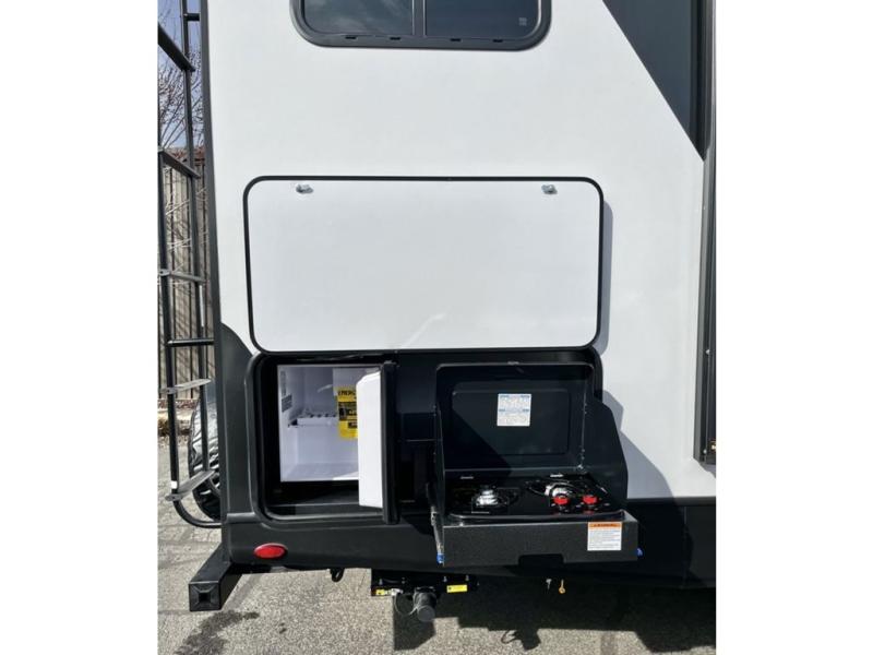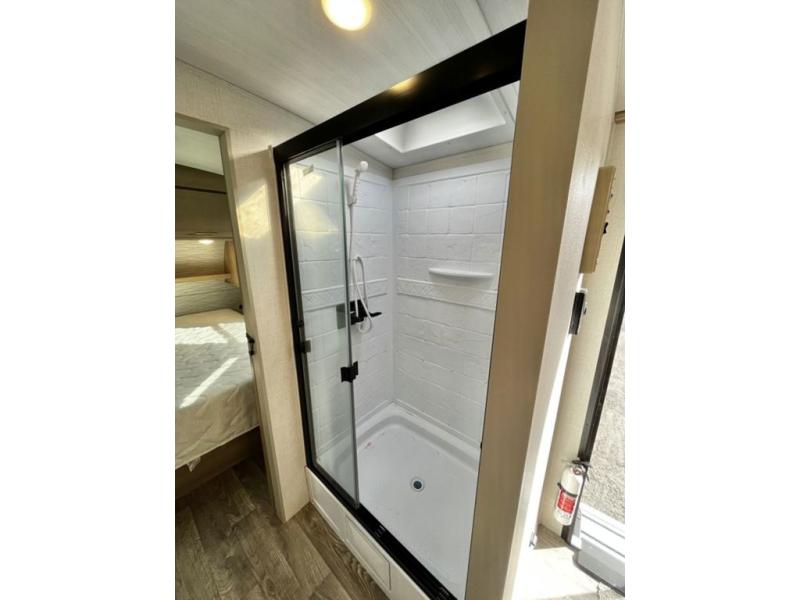Get out and explore, hike, and camp in comfort! This trailer offers a private bunkhouse with double-size bunks and a wardrobe, a private front bedroom with a walk-around queen bed with a built-in pet kennel storage for your family's best friend, a laundry chute to keep everything tidy, and dual wardrobes for your clothing. You can access the walk-through bathroom from the bedroom and the main living and kitchen area through barn slider doors. Your guests can sleep on the sofa sleeper and booth dinette slide out while watching the 40" TV within the entertainment center after grabbing some snacks from the hidden pantry. There are full kitchen amenities inside, plus there is an outside kitchen to use, a 21' awning offers protection from the elements, and a pass-through storage to carry your larger gear like fishing poles, an outdoor table, and camping chairs.