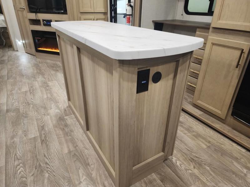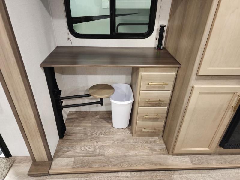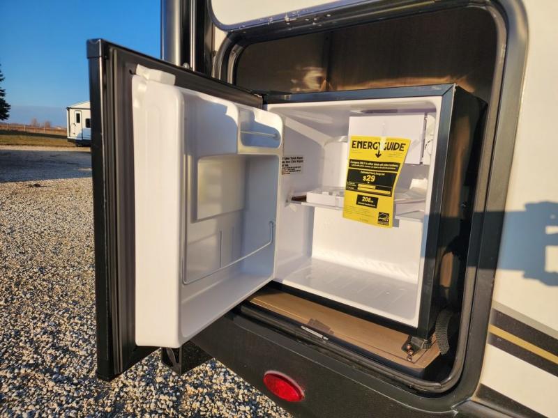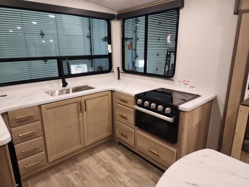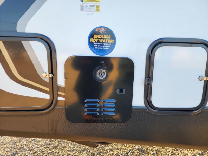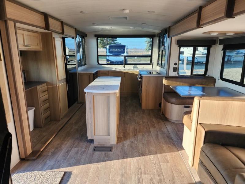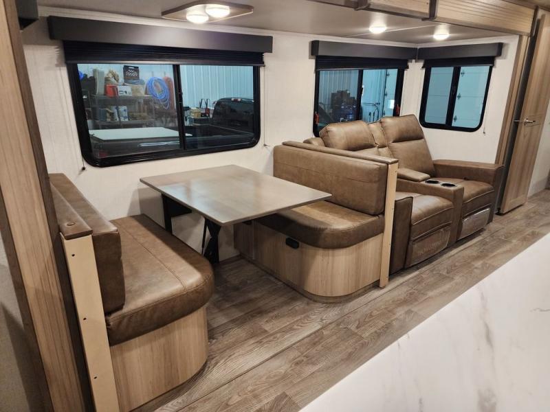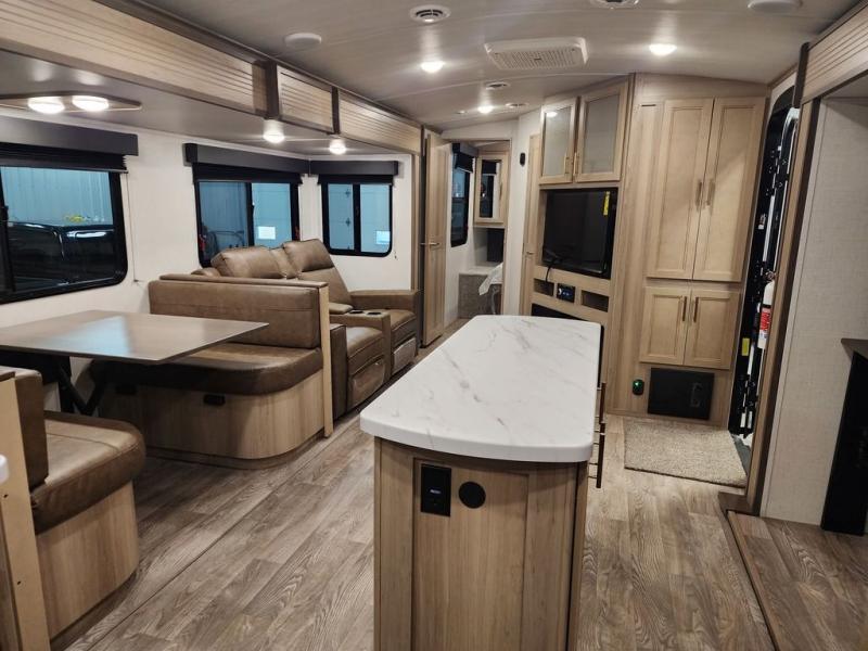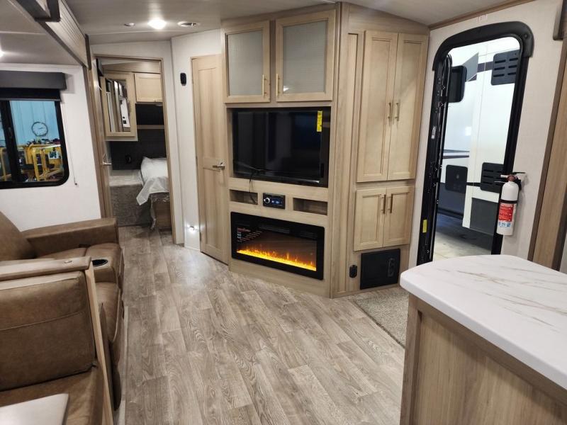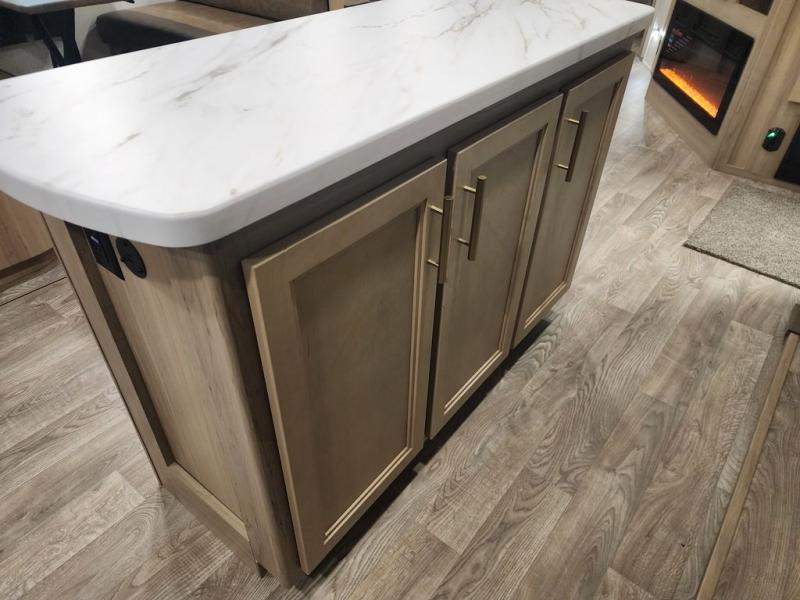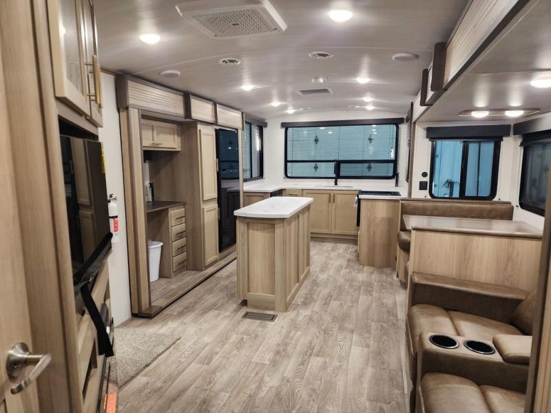 There is so much to love about this spacious travel trailer, you may just want to take it out every weekend! The dual opposing slides in the main living area provide your crew with ample space to move about, and the kitchen island brings the room together. Speaking of the kitchen, you'll love the wrap-around counter space here, along with a three burner gas range with a 17" Furrion stove, and a 10 cu. ft. 12V refrigerator. The booth dinette and sofa sleeper offer a place to sit and sleep, or you can choose the optional table and chairs in place of the dinette or the optional theater seating in place of the sofa to make this a couple's coach. This model also includes a desk so you can get some work done while you're away from home, and the 36" fireplace is sure to make it feel more cozy!