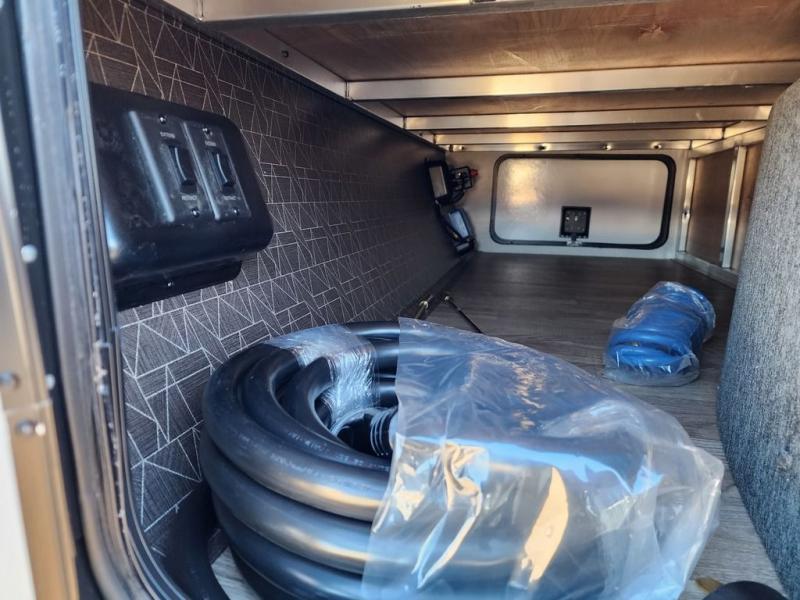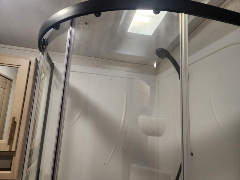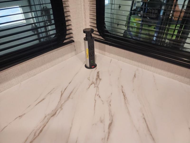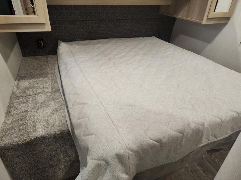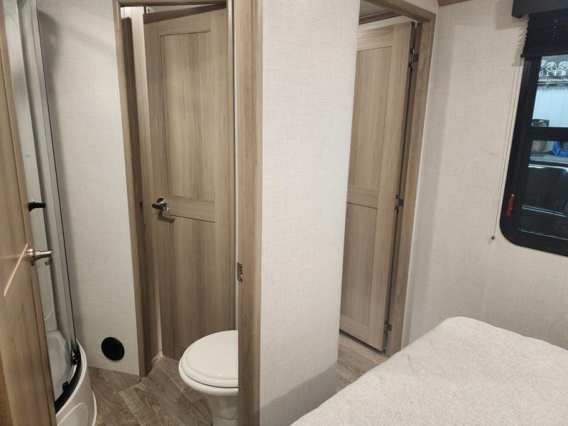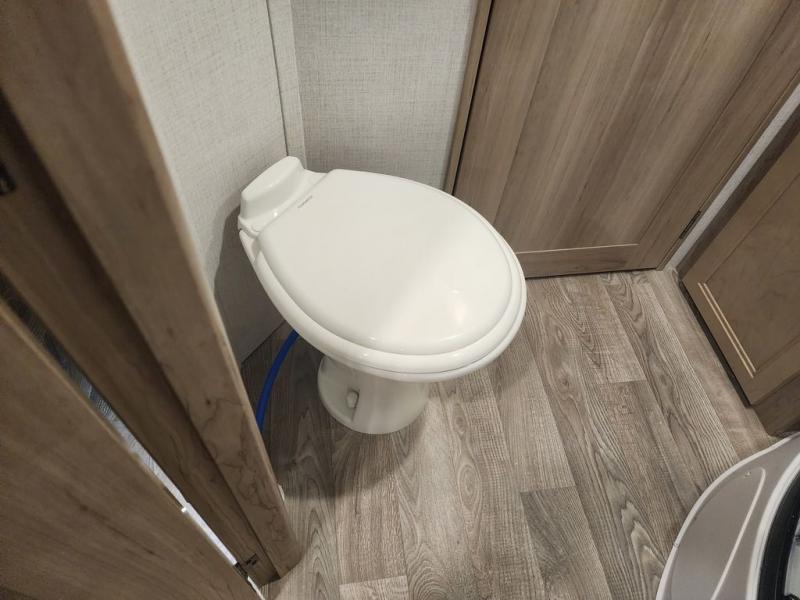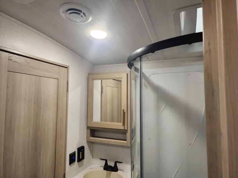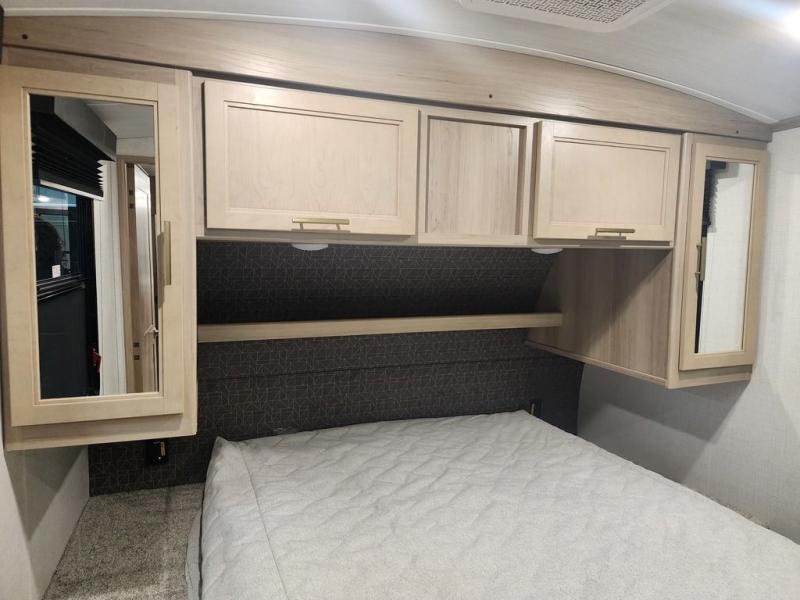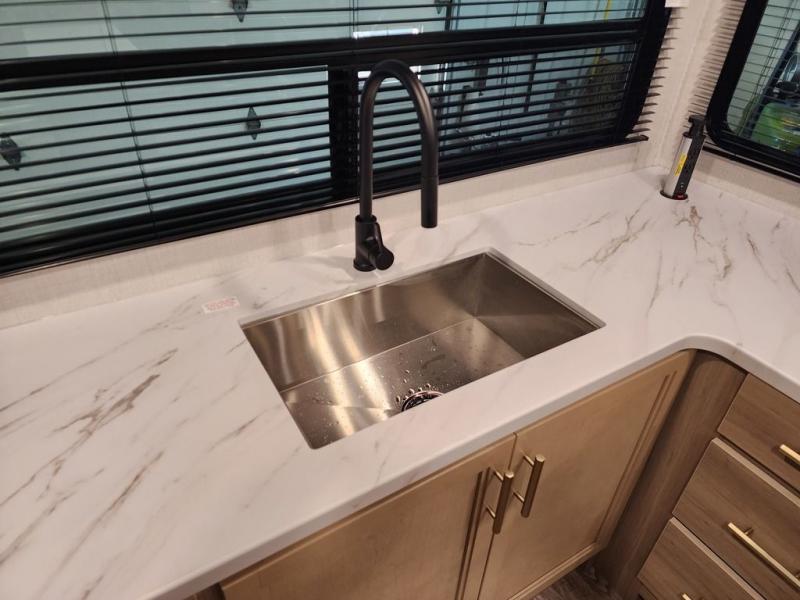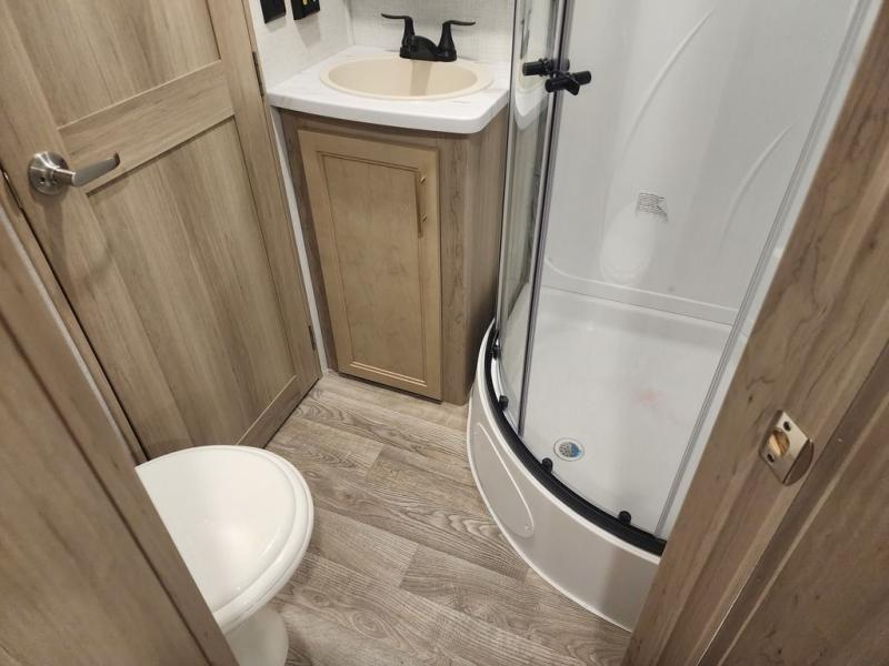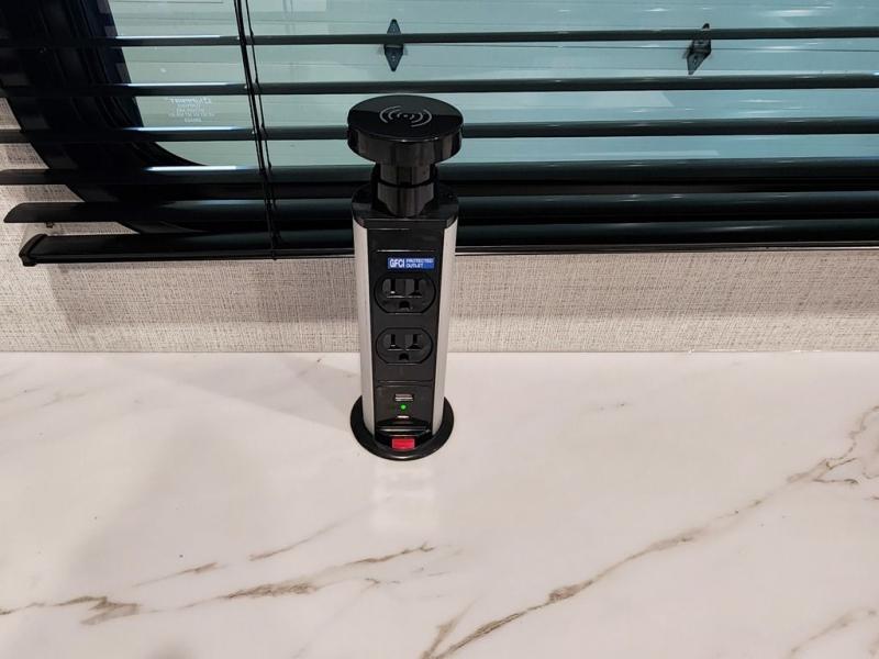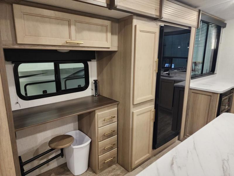 There is so much to love about this spacious travel trailer, you may just want to take it out every weekend! The dual opposing slides in the main living area provide your crew with ample space to move about, and the kitchen island brings the room together. Speaking of the kitchen, you'll love the wrap-around counter space here, along with a three burner gas range with a 17" Furrion stove, and a 10 cu. ft. 12V refrigerator. The booth dinette and sofa sleeper offer a place to sit and sleep, or you can choose the optional table and chairs in place of the dinette or the optional theater seating in place of the sofa to make this a couple's coach. This model also includes a desk so you can get some work done while you're away from home, and the 36" fireplace is sure to make it feel more cozy!