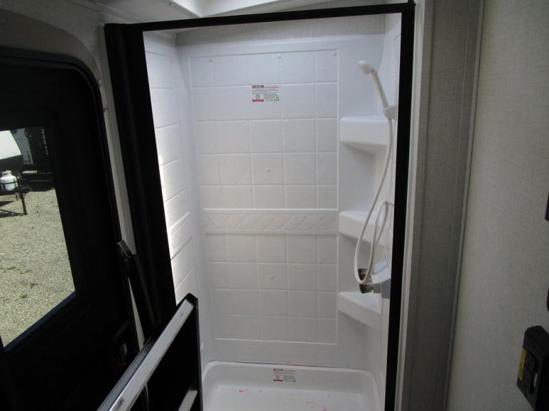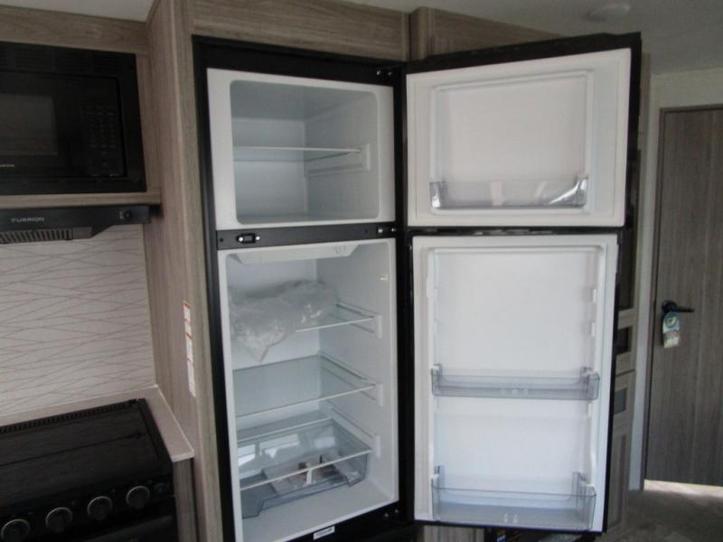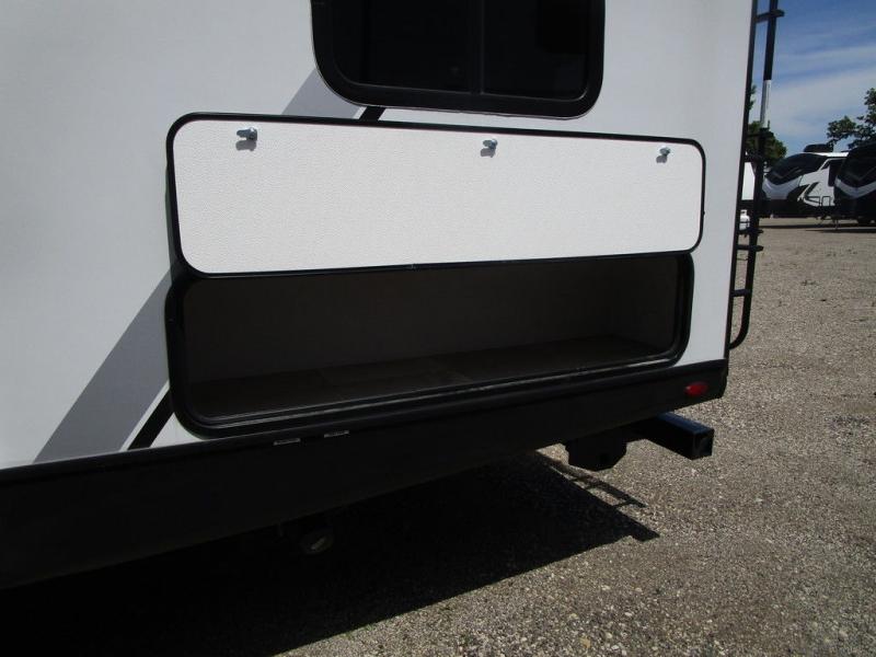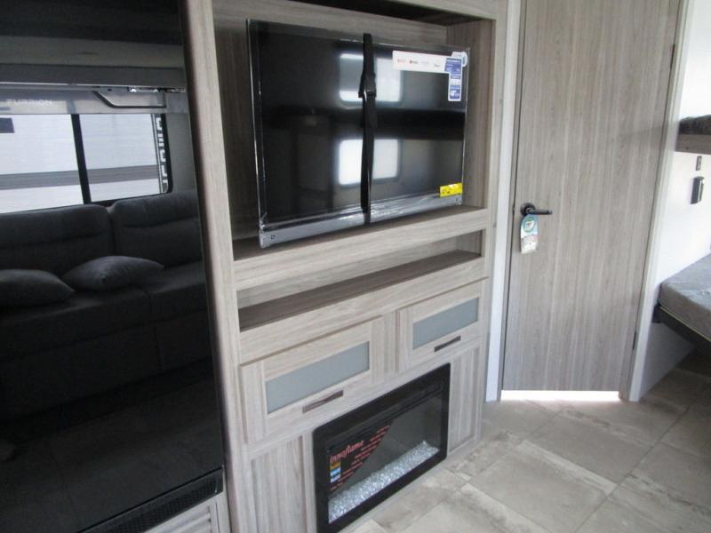 This travel trailer has space for the whole family! The rear corner bathroom has a shower with a skylight above to rinse the sand out of your hair and one of the dual entry doors to the unit so you can get back to having fun outside. The front private bedroom has a queen bed for a good night's rest with wardrobes on either side of it. The kiddos can sleep on the set of 51" x 74" double bunk beds with one of them being a flip-up bunk for added storage. After a fun day outdoors, you can relax on the 68" tri-fold sofa or switch it out for the optional luxury cinema recliners across from the entertainment center with a fireplace or you can play a game or two at the dream dinette which can also be switched out for the optional free standing dinette. The chef will have an easy time preparing meals either indoors with the fully equipped kitchen or at the outside kitchen with a griddle, a mini refrigerator, and even a shelf all of which is protected by the 21' power awning!