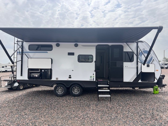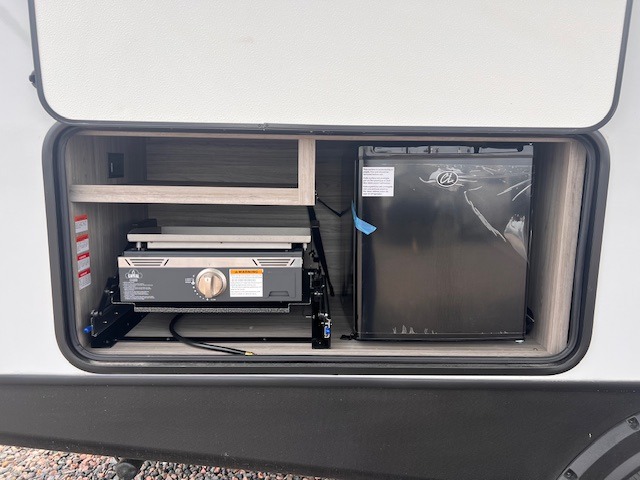 Trips to the lake with a larger group are made easy in this spacious travel trailer! The double-size bunks include a flip-up bunk for added storage, and there is a rear cargo door here so you can easily load gear from outside. The full bath is conveniently located right by the bunks for easy nighttime use, and the pantry is also close by if anyone needs a midnight snack! You will sleep like a baby in the front bedroom that includes a queen bed and dual wardrobes to keep your clothes tidy. In the morning, everyone can meet in the combined living area and kitchen while the chef makes breakfast on the three burner cooktop, and there is a U-shaped do-more dinette table to dine at. If the weather is nice, the chef just may want to cook on the outside kitchen, and everyone can sit at the picnic table under the 15' awning!